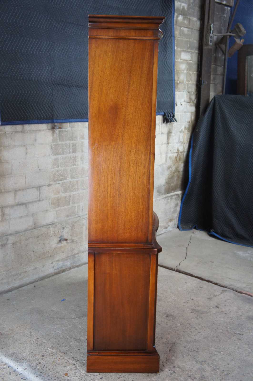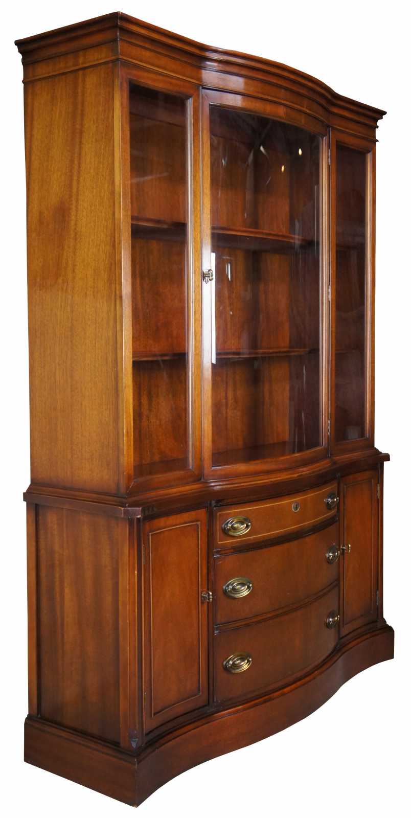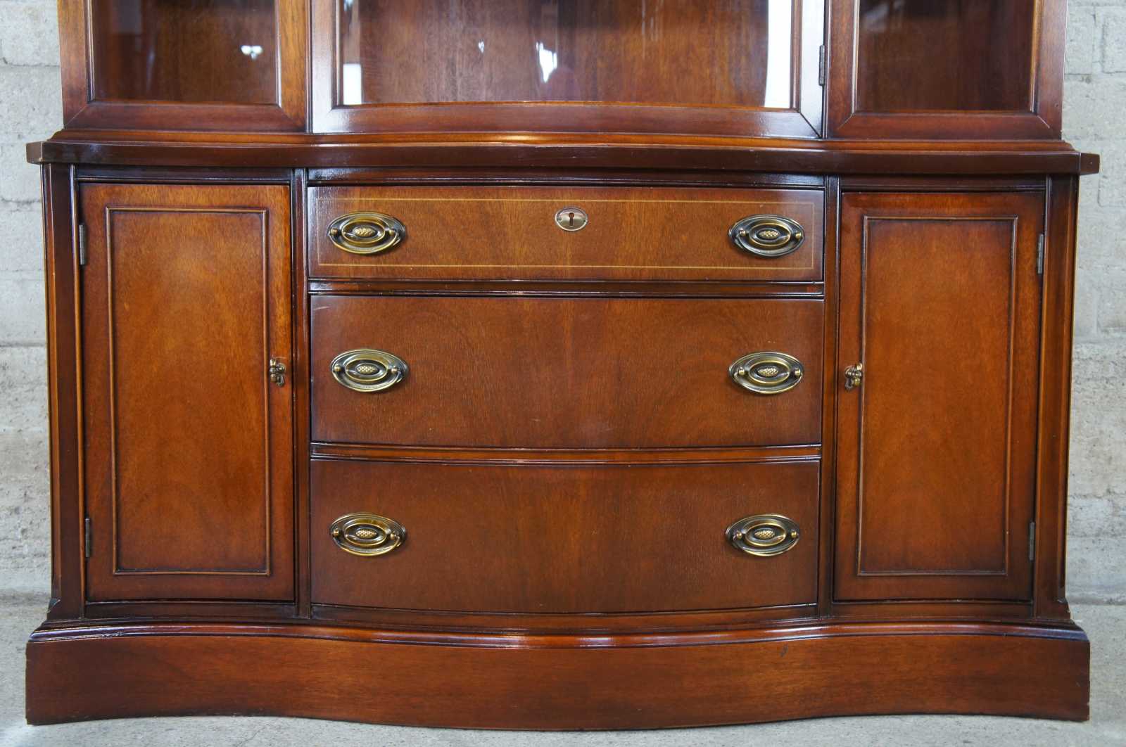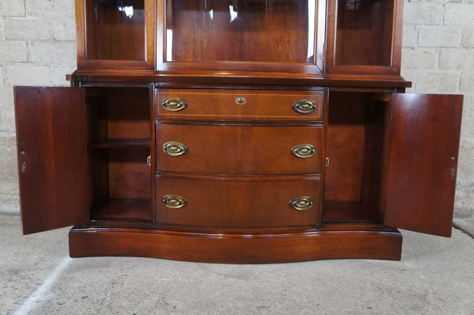 Vintage mid-century bow front china cabinet, made by Bassett Furniture in the 1950s as part of their Monticello collection. Featuring richly-hued mahogany and a curved glass door which matches the curved drawer fronts. This piece was constructed with quality in mind, and features plenty of storage.