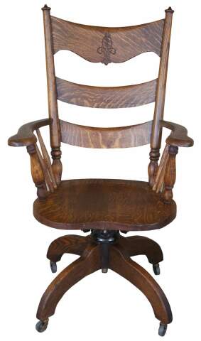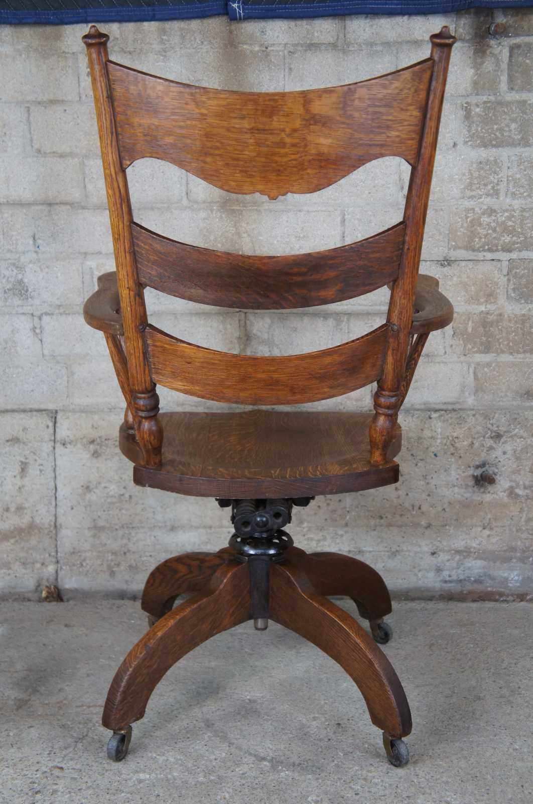 Early 1900s Hubbard, Eldredge & Miller office or desk chair. Made from quartersawn oak featuring a ladder back design with an engraved slat, finials and flared arms. The chair sits upon an adjustable base with tilt function. Hubbard, Eldredge & Miller operated out of of Rochester, NY. Founded by W. A Hubbard Jr & L.D. Eldredge as Hubbard & Eldredge Co. Later incorportaed to Hubbard, Eldredge & Miller with the Addition of Fred S. Miller.