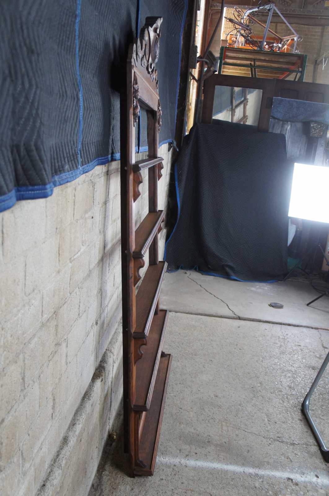 An exquisite Victorian era French hanging plate rack from last quarter of the 19th century. Made from oak with five open shelves supported by corbels. Includes ornate fruit and nut carvings set beneath gadrooning trim. Features an ornately scrolled crown centered by a convex crest. The letters "LA" are carved into the center. The slim profile allows for versatile use and display of collectibles.