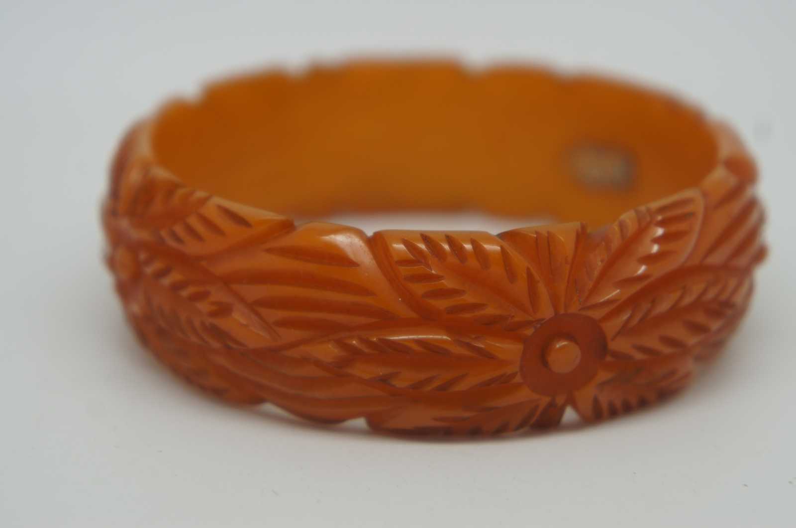 Early to mid 20th century pumpkin orange Bakelite bangle bracelet with heavily carved tiki inspired flowers or leaves.