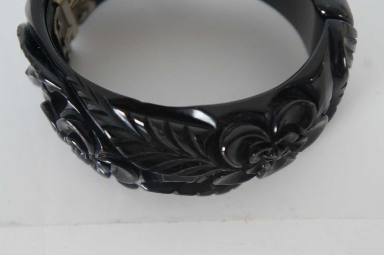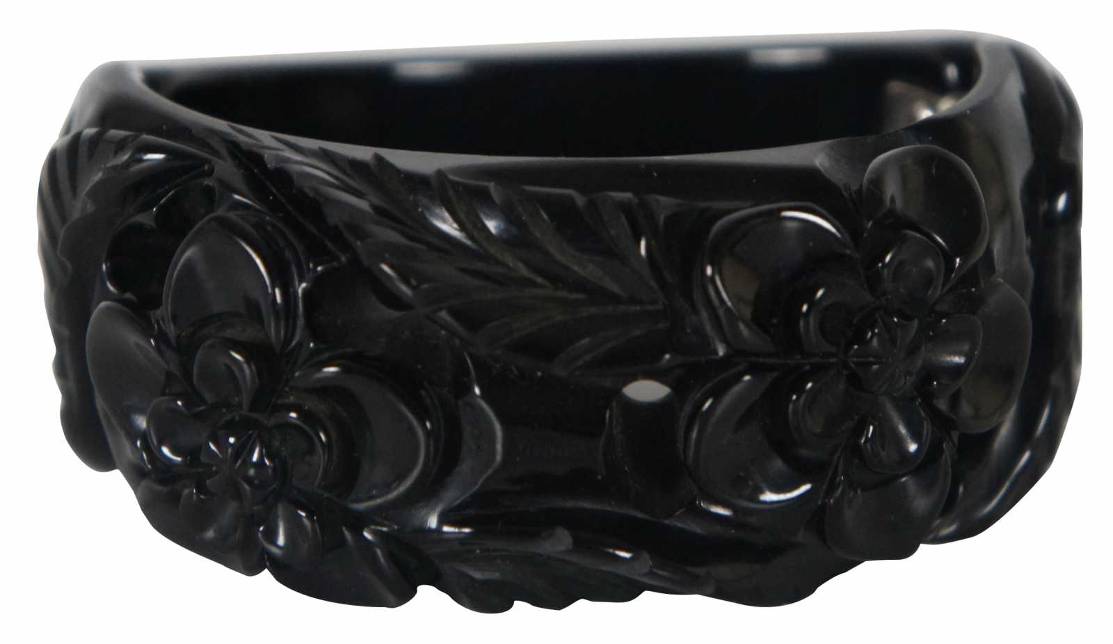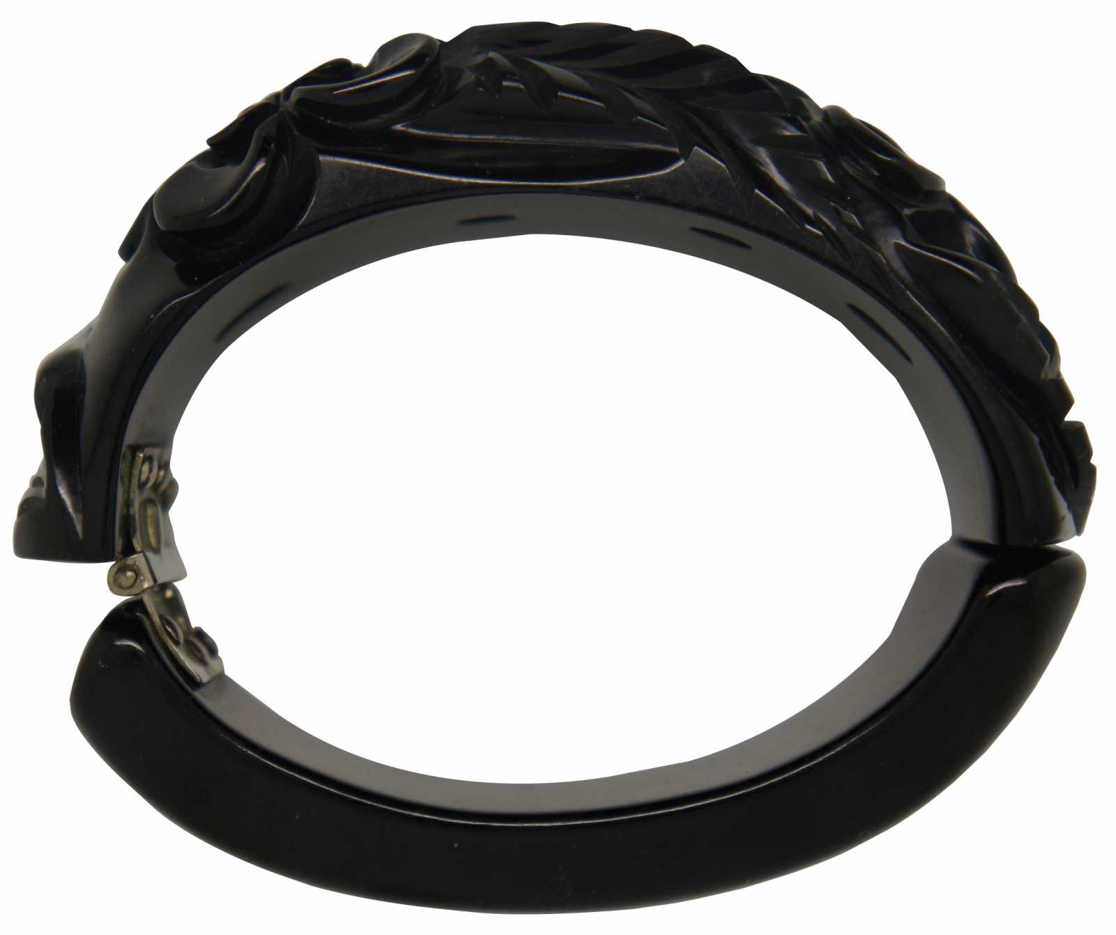 Early to mid 20th century black Bakelite clamper bracelet with spring hinge and carved flowers and leaves.