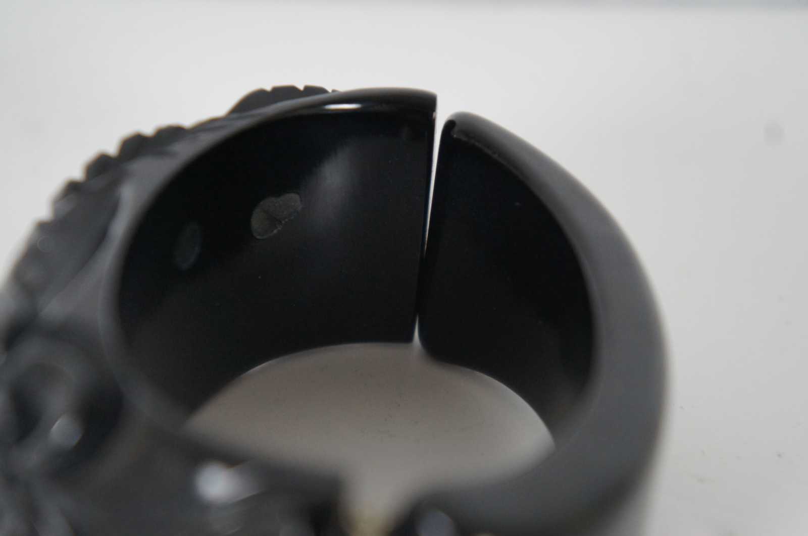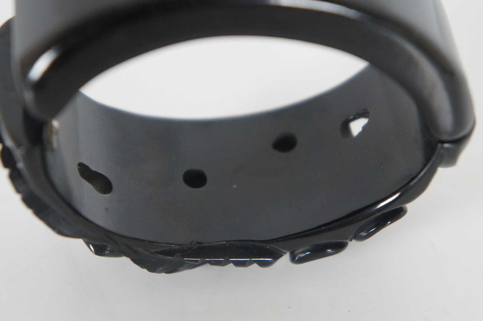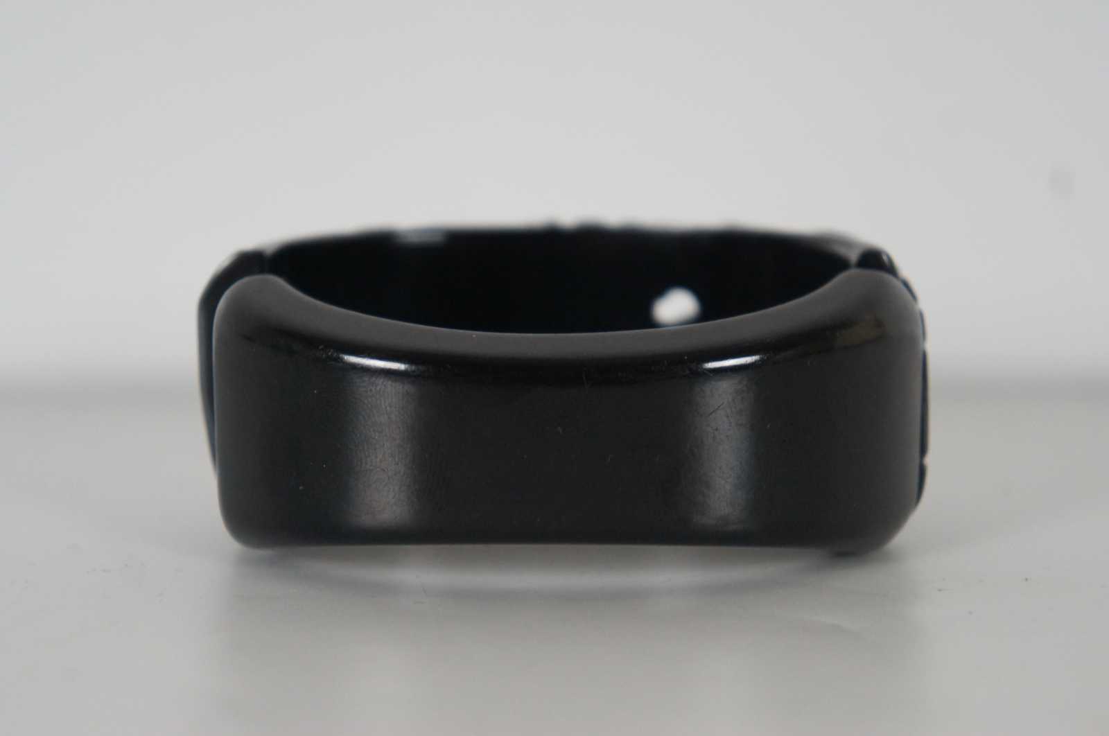 Early to mid 20th century black Bakelite clamper bracelet with spring hinge and carved flowers and leaves.