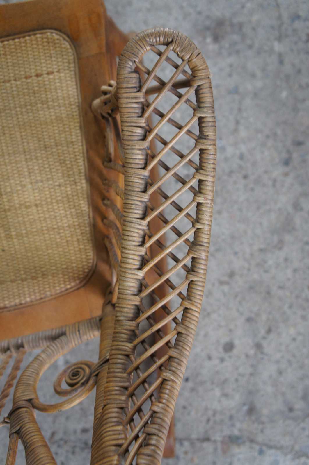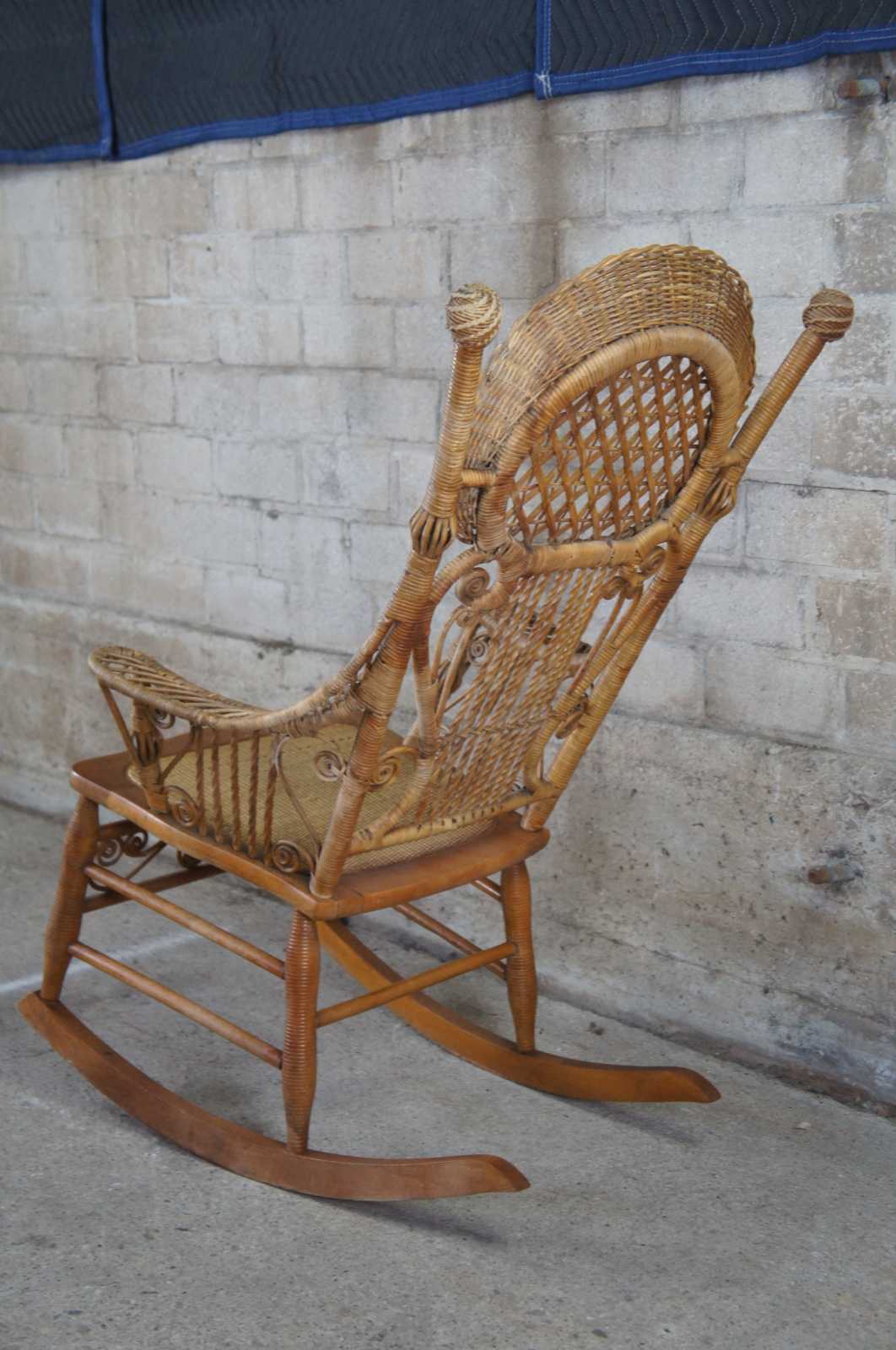 Early 1900s Heywood Wakefield Rocking chair. Features a wood frame wrapped in wicker with a rattan seat. Includes scrolled and twisted supports as well as braiding and lattice design. Remnants of original tag can be seen along the underside.
