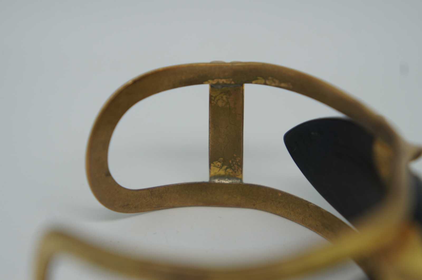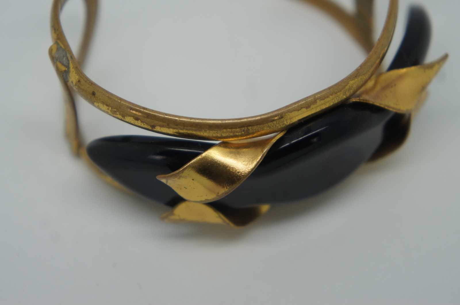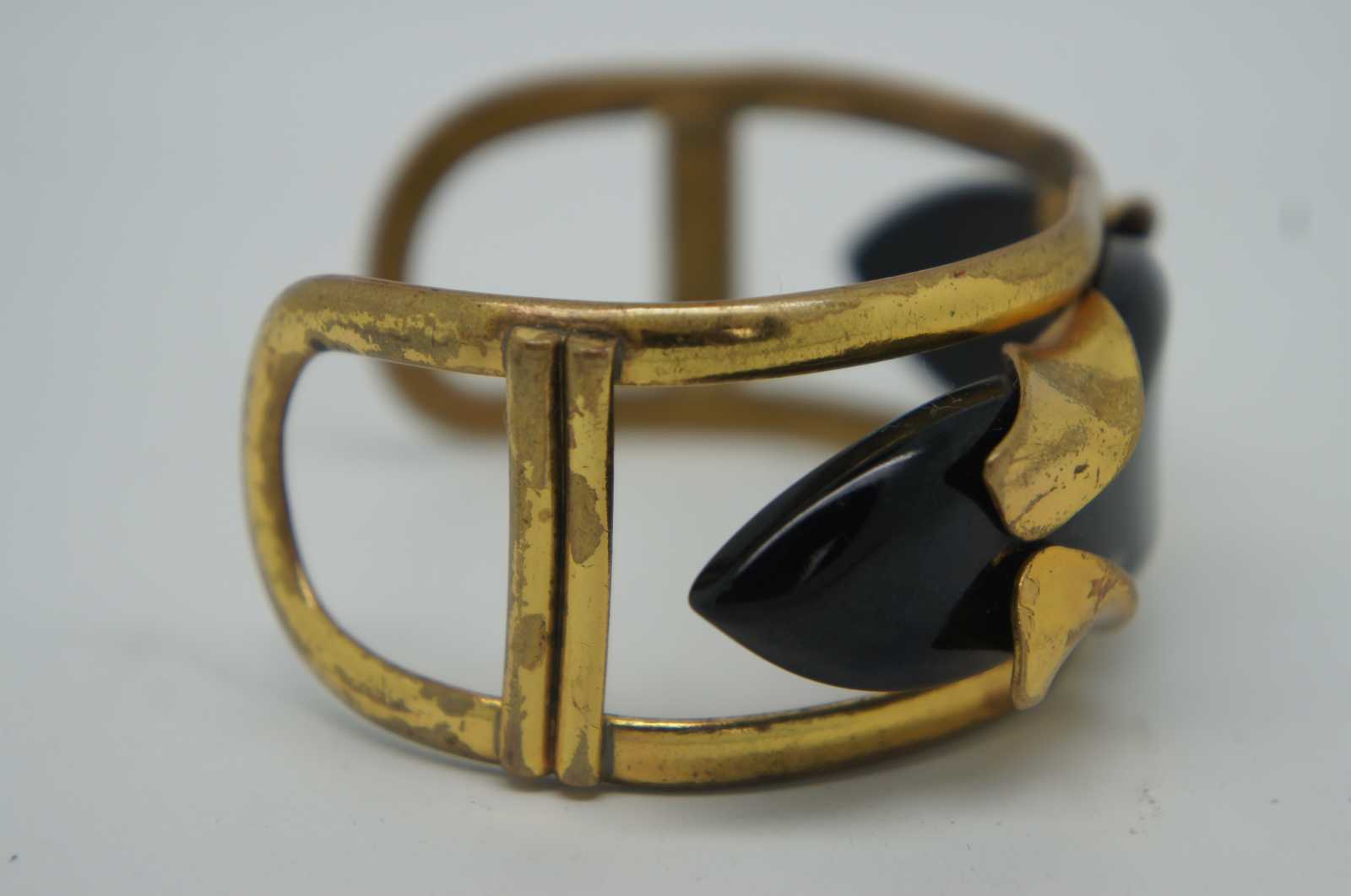 Early to mid 20th century gold tone brass cuff bracelet with black Bakelite stone.