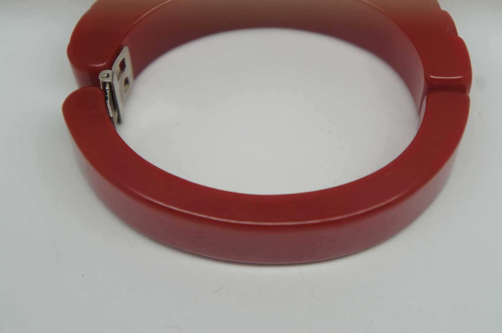 Early to mid 20th century Bakelite clamper bracelet in candy apple red with a carved tribal inspired leaf motif and spring hinge.