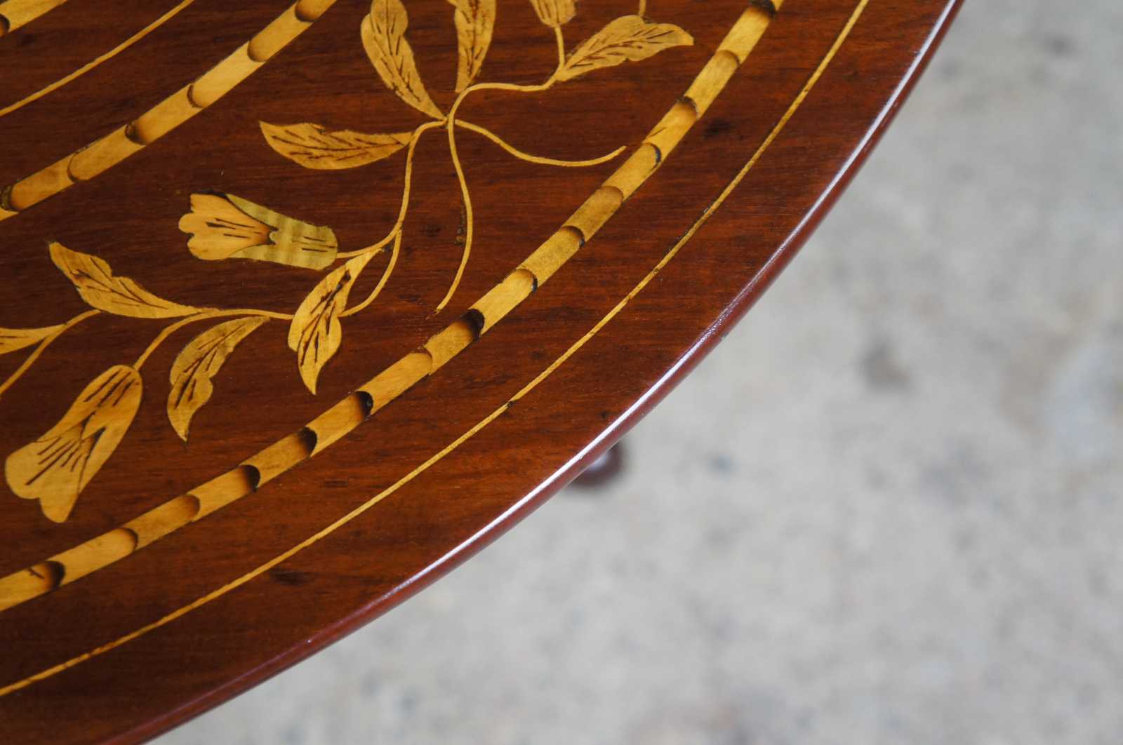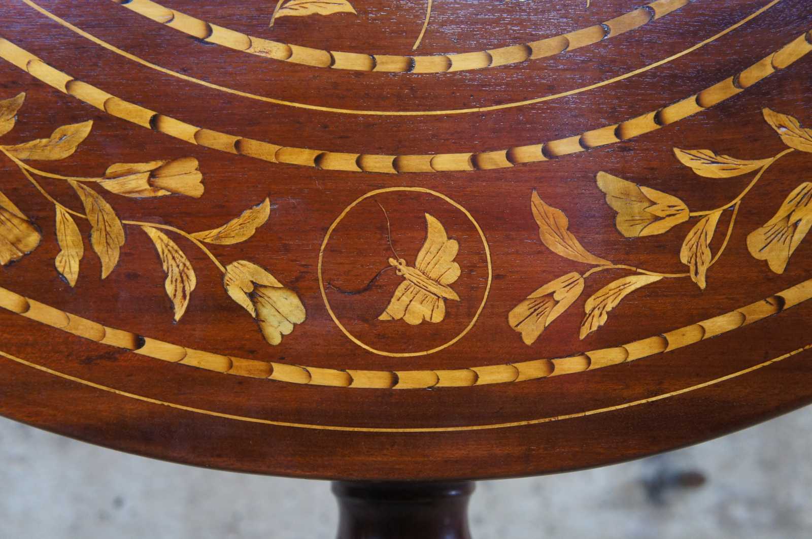 A very fine example of a mid Victorian dutch marquetry tilt top table. Made from Mahogany with beautiful floral and rose inlays. Features butterflies along each quadrant. The table is supported by a turned baluster support terminating into a tripod base with downswept legs and pad feet.