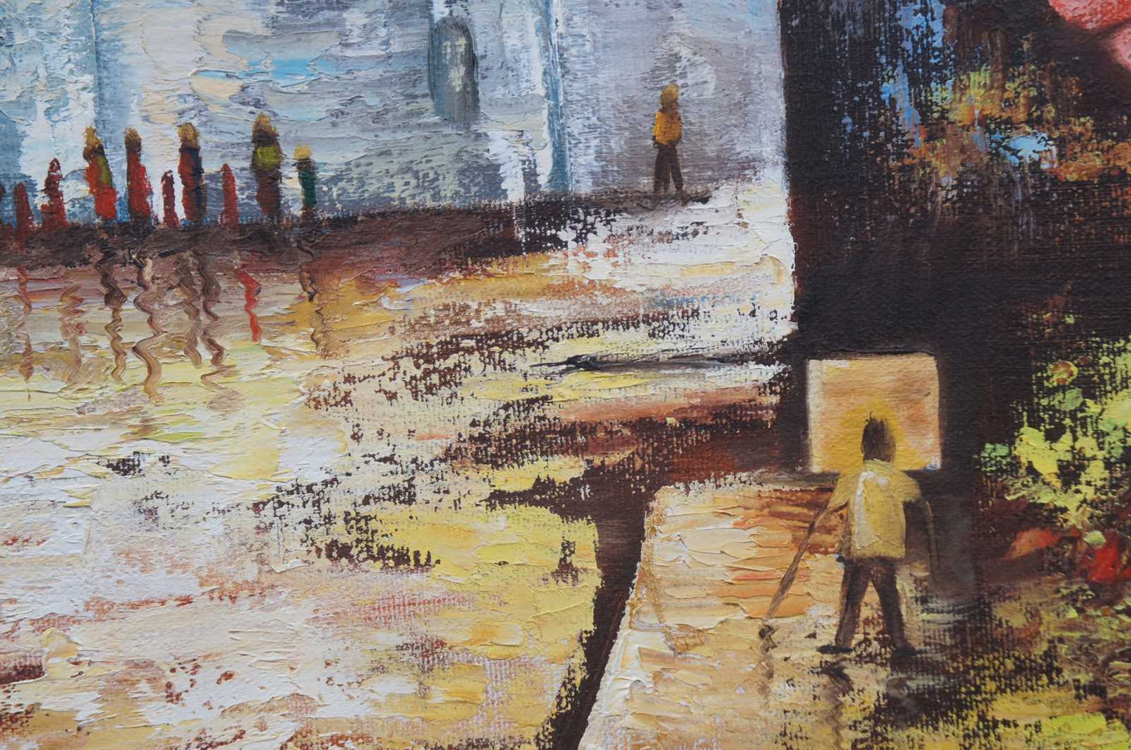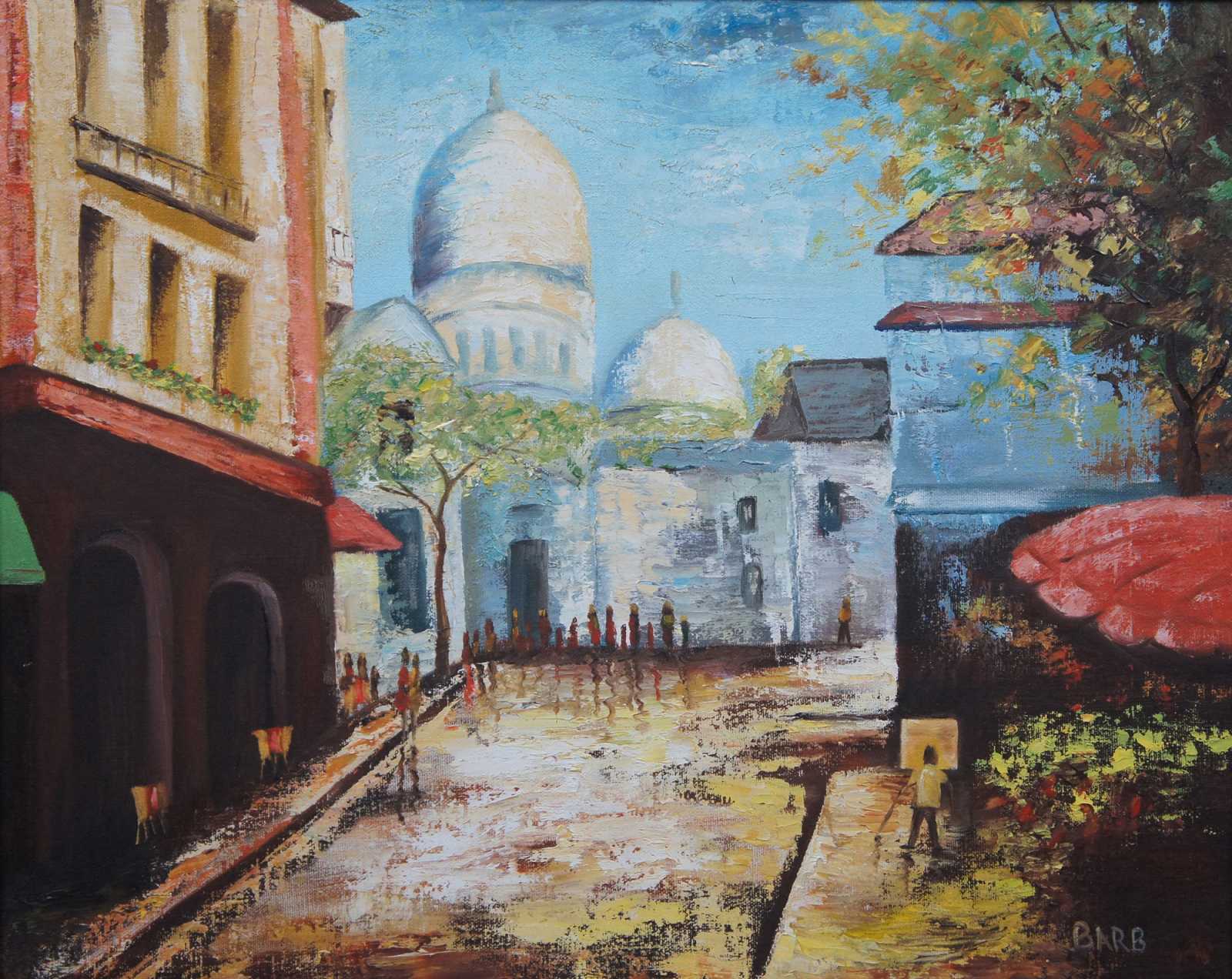 Vintage oil on canvas impressionist cityscape showing a European square or plaza with figures and white domed buildings (Mosque / Temple or Capital Building?) in the background; signed Barb.