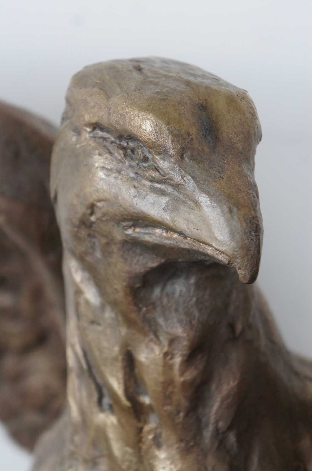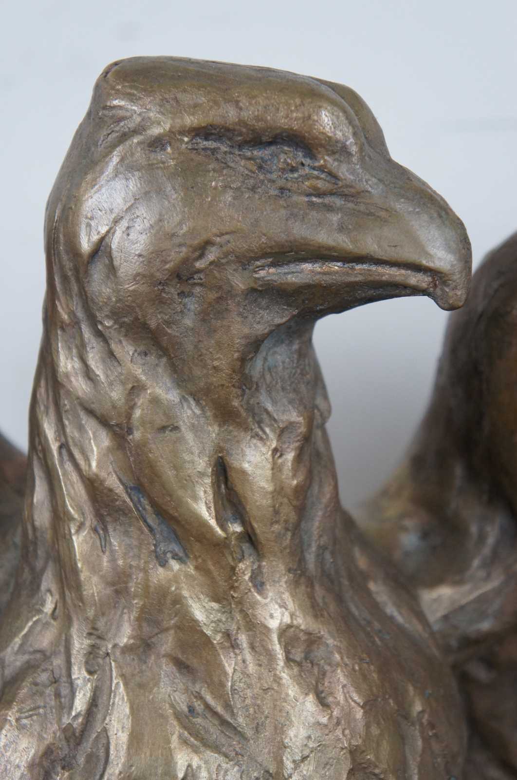 Museum quality antique solid bronze 70lb sculpture by Roman Bronze Works of an eagle seated on the base with wings outstretched. Roman Bronze Works, now operated as Roman Bronze Studios, is a bronze foundry in New York City. Established in 1897 by Riccardo Bertelli, it was the first American foundry to specialize in the lost-wax casting method, and was the country's pre-eminent art foundry during the American Renaissance. A truly impressive and rare find.