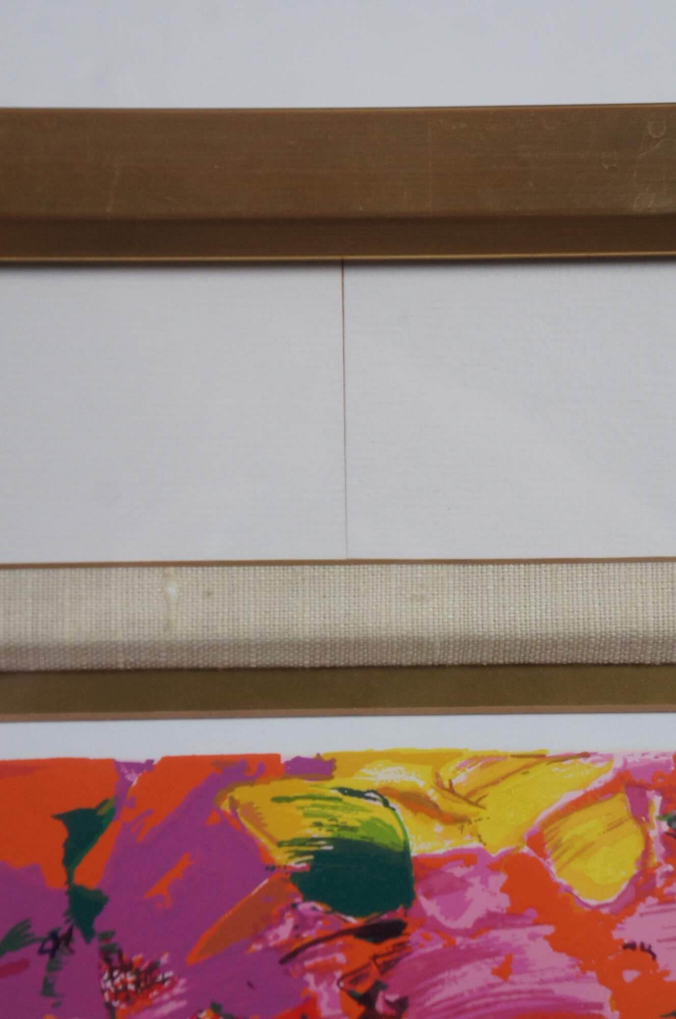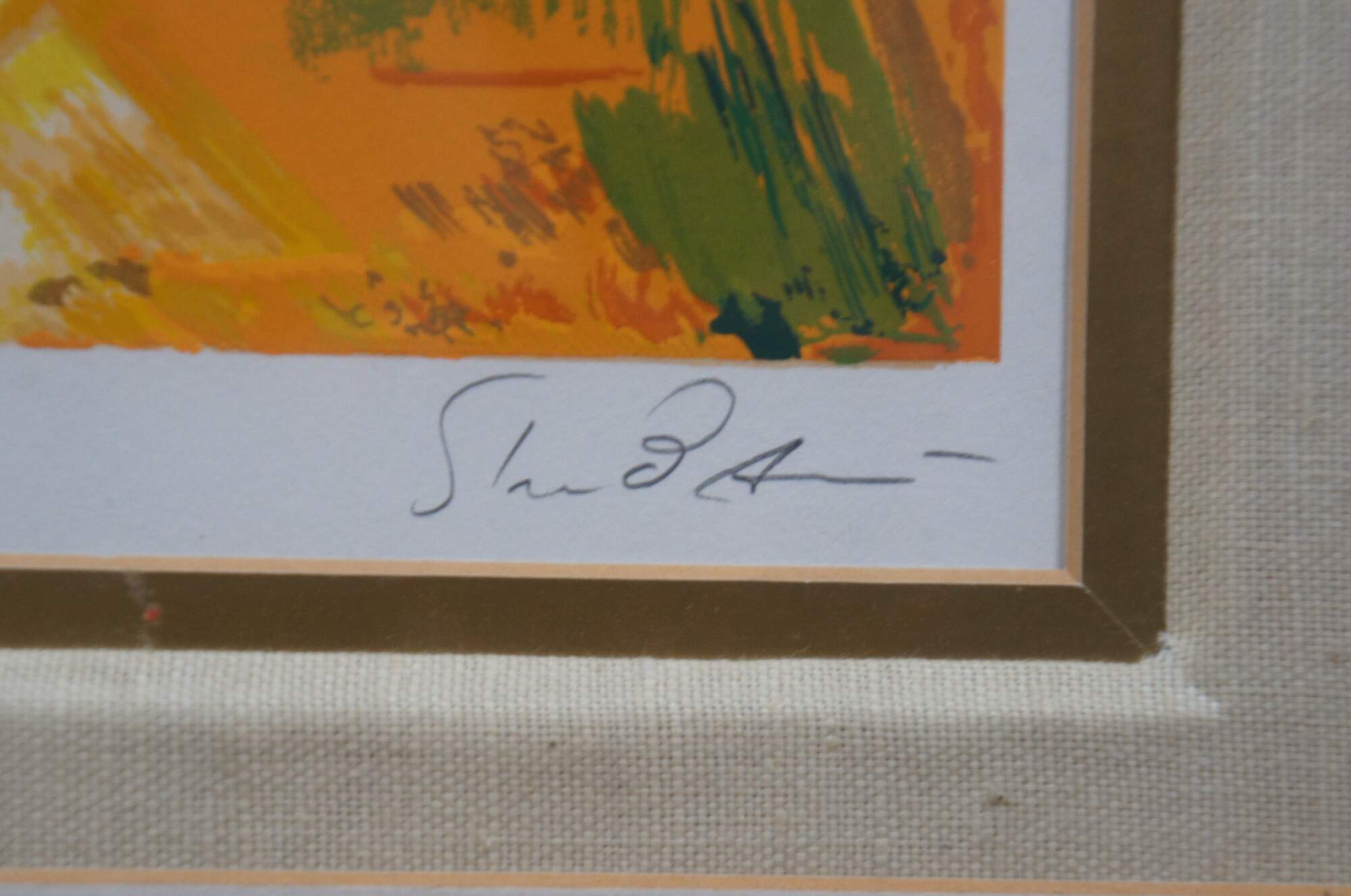 Vintage 1970s limited edition serigraph print by Nicola Simbari titled “Woman with Flowers,” showing the figure of a woman in a white skirt and hat, seated in a flowering garden; pencil signed and numbered 219/300. “Nicola Simbari is a painter of semi-abstract impressionist works. He is a colorist who favors brilliant tones, richly layered with a palette knife. Simbari paints to convey light and energy and provide new definition through intensity of vision and technique.