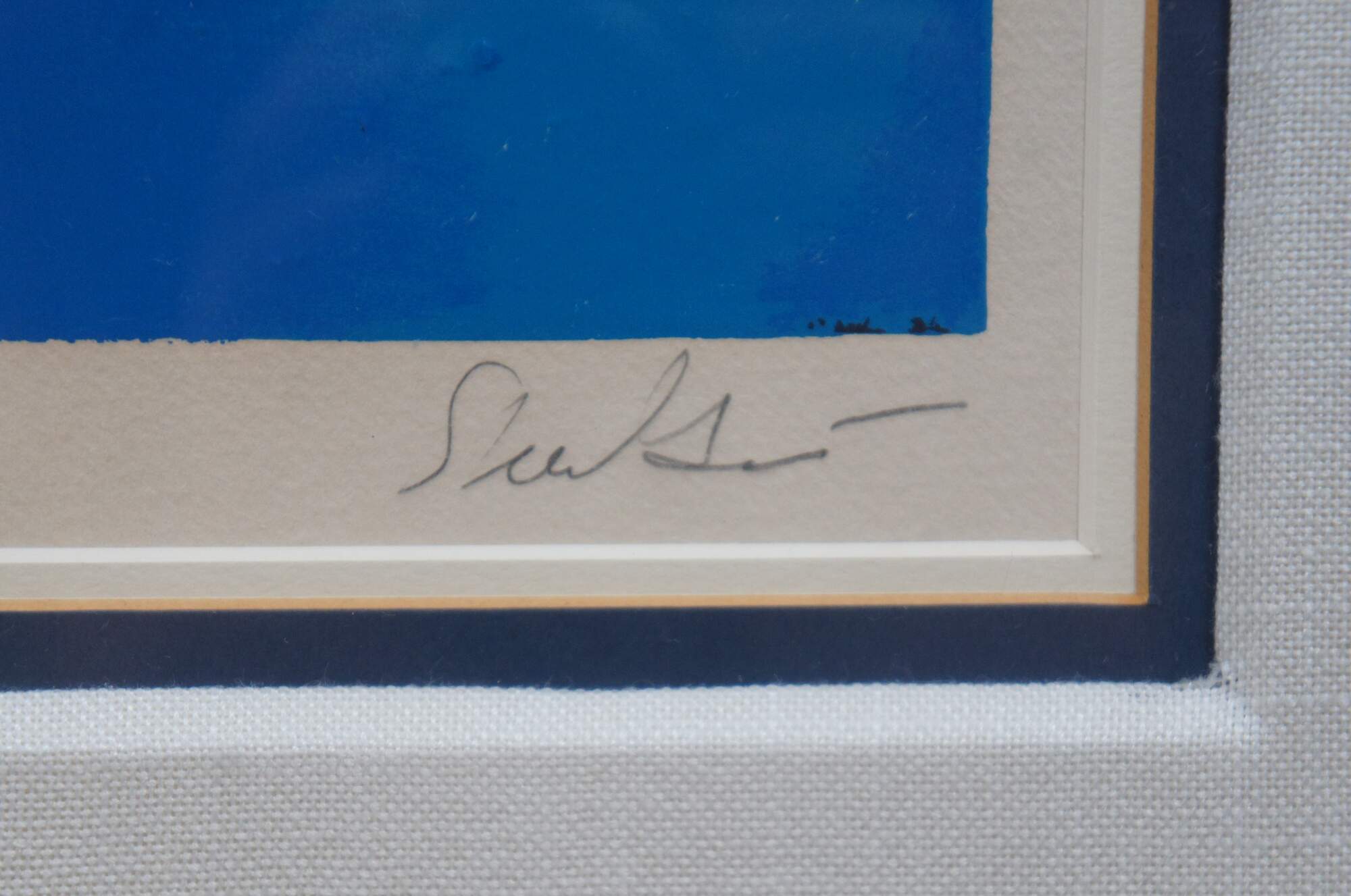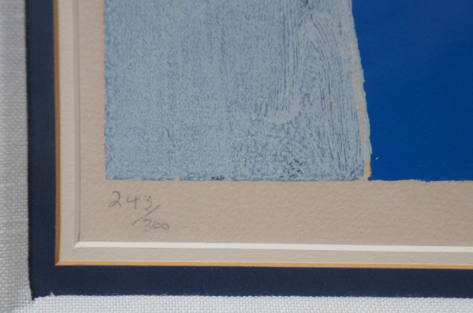 Vintage 1976 limited edition serigraph print by Nicola Simbari titled “Nanette,” showing a blonde woman posed in front of a red, white and blue backdrop; pencil signed and numbered 243/300. “Nicola Simbari is a painter of semi-abstract impressionist works. He is a colorist who favors brilliant tones, richly layered with a palette knife. Simbari paints to convey light and energy and provide new definition through intensity of vision and technique.