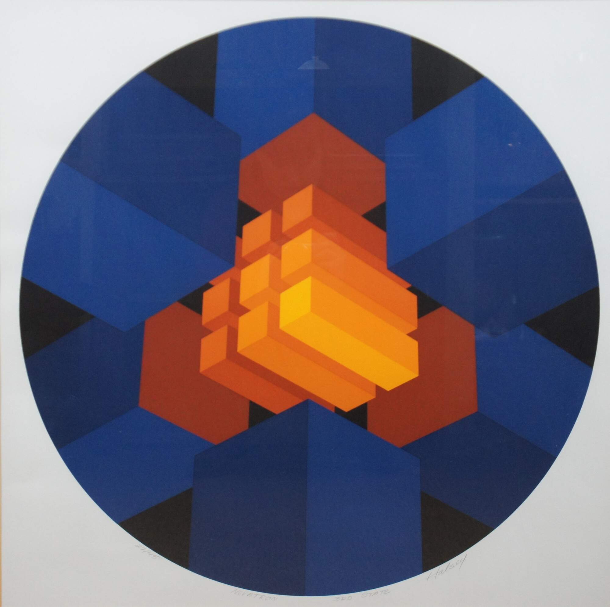 Vintage 1979 original orange and blue circular geometric supergraphic op art serigraph print by Brian Halsey titled “Novatron 3rd State” from the Mandalas suite of works, pencil signed by the artist.