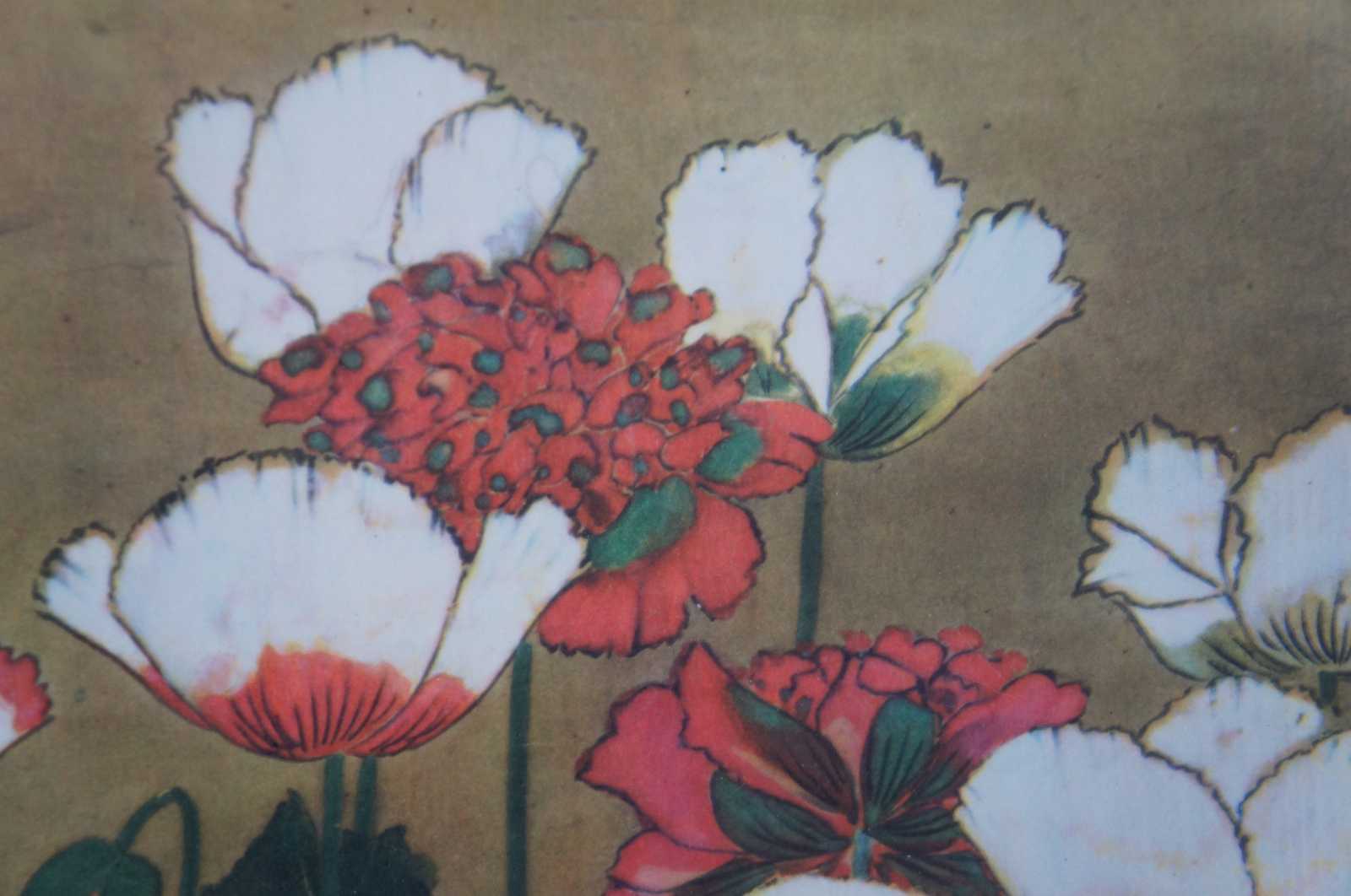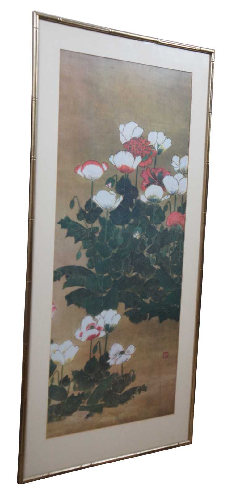 Vintage framed Chinese print featuring groupings of white pink and red flowers in a faux bamboo frame.