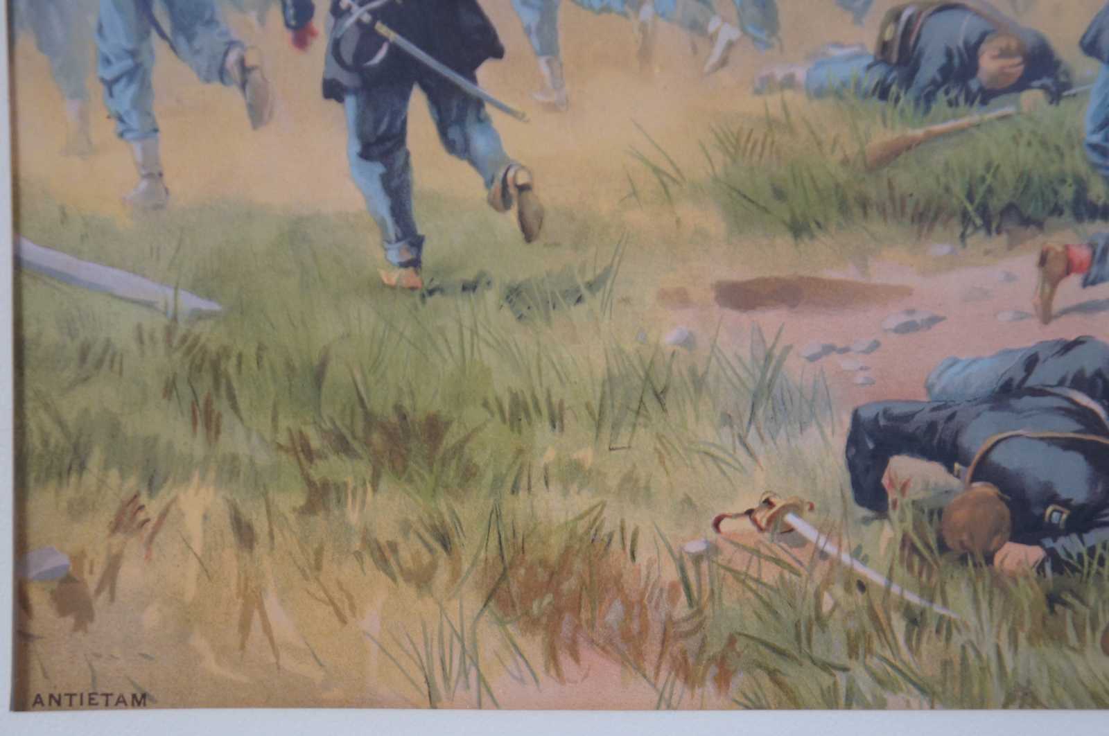 Set of three framed lithograph prints featuring The Battle of Kenesaw (Kennesaw) Mountain (Fought on June 27, 1864, during the Atlanta Campaign of the American Civil War), the Battle of Spottsylvania (The Battle of Spotsylvania Court House, sometimes more simply referred to as the Battle of Spotsylvania (or the 19th-century spelling Spottsylvania), was the second major battle in Lt. Gen. Ulysses S. Grant and Maj. Gen. George G. Meade's 1864 Overland Campaign of the American Civil War), and Antietam (The Battle of Antietam, also called the Battle of Sharpsburg, occurred on September 17, 1862, at Antietam Creek near Sharpsburg, Maryland. It pitted Confederate General Robert E. Lee’s Army of Northern Virginia against Union General George McClellan’s Army of the Potomac and was the culmination of Lee’s attempt to invade the north. The battle’s outcome would be vital to shaping America’s future, and it remains the deadliest one-day battle in all of American military history). Copyright 1880s by L. Prang & Company of Boston, printed by the American Lithographic Company.