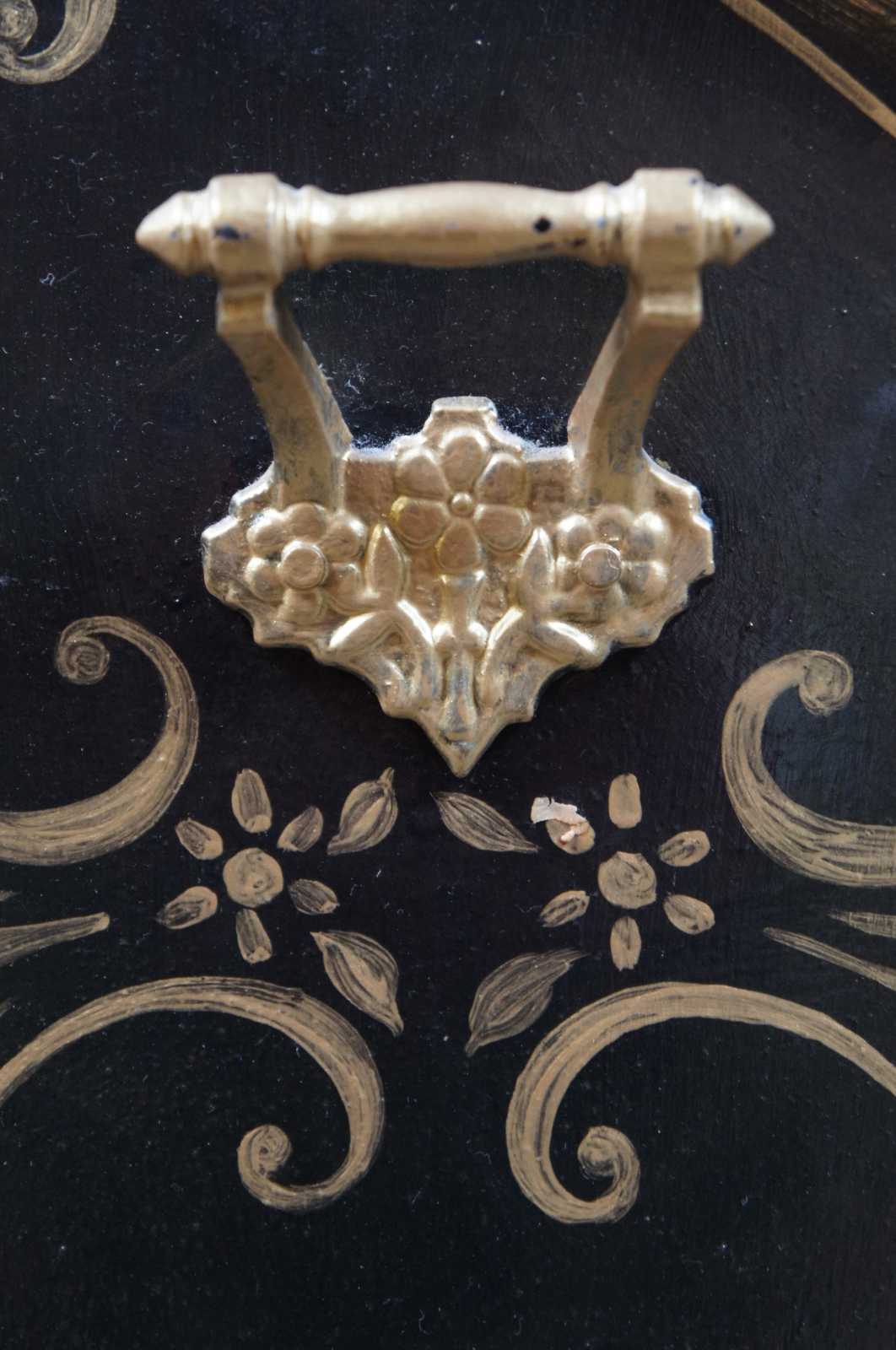 Antique Victorian toleware metal coal bin or heartherware hod with lid, painted floral motif in black with yellow and pink roses, accented with gilded feet, handles, and rear hook for a shovel.