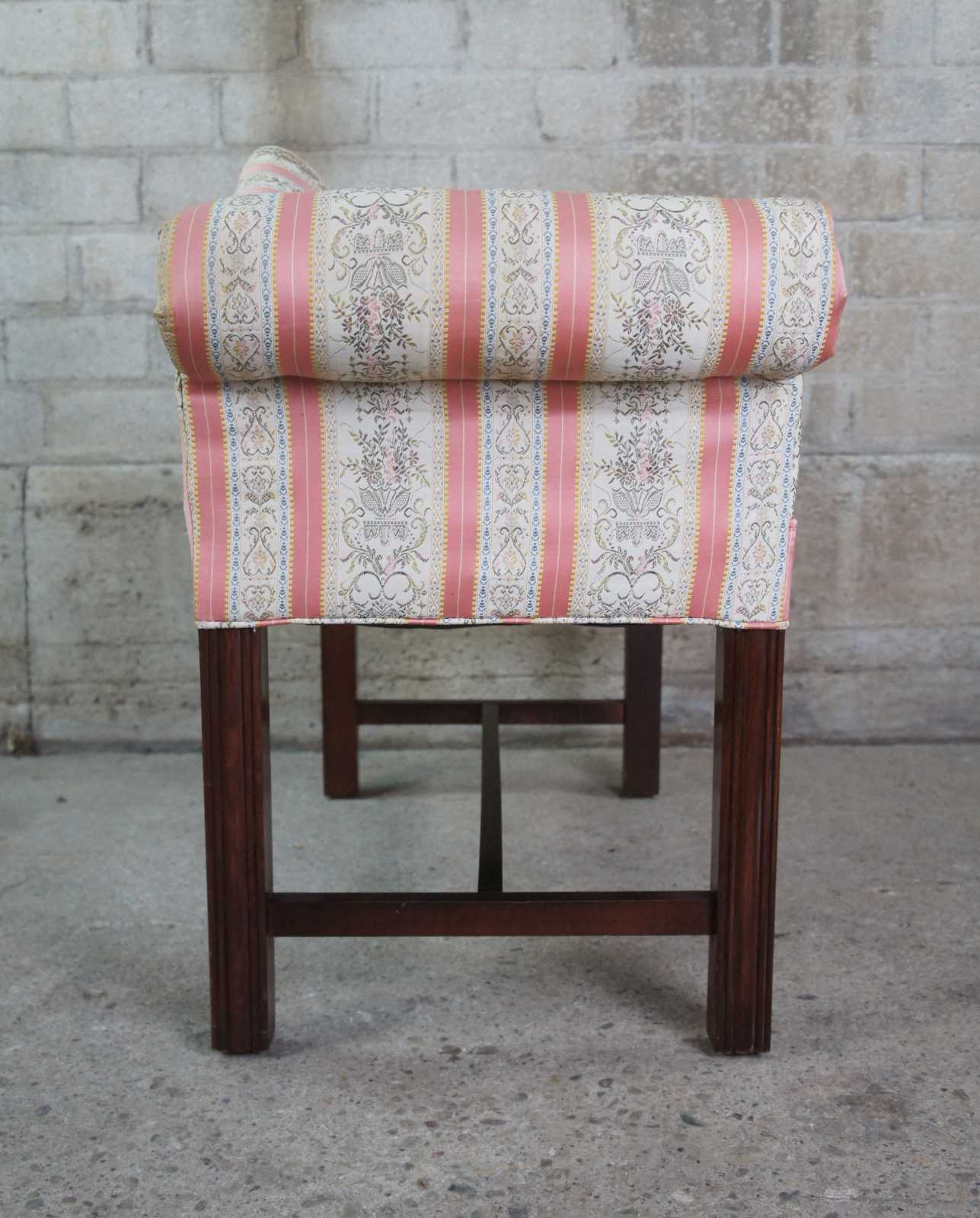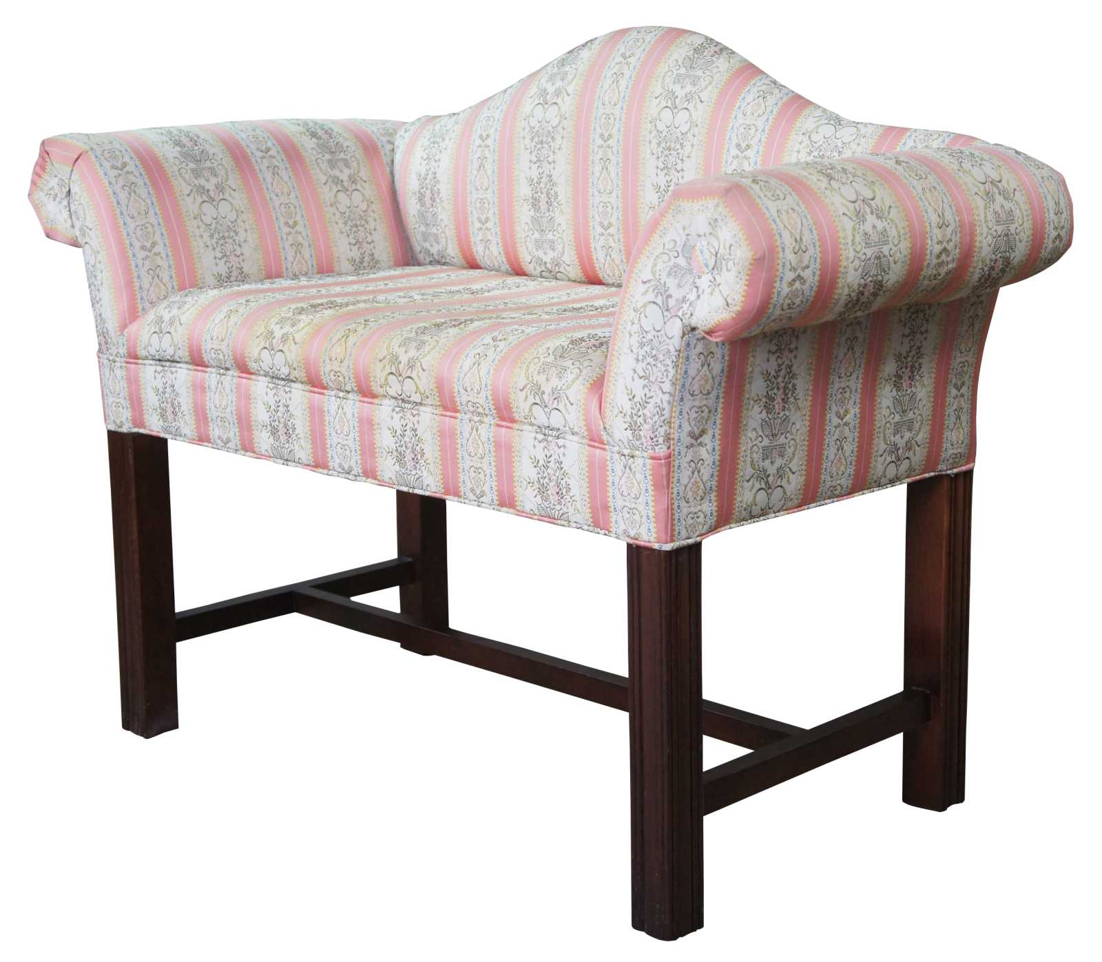 Petite antique Chippendale settee or bench seat. Made of mahogany featuring camelback form with rolled arms and square fluted legs.