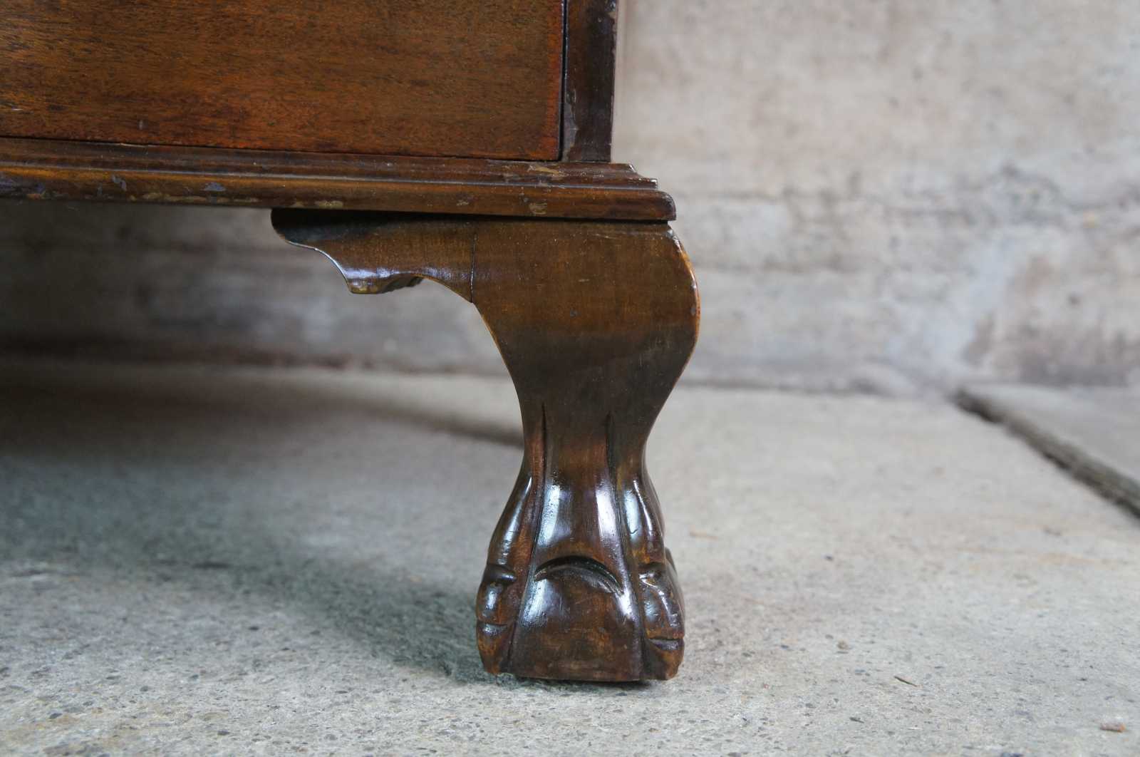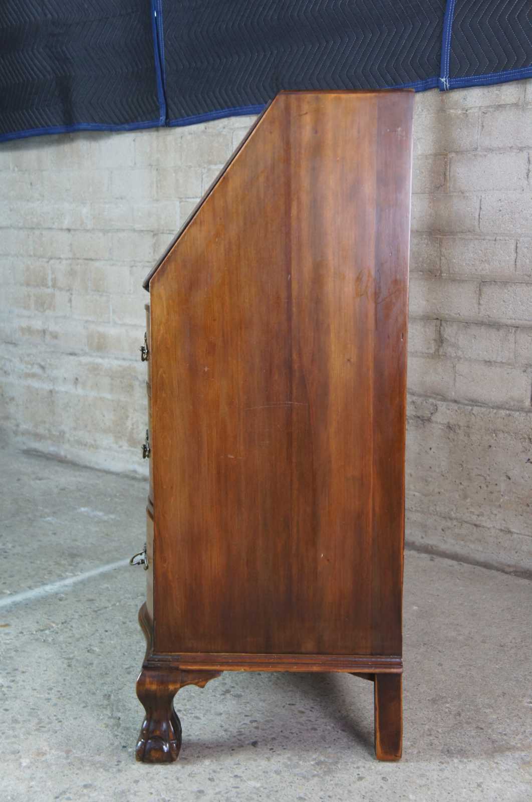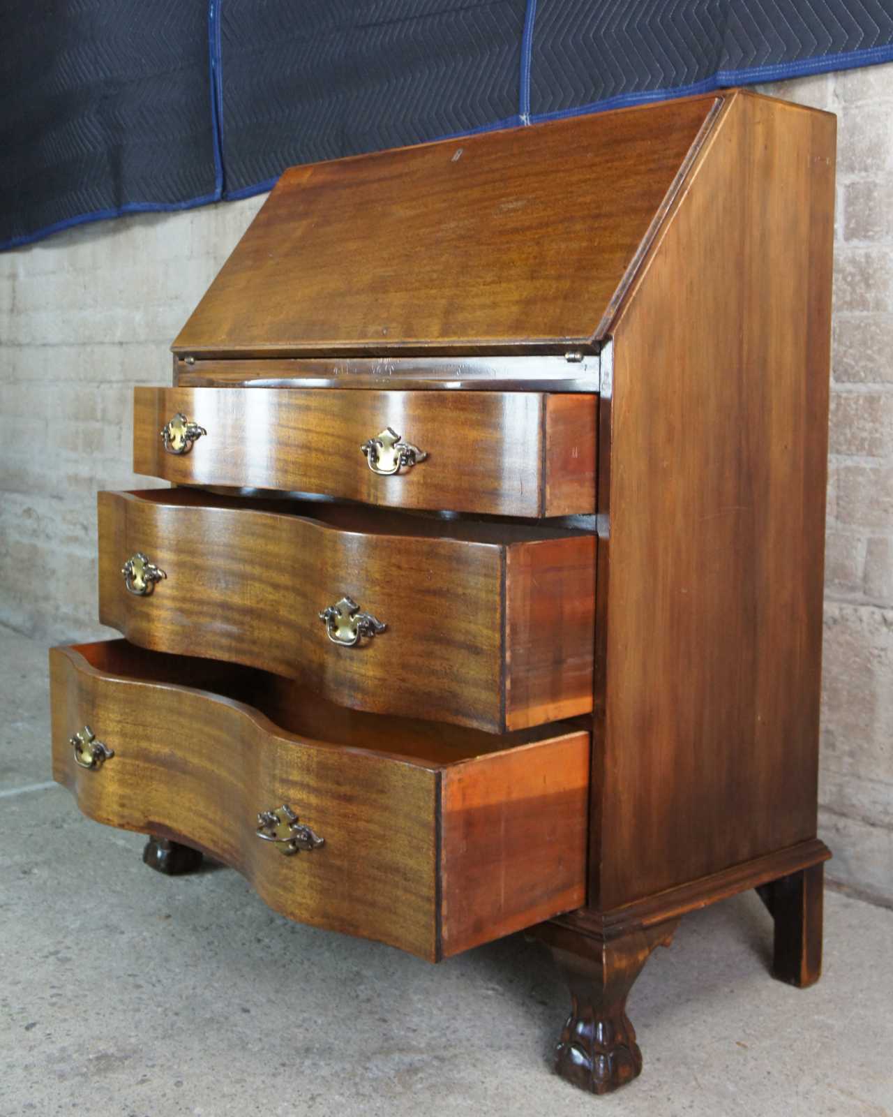 Antique Chippendale secretary, bureau or writing desk. Made from mahogany featuring a flip top that opens to multiple drawers and file storage. The dresser is constructed with an oxbow front with three drawers and federal style hardware over ball and claw feet.