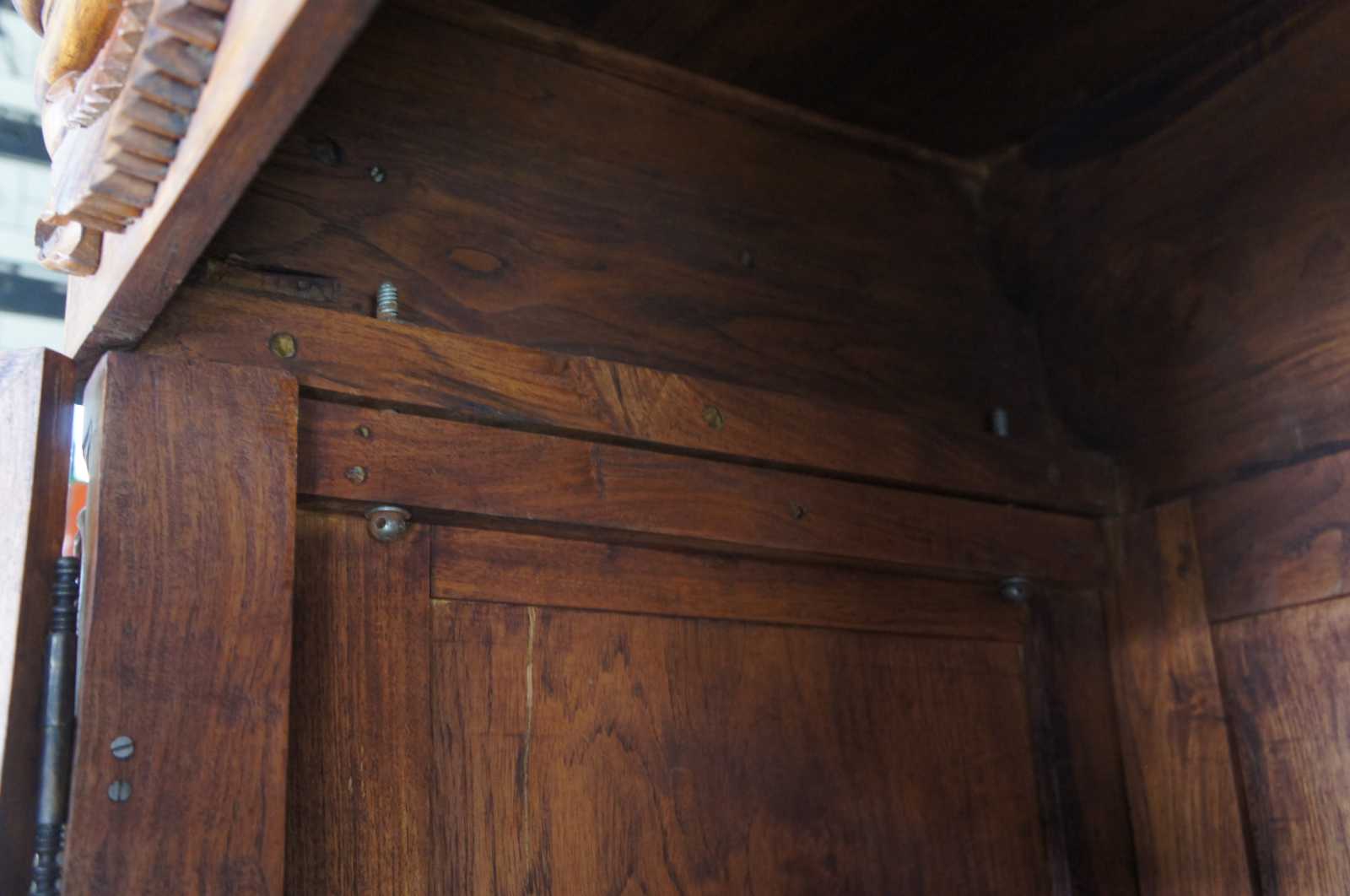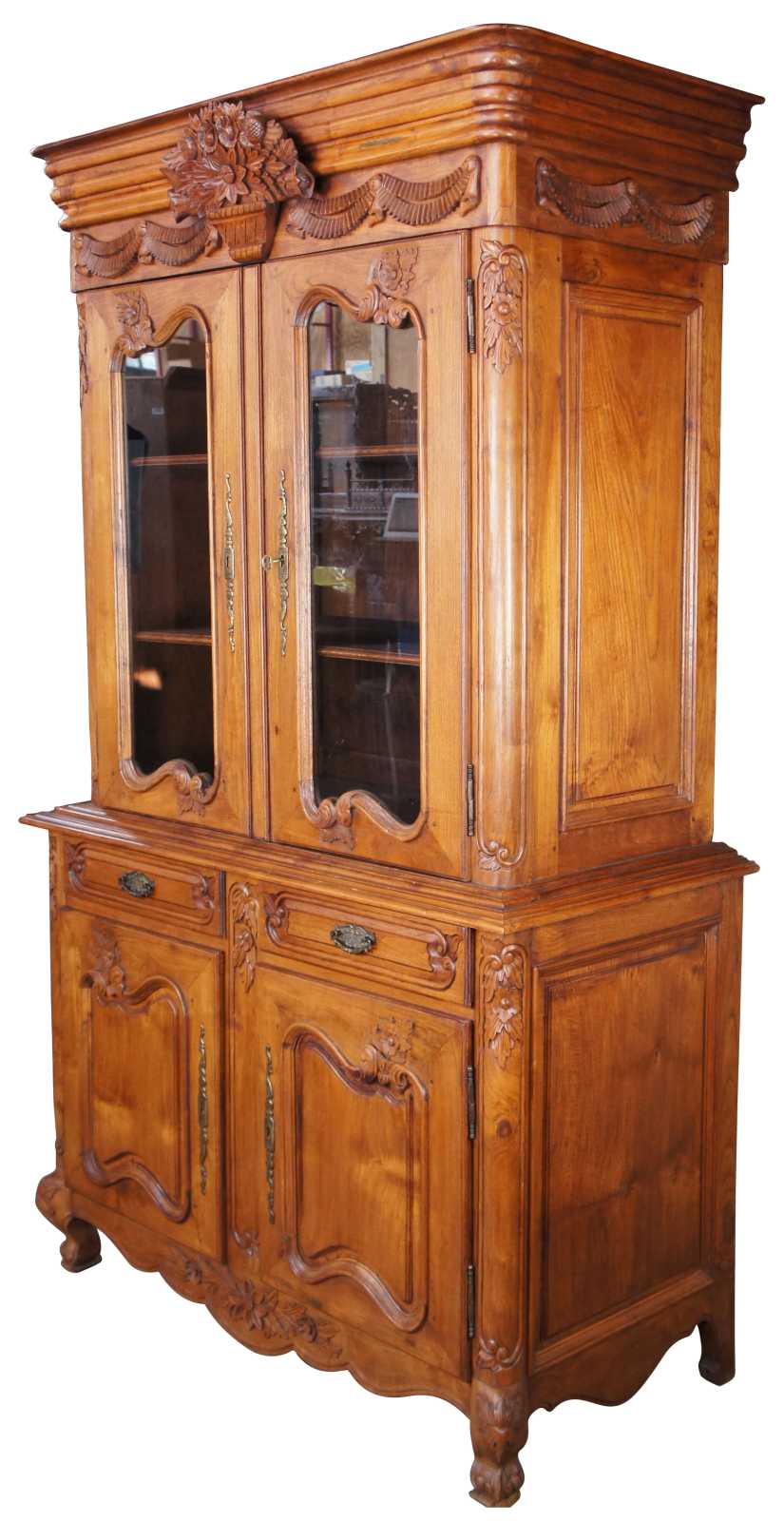 Vintage carved deux corps wedding / marriage buffet / china hutch / curio cabinet / bookcase featuring embellished foliage and flowers in carved relief with a central flower filled basket.