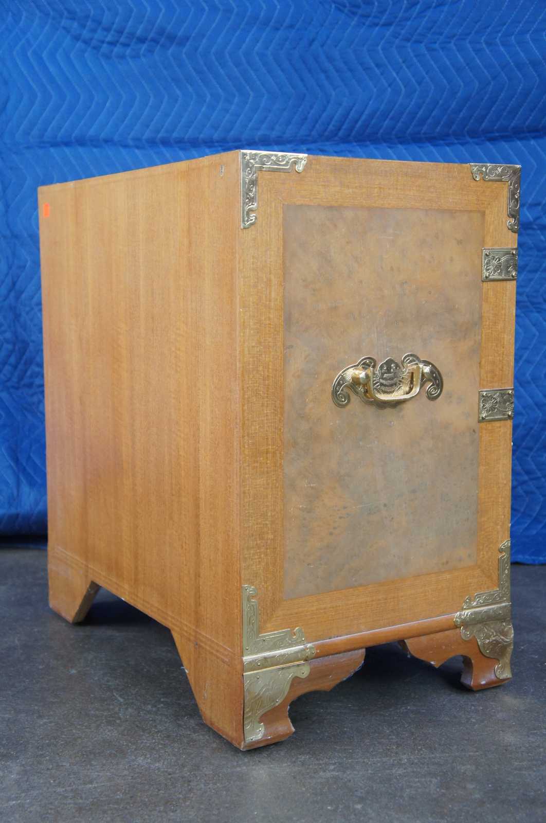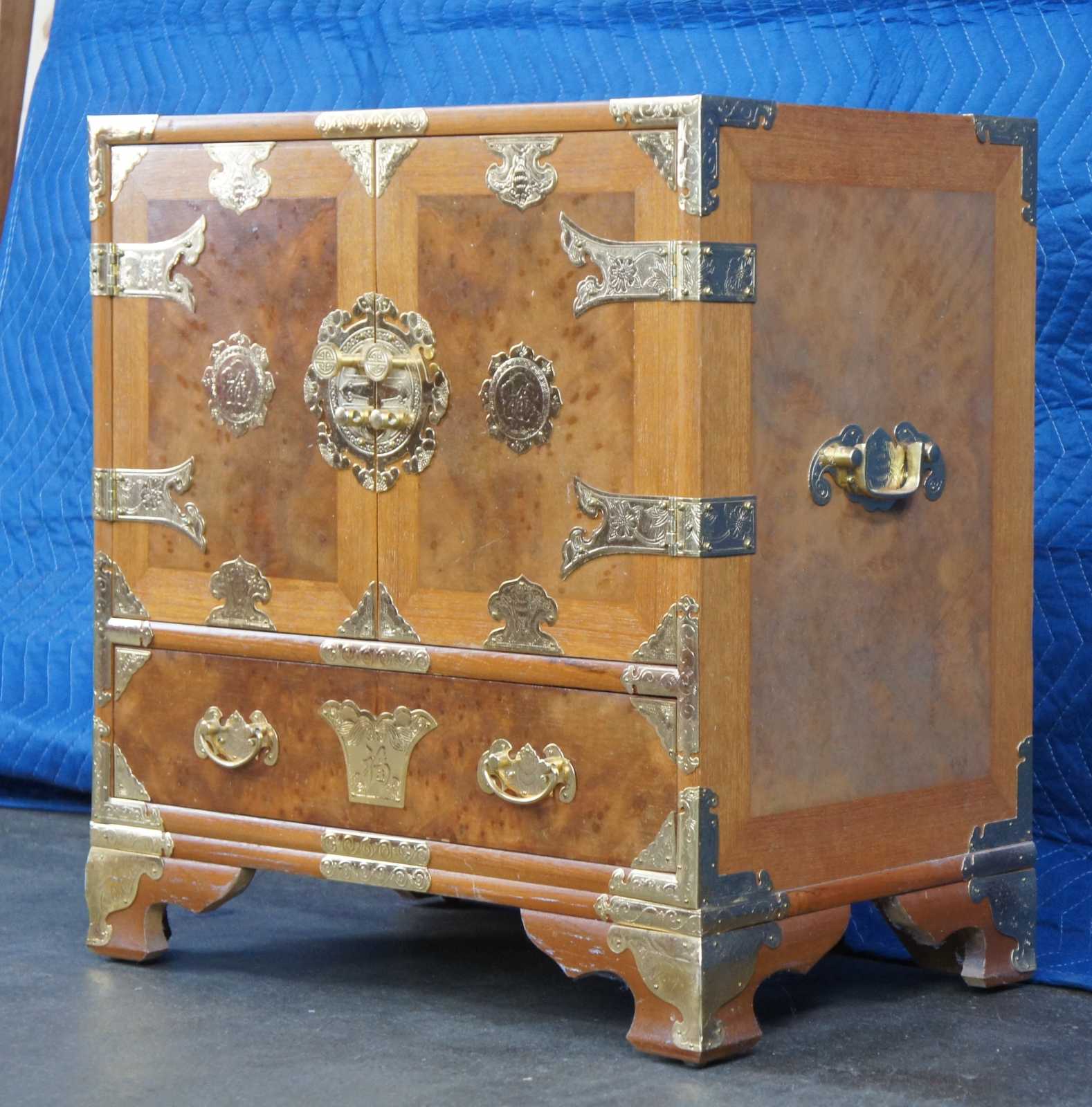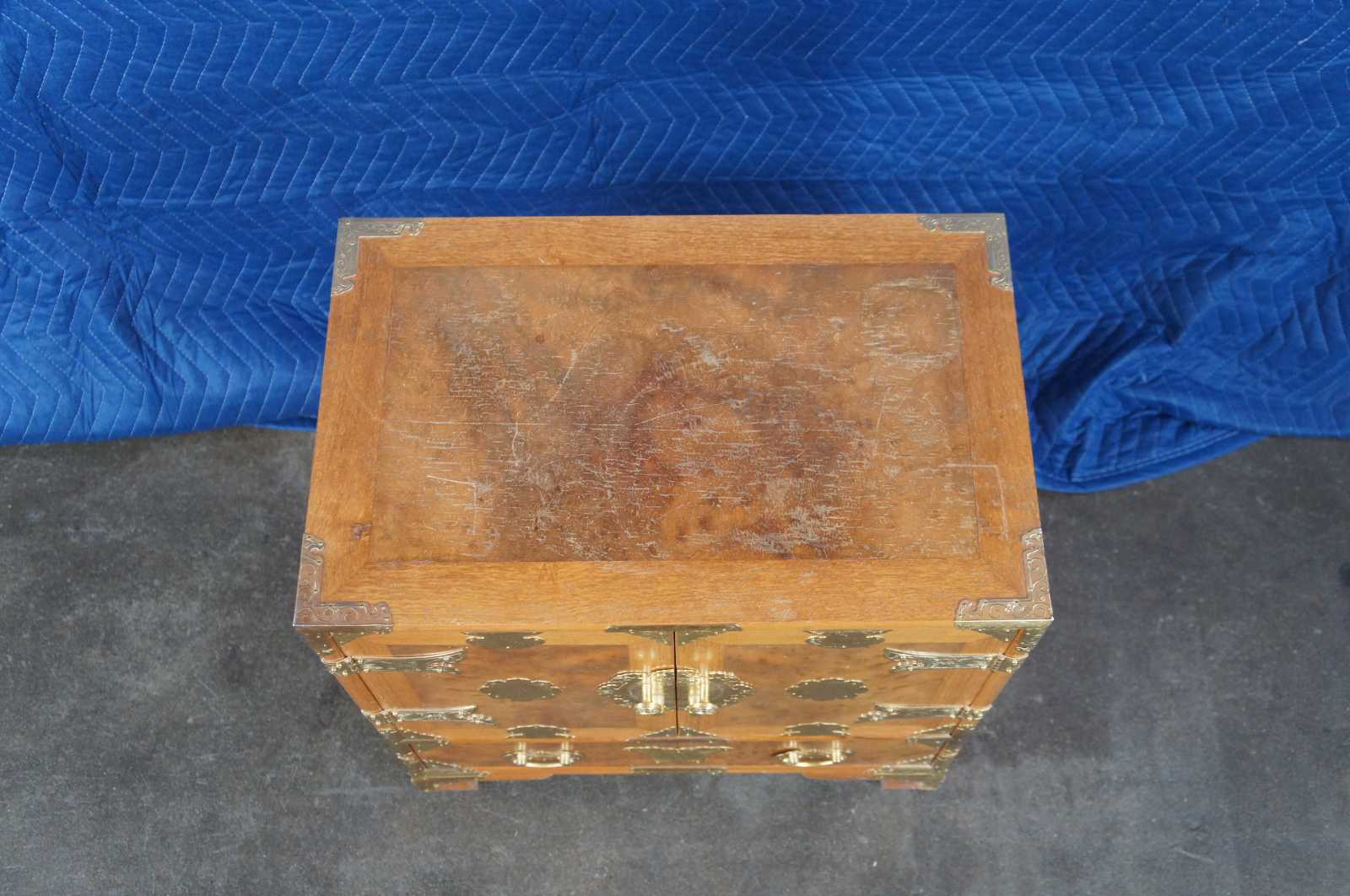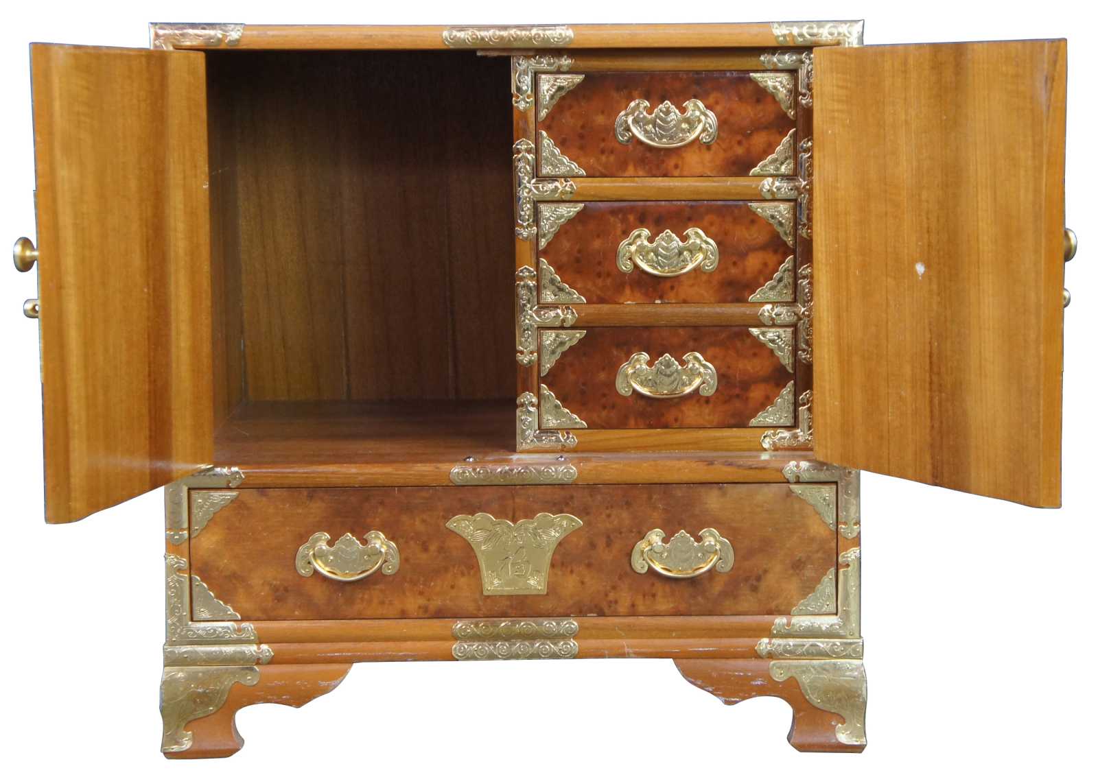 Mid century tansu inspired chest featuring elm burl wood case with a heavy adornment of brass accents.