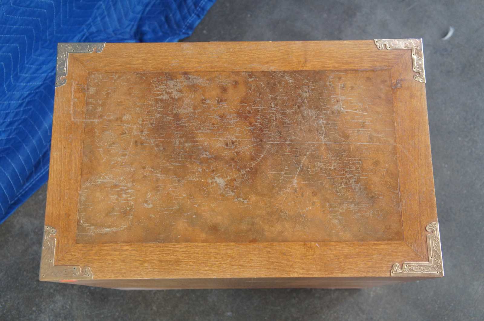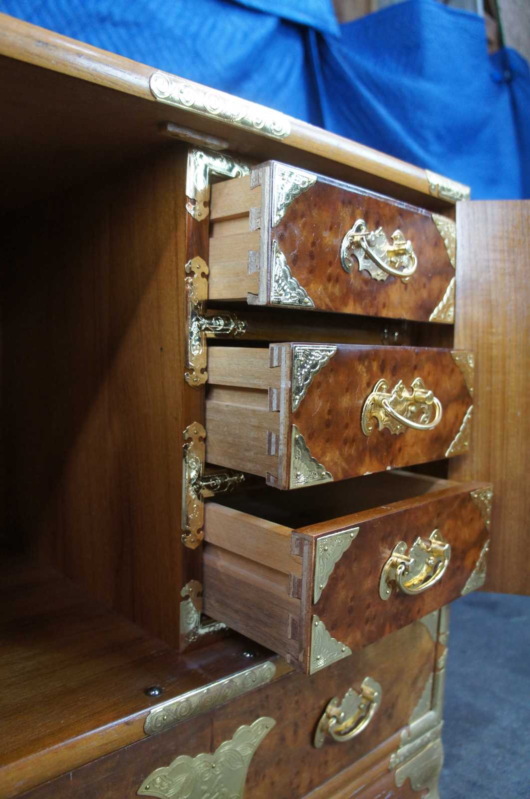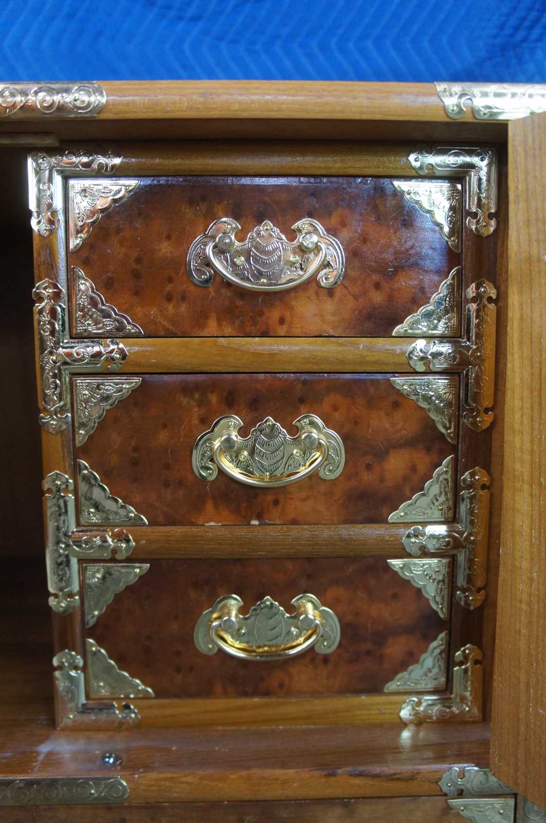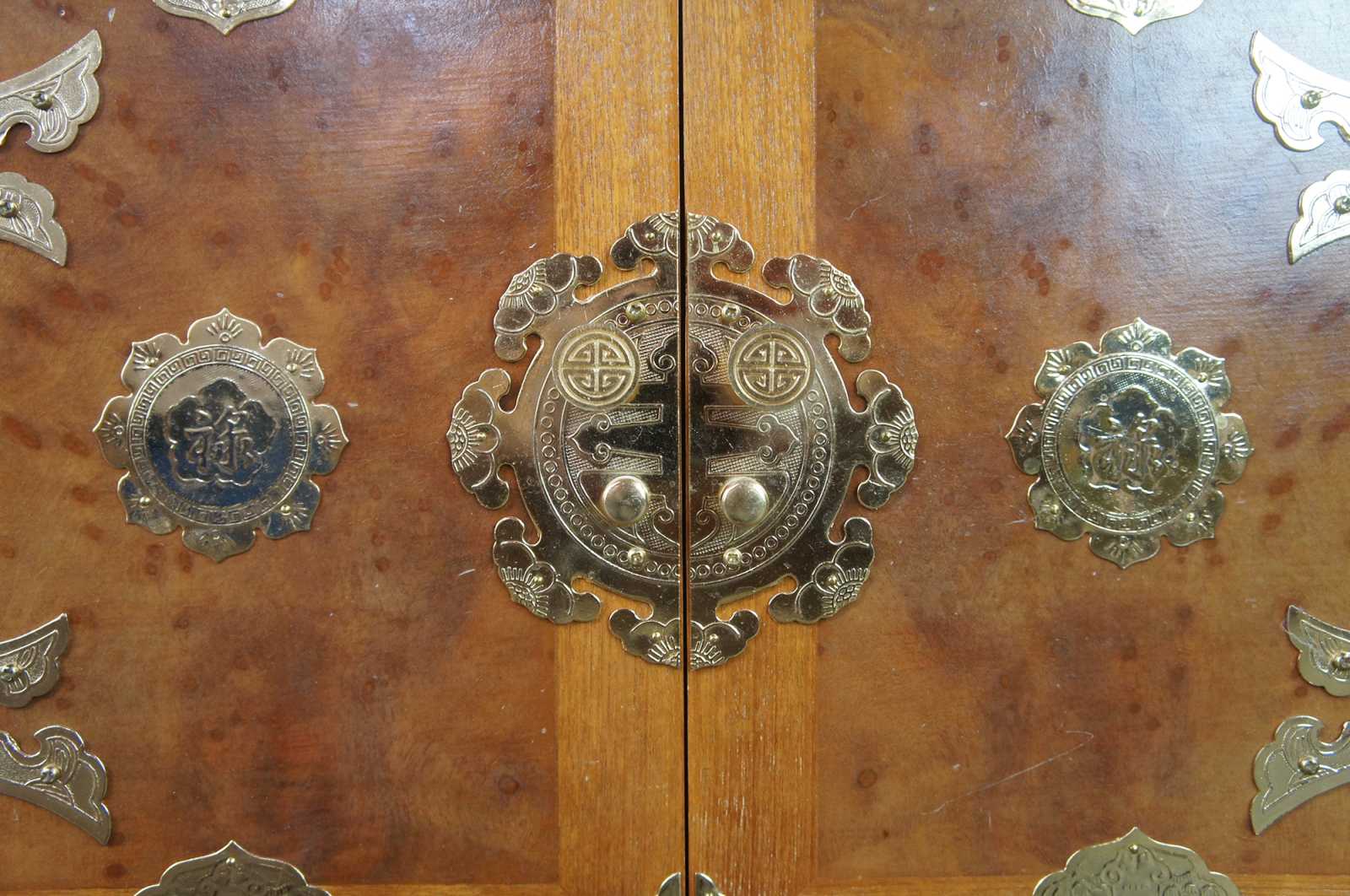 Mid century tansu inspired chest featuring elm burl wood case with a heavy adornment of brass accents.