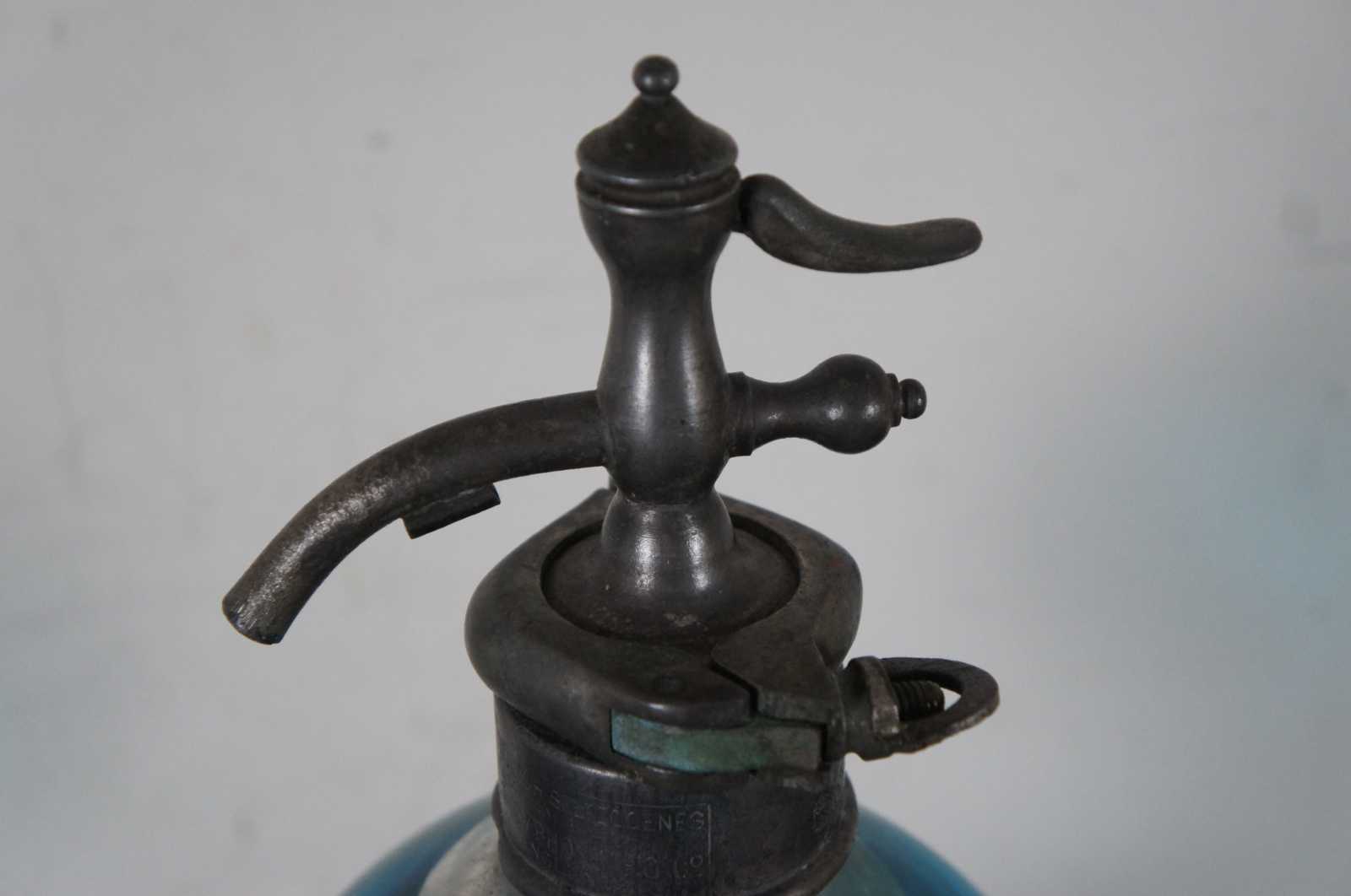 Rare antique Standard English Seltzogene by the British Syphon Manufacturing Company; filled with blue tinted water by a previous owner. This bottle is likely to date to the late 1800's and sports an art nouveau, double globe/gourd design. The gourd shape had a purpose, the top section was used for Tartaric Acid and Bicarbonate of soda (which reacted to create Carbon Dioxide), while the bottom section was used for water or other substances which needed to be made sparkling. The resultant gas would then force the water up through the glass tube attached to the nozzle. Many of these bottles originated in France, though this example has an English inscription which may indicate a slightly later date. The body of such bottles were originally fitted with metal netting and has a pewter spout which bears the inscribed hallmark of the manufacturer. The metal netting was fitted to prevent glass from dispersing in case of an explosion which occasionally happened with such bottles.