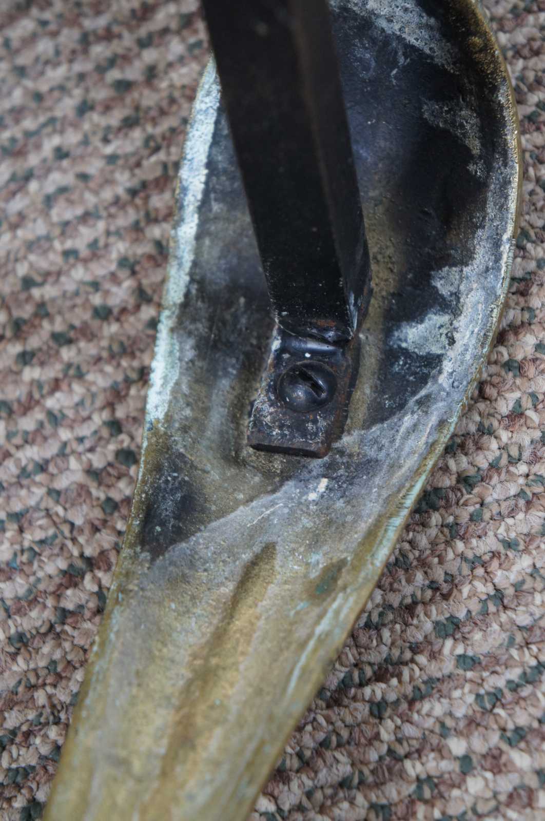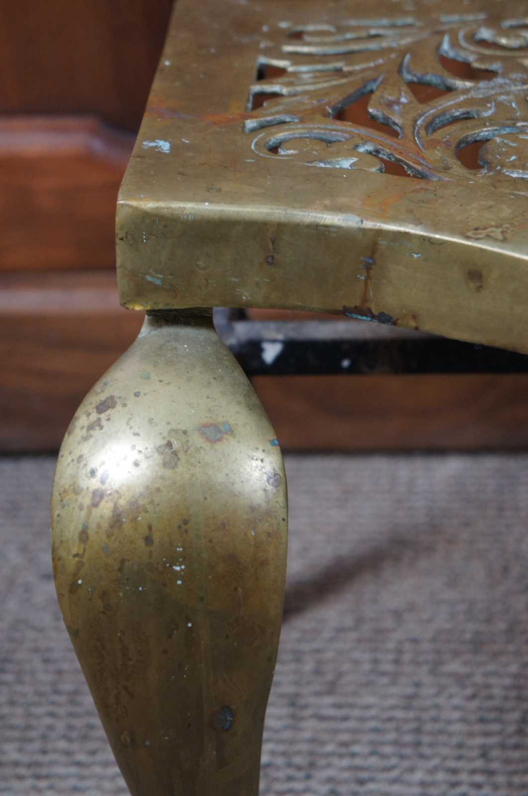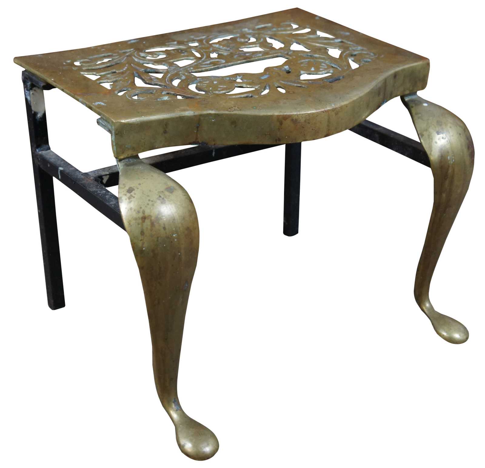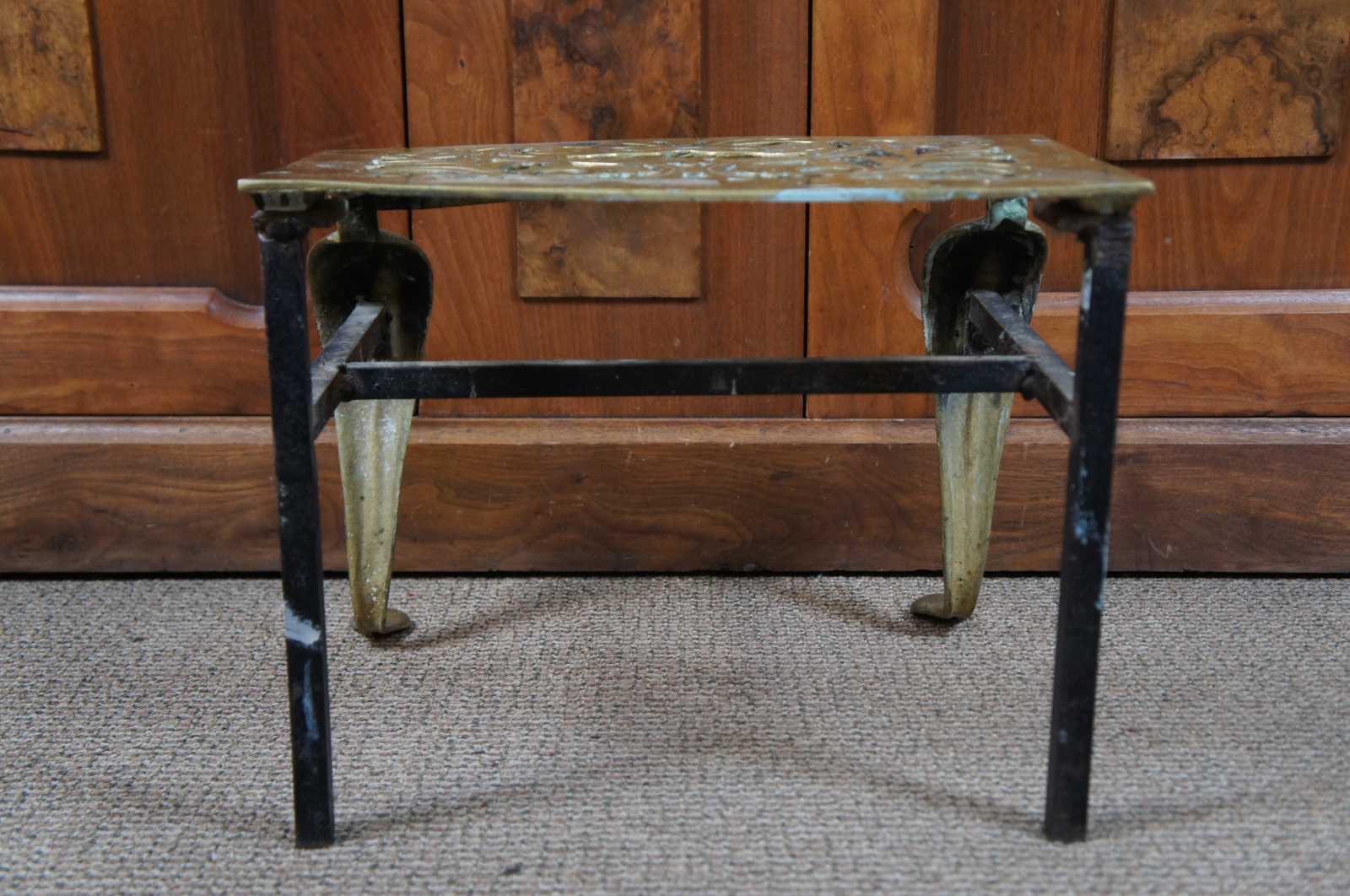 An exceptional and rare early 19th century brass and cast iron fireplace trivet or footman stool. Made by Old World FDRY Guild in 1809. Great for use as a bench or stand. Features cabriole front legs and pierced / reticulated leaf pattern design along the top.