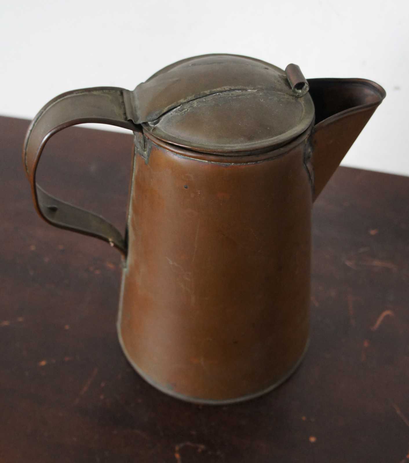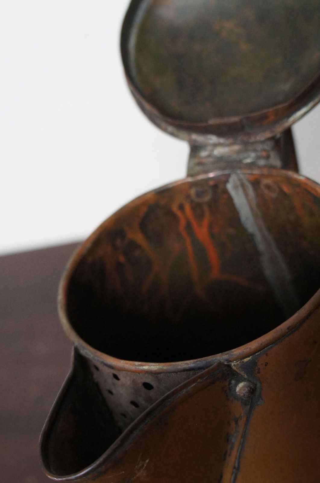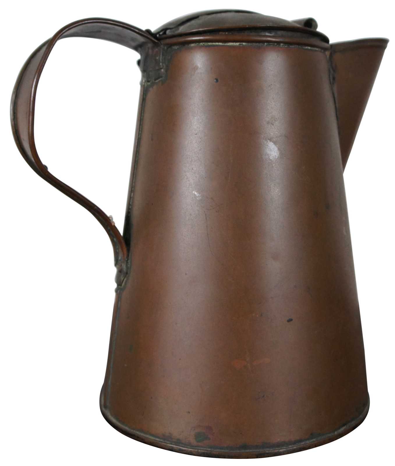 Antique copper coffee pot with handle, flip top lid and strainer spout.