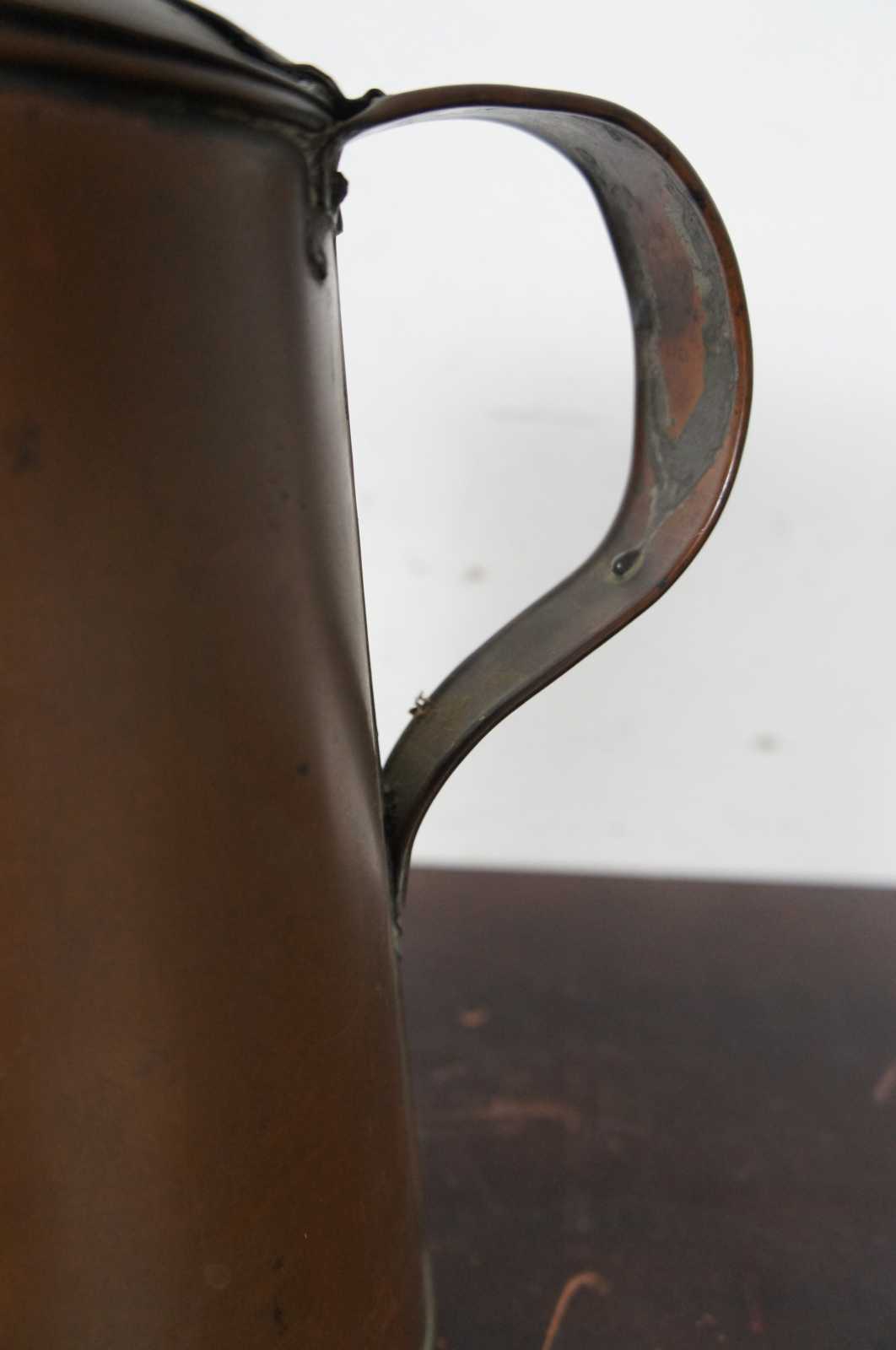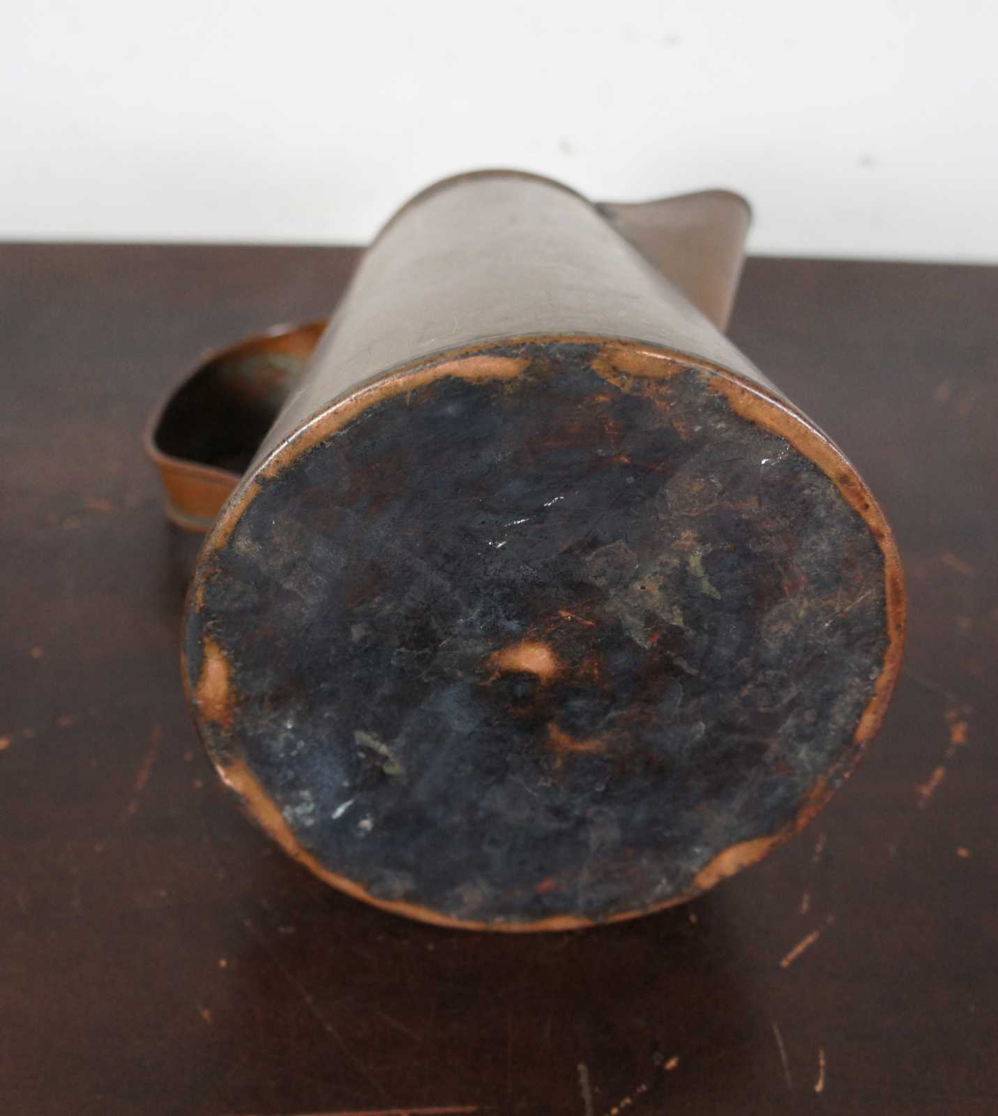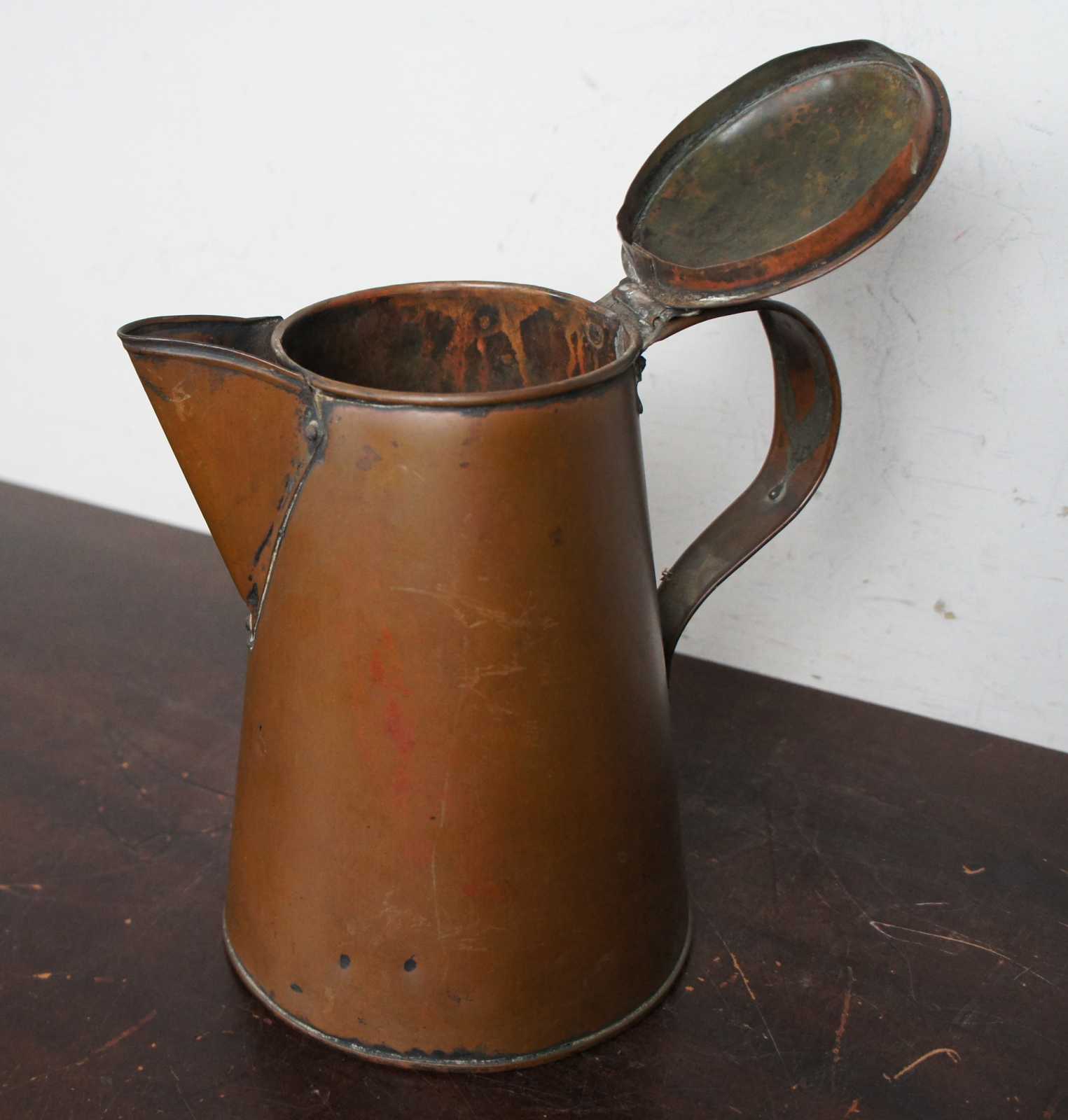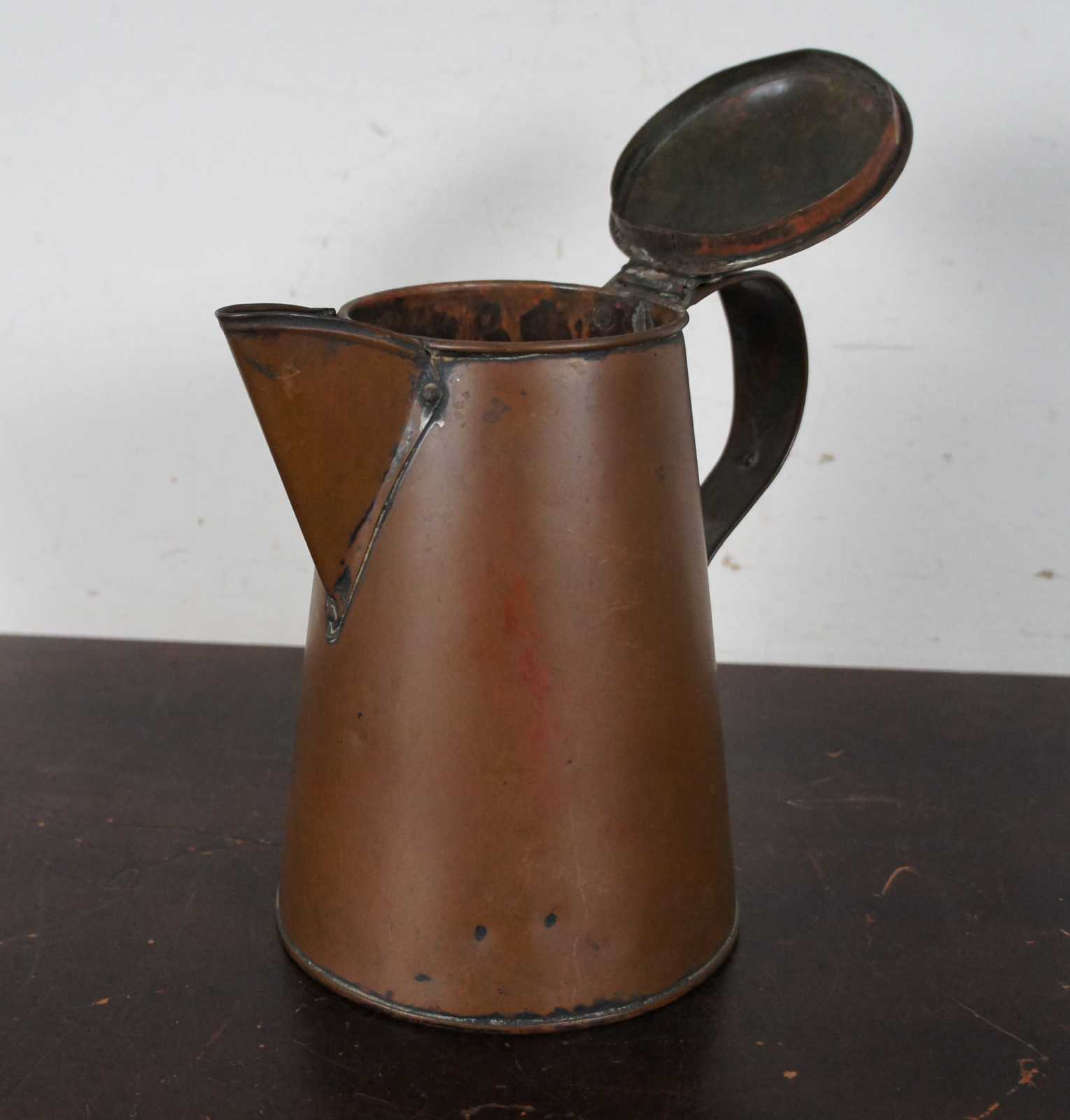 Antique copper coffee pot with handle, flip top lid and strainer spout.