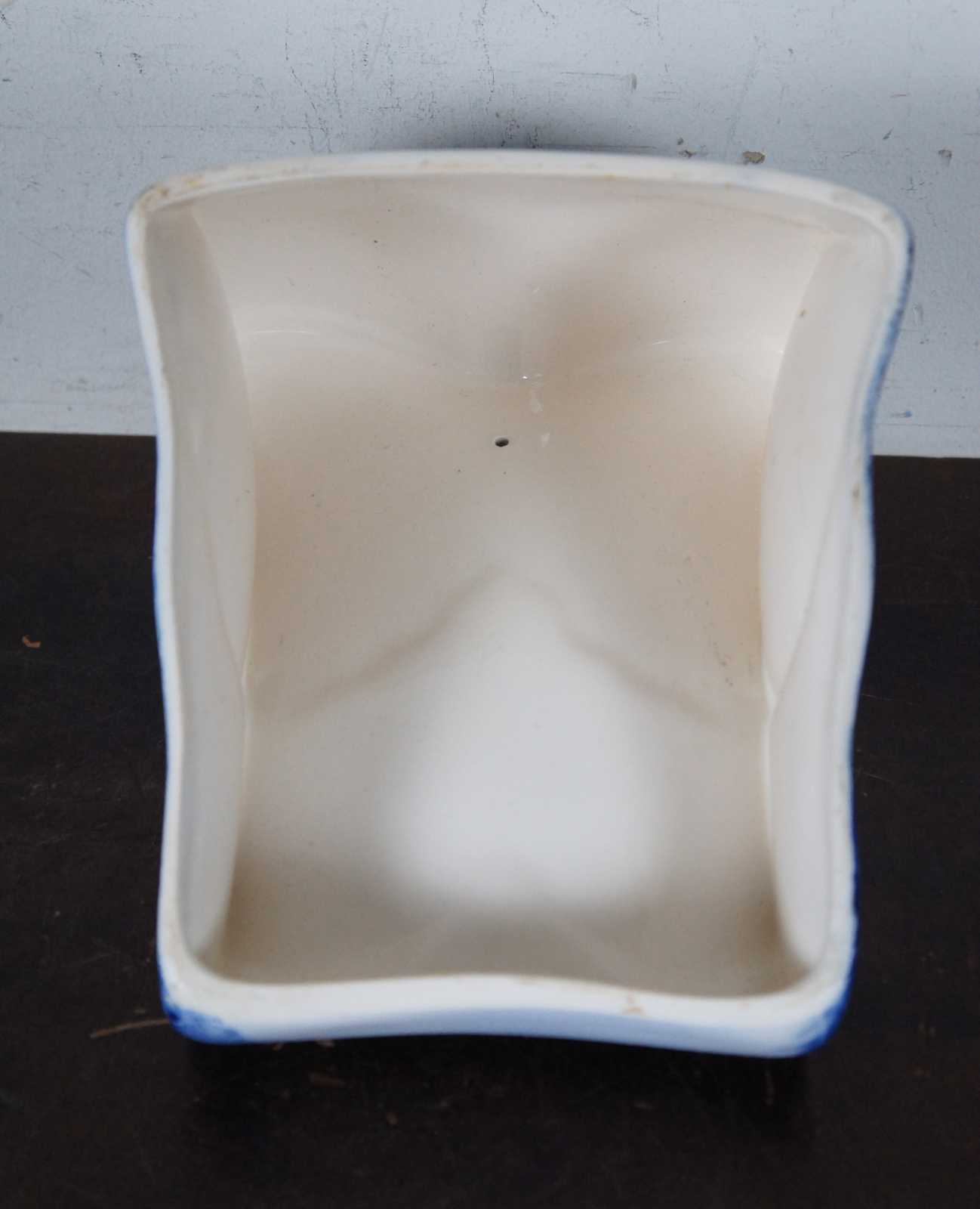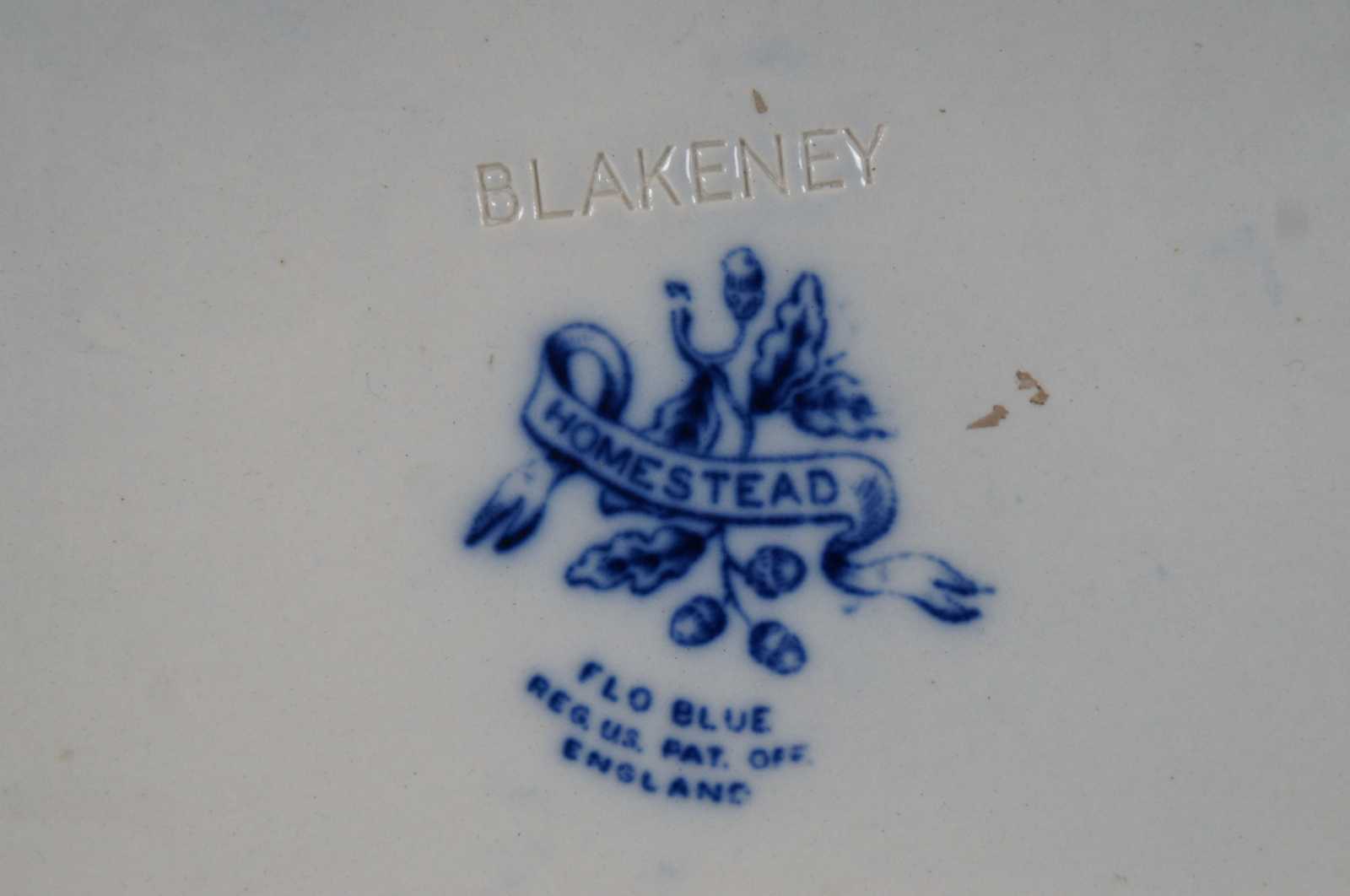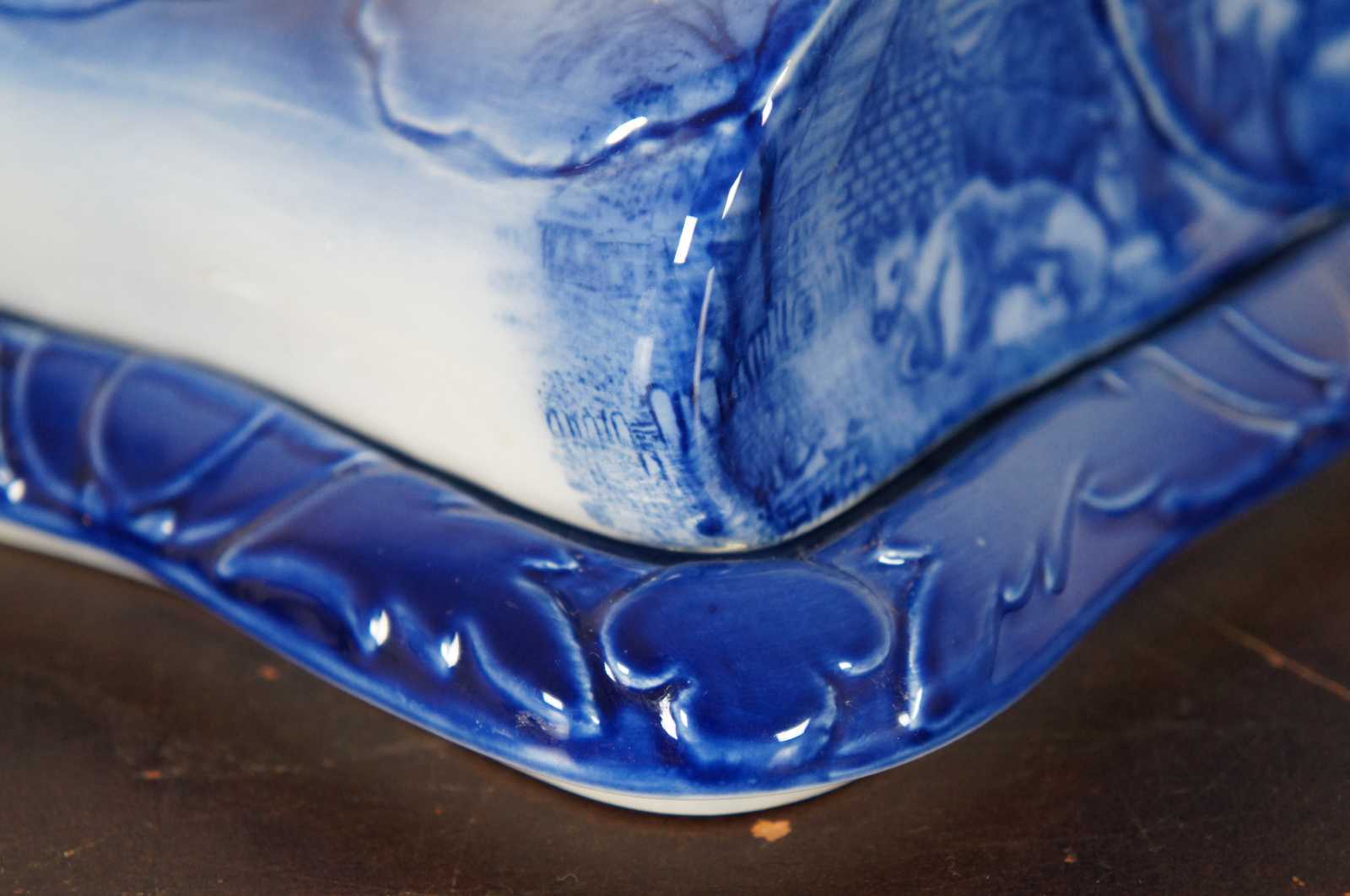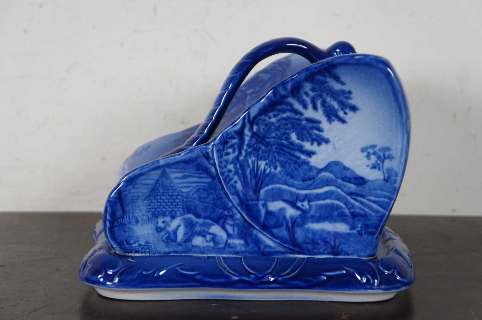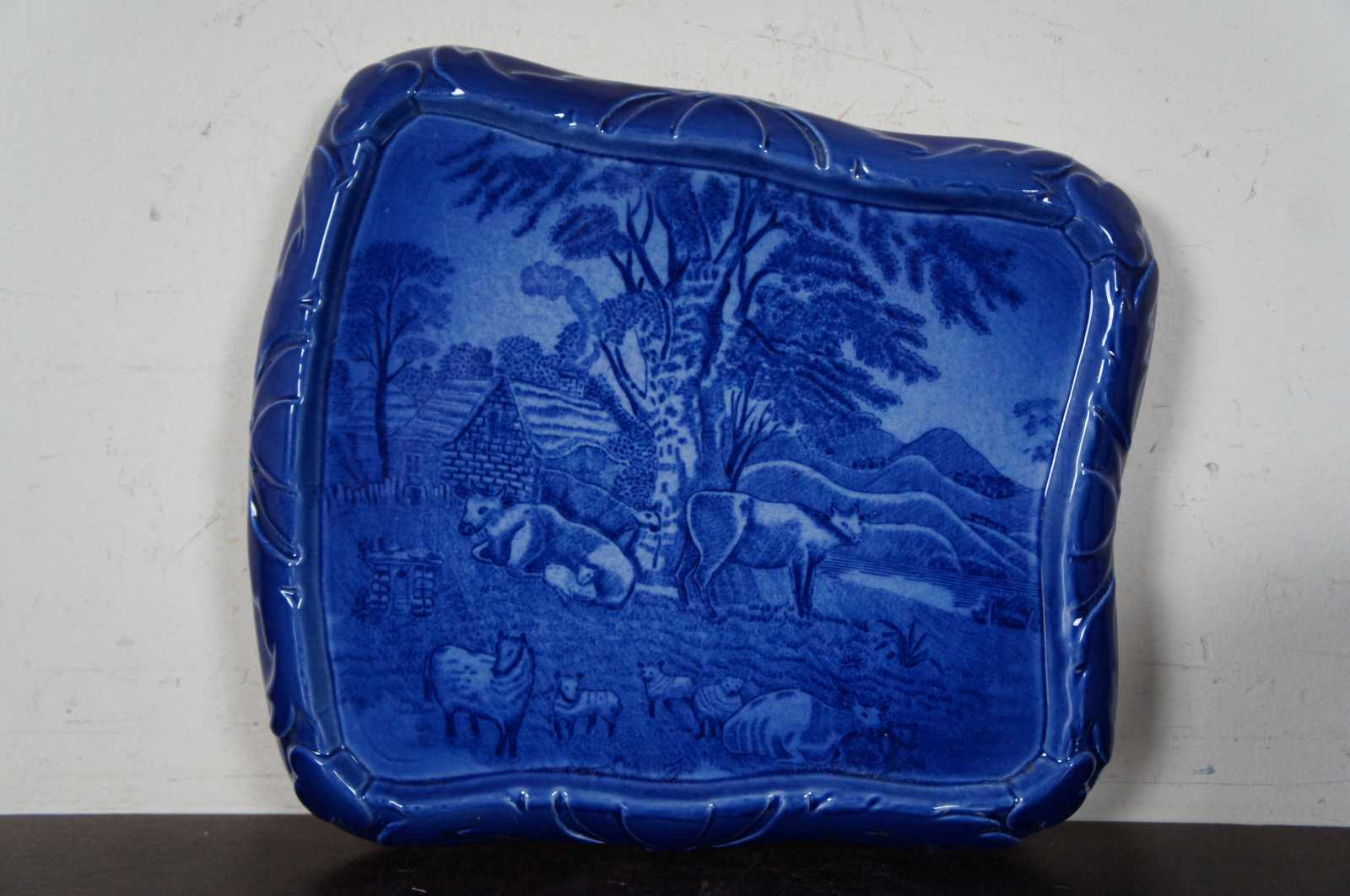 Antique Blakeney Homestead Flo Blue porcelain wedge shaped cheese dish with plate and bell, featuring a worm shaped handle and transferware scenes of cows and farmyards.