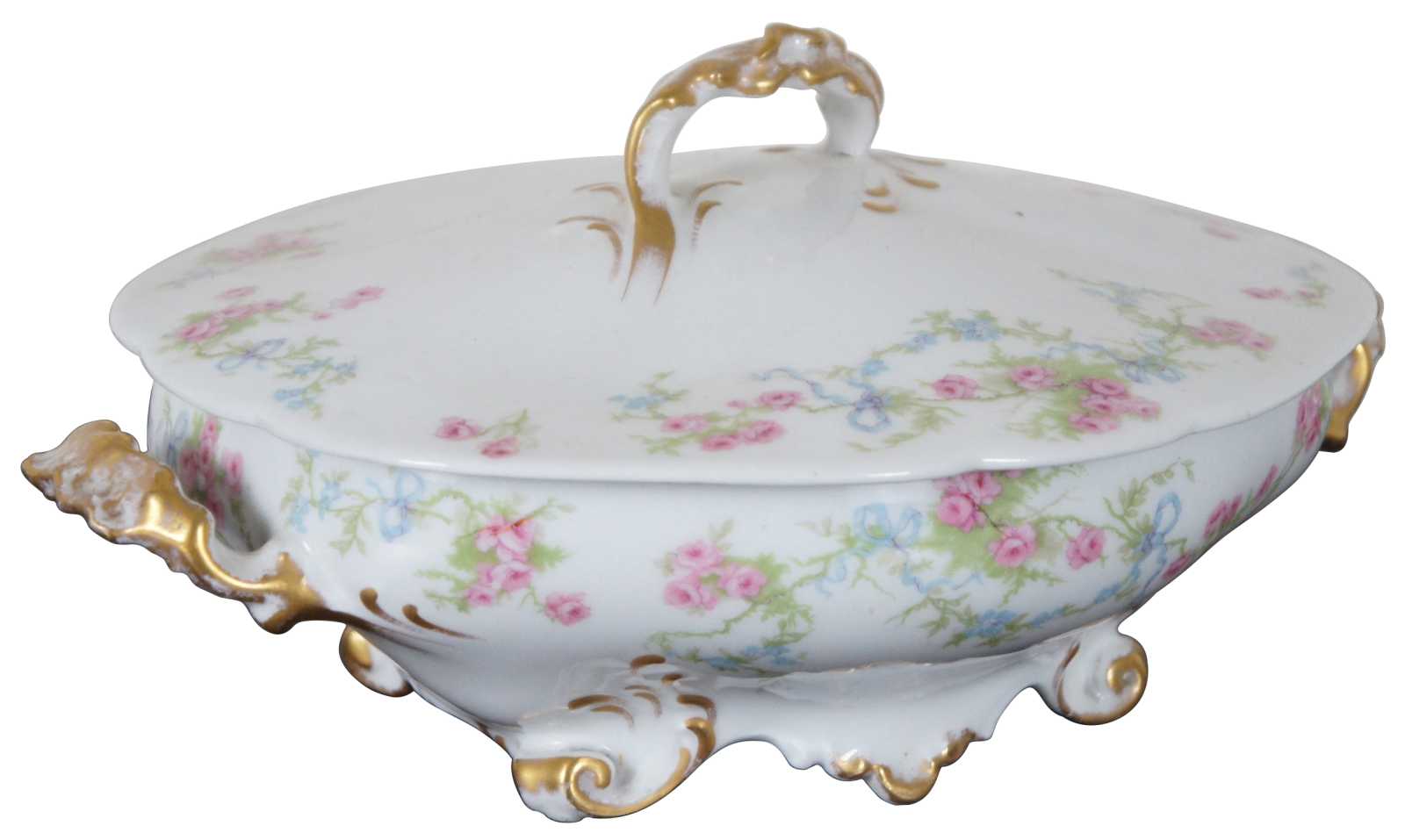 Vintage French Limoges floral porcelain oval lidded vegetable dish with gilded feet and handles, sold by Marshall Field & Co.