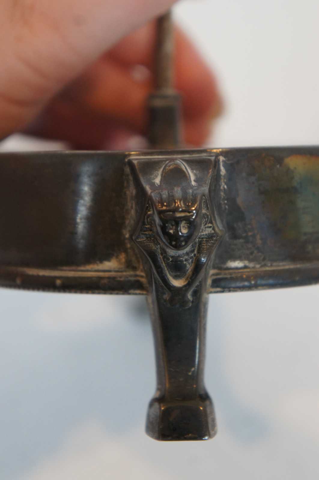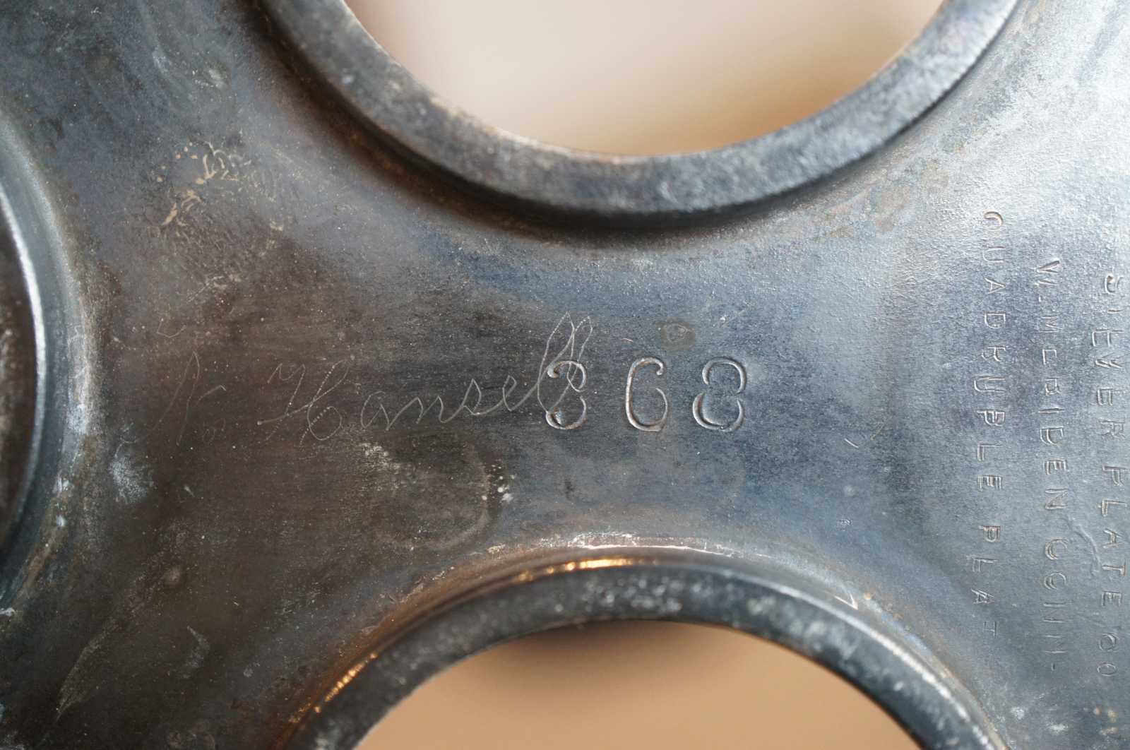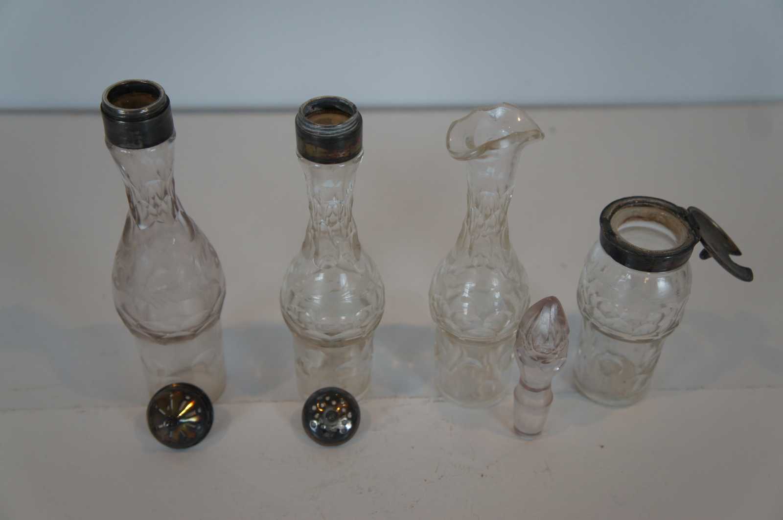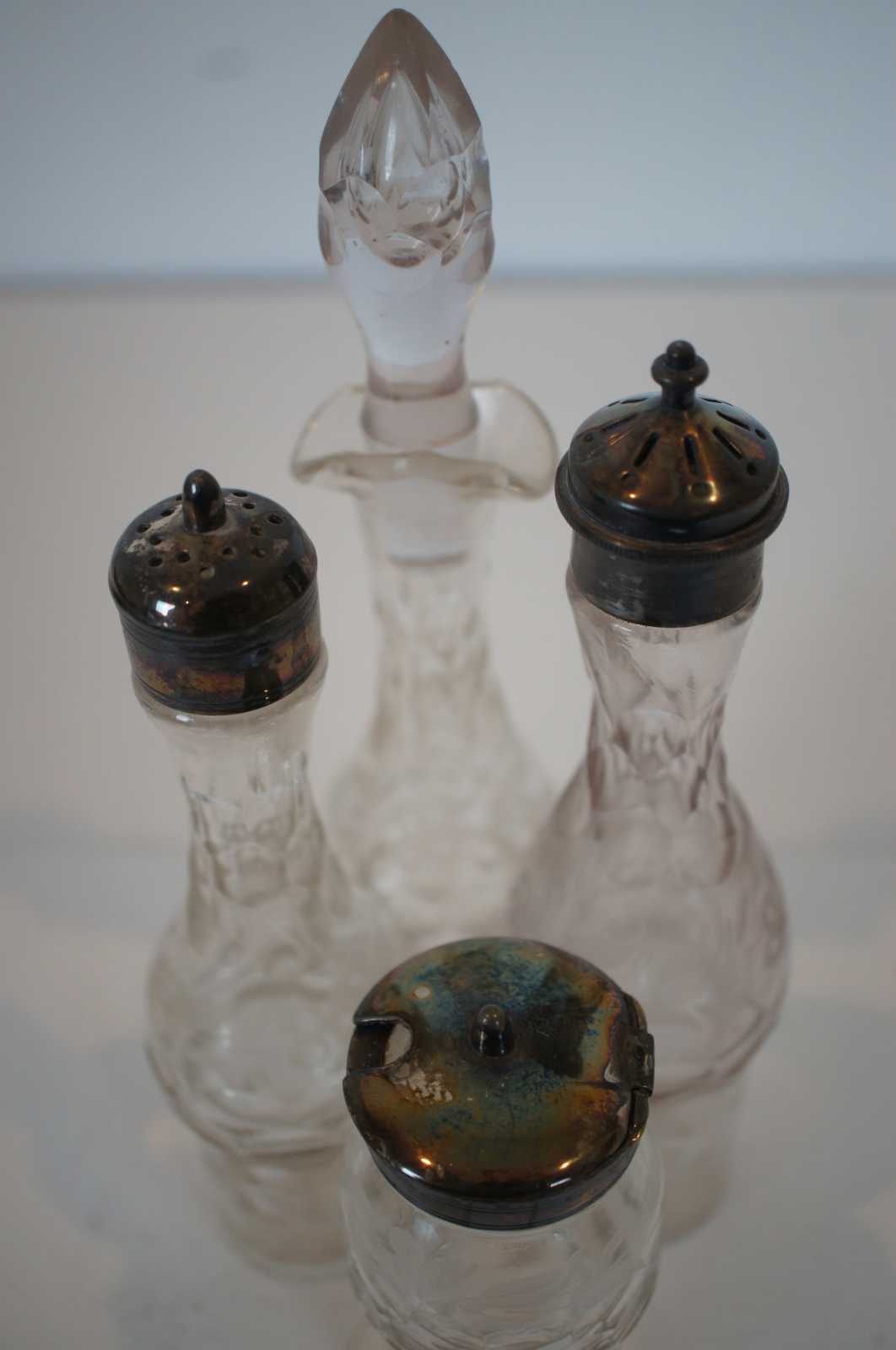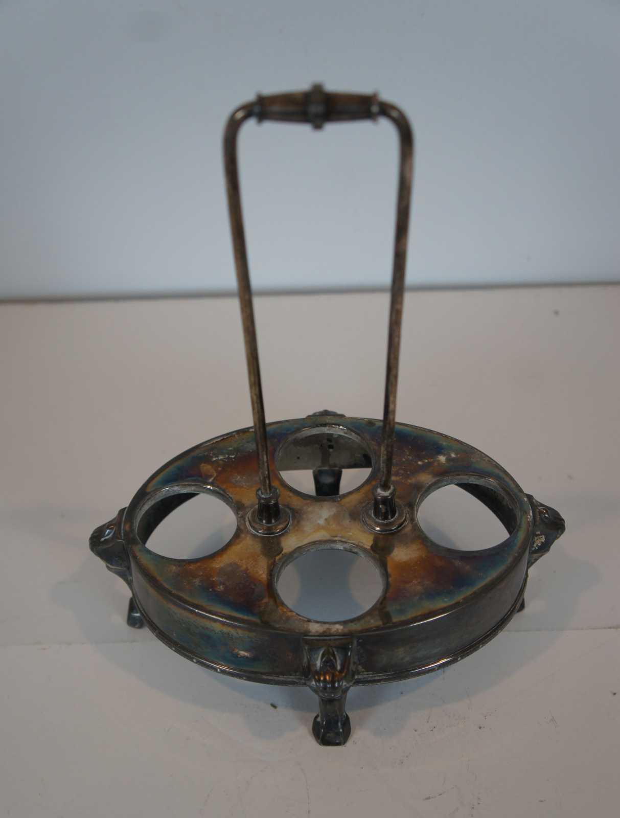Antique five piece Meriden Silverplate Co cruet set with caryatid accents. Features a caddy, two shakers, one mustard pot and one oil/vinegar bottle.