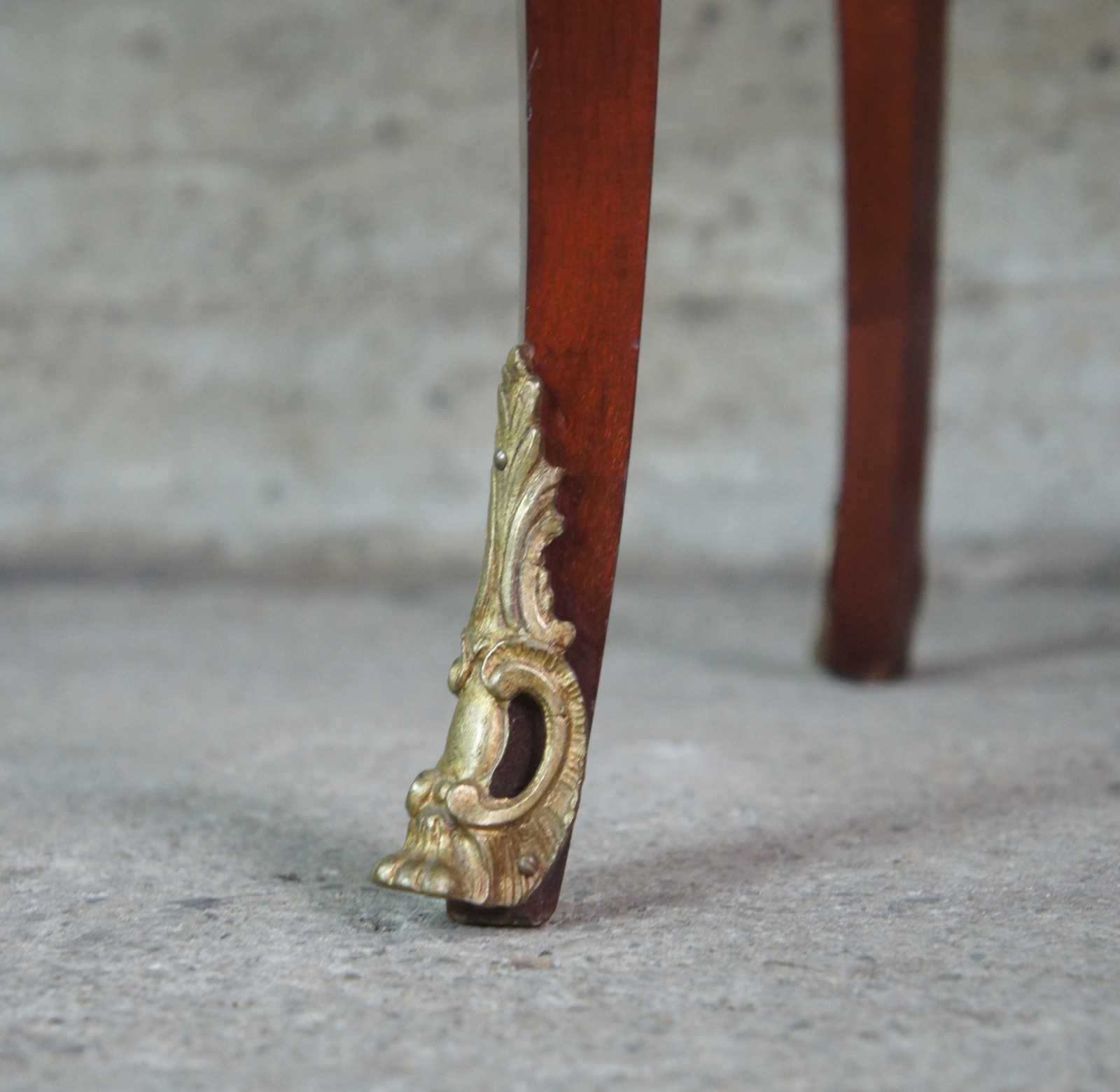An elegant pair of French Louis XVI style kidney bean shaped bedside tables or commode chests, circa 1940s. Made from walnut with a nice matchbook veneer, brass ormolu mounts, inset marble tops and a brass gallery. Each chest features three drawers and is supported by long cabriole legs. Made in Spain