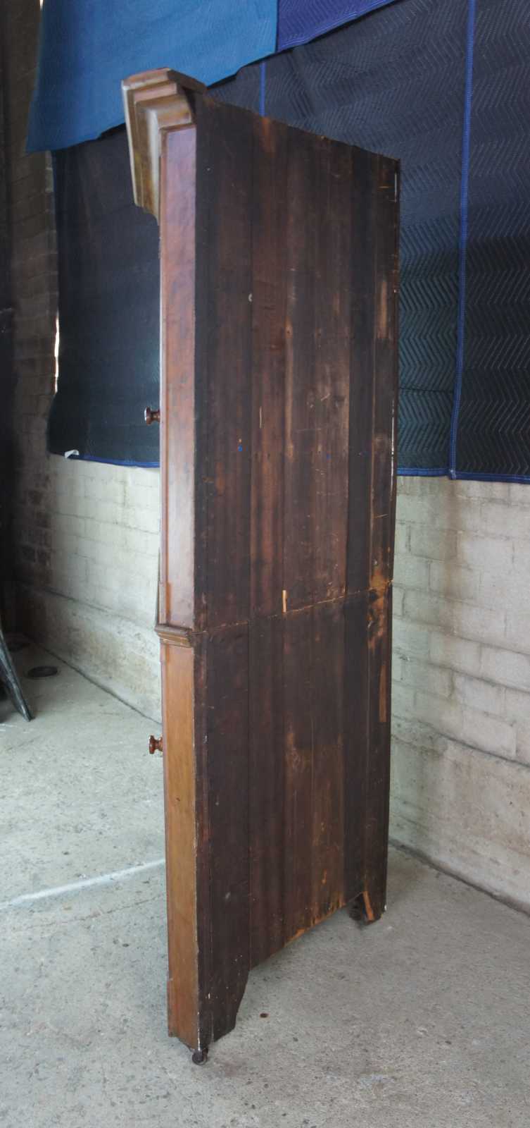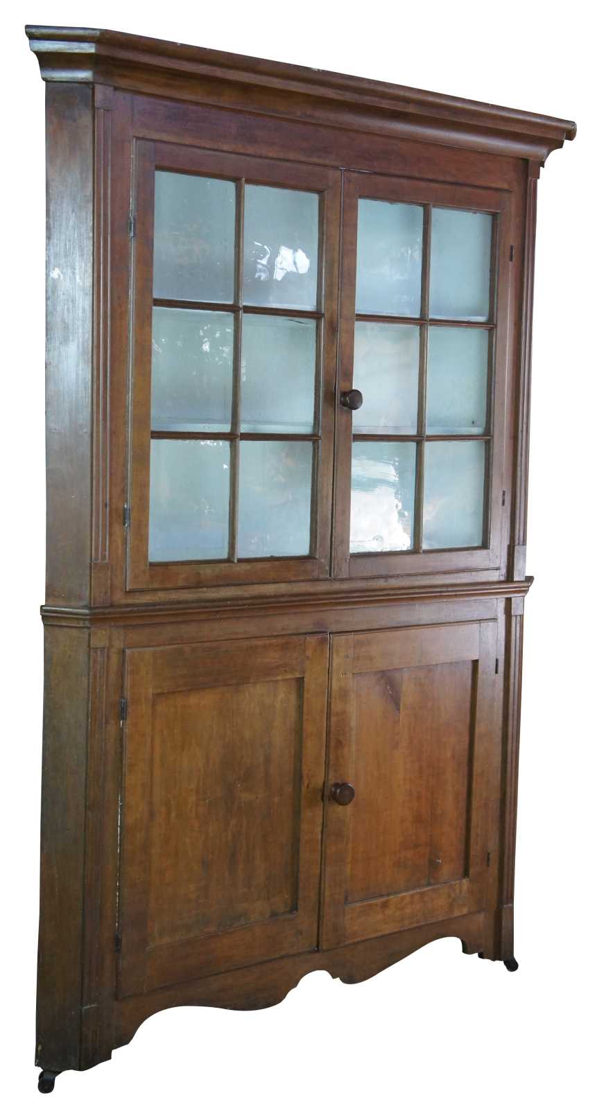 A stately late 18th Century Early American Pennsylvania corner cupboard or cabinet. Made of pine featuring triangular form with serpentine and fluted accents, original glazed wavy glass doors and double casters.