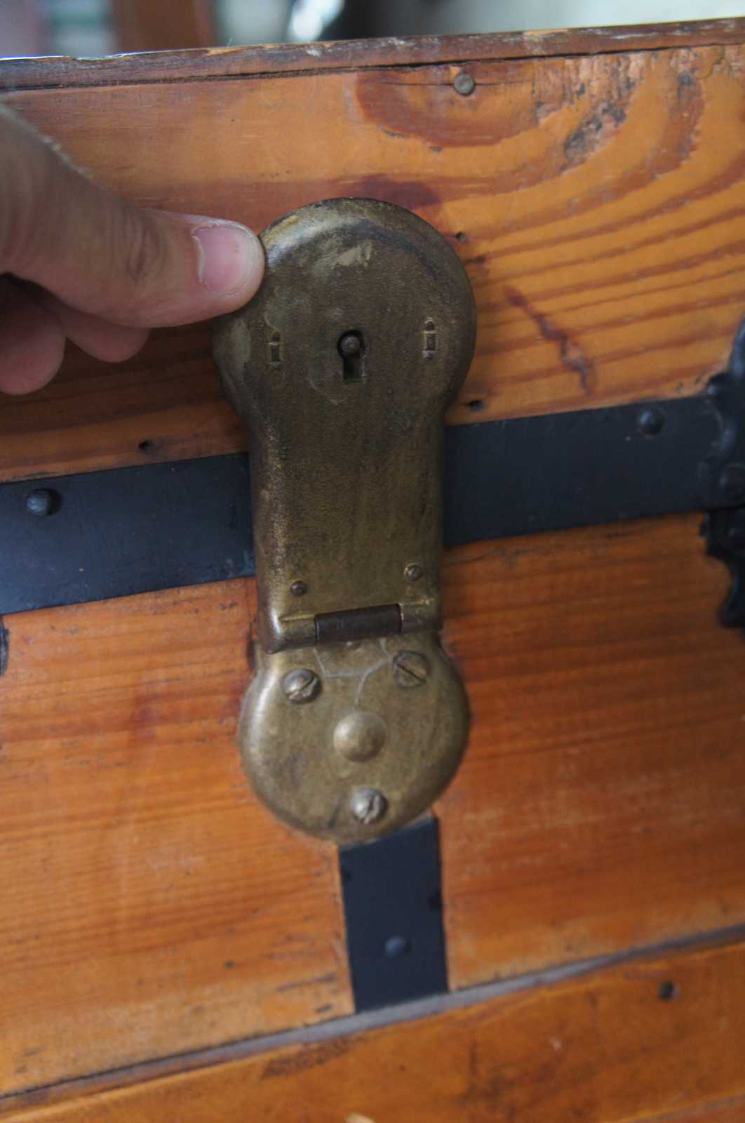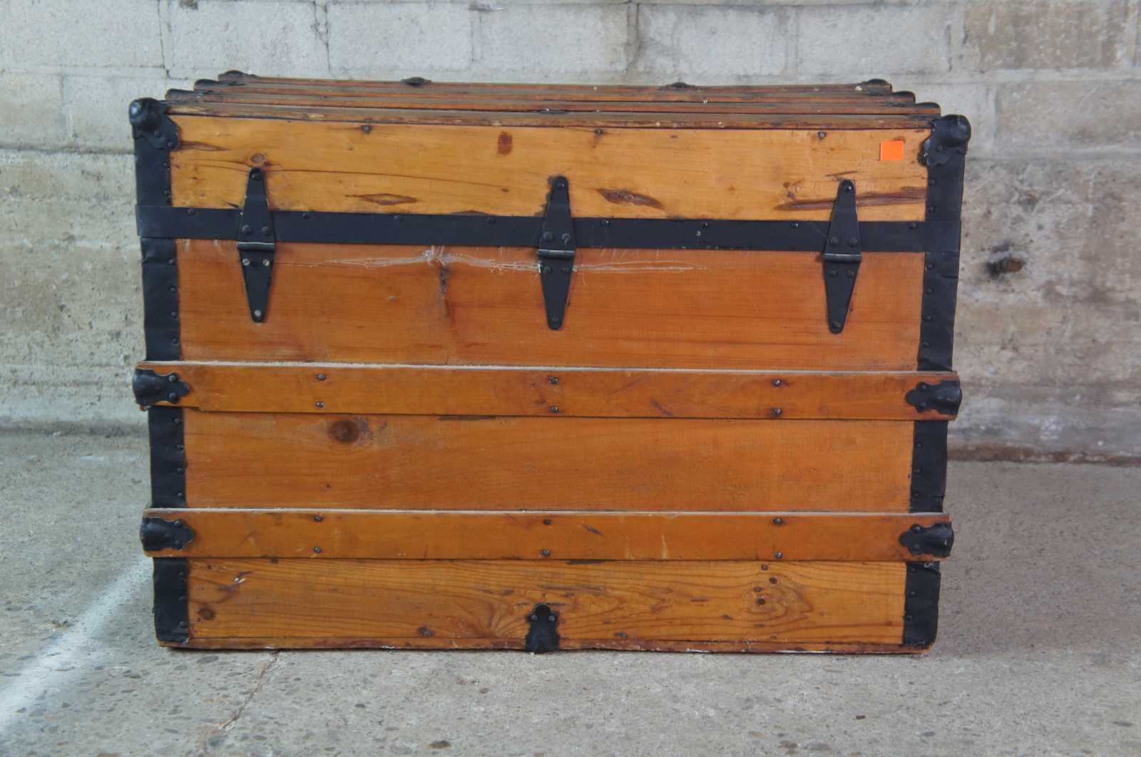 Antique Victorian steamer trunk or chest. Made of pine featuring metal and wood banding, and leather straps.