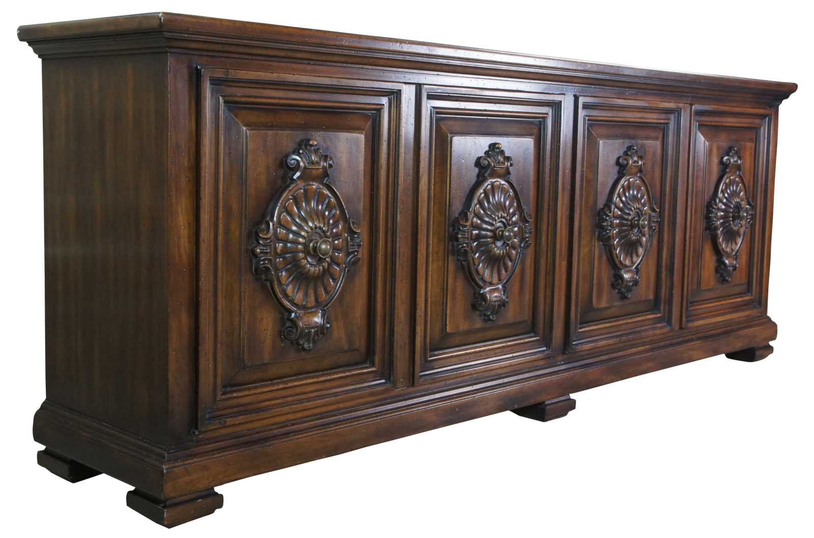 Mid 20th Century John Widdicomb credenza, buffet, or console. Traditional styling with French flare. Made of walnut featuring four paneled doors with thick carvings that lead to two storage cabinets. The cabinet is supported by square block feet with inset rollers allowing for ease of movement.