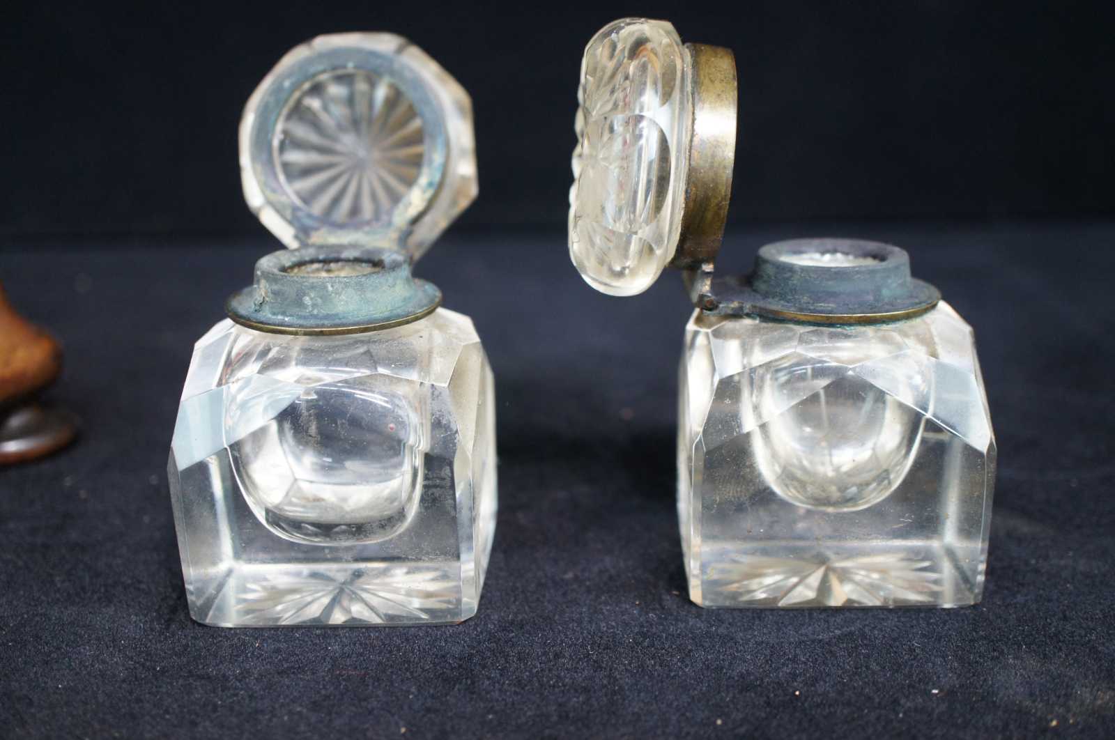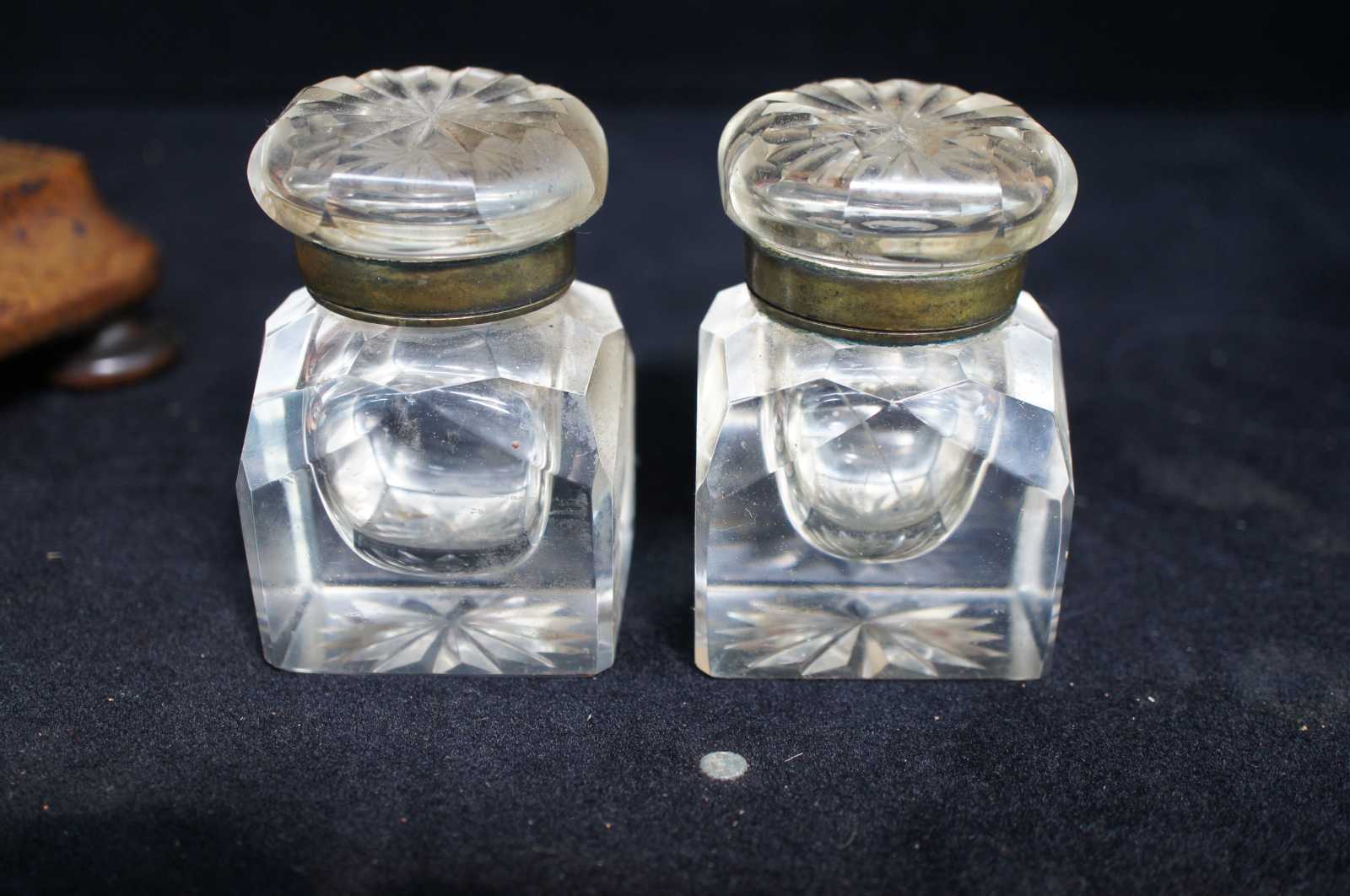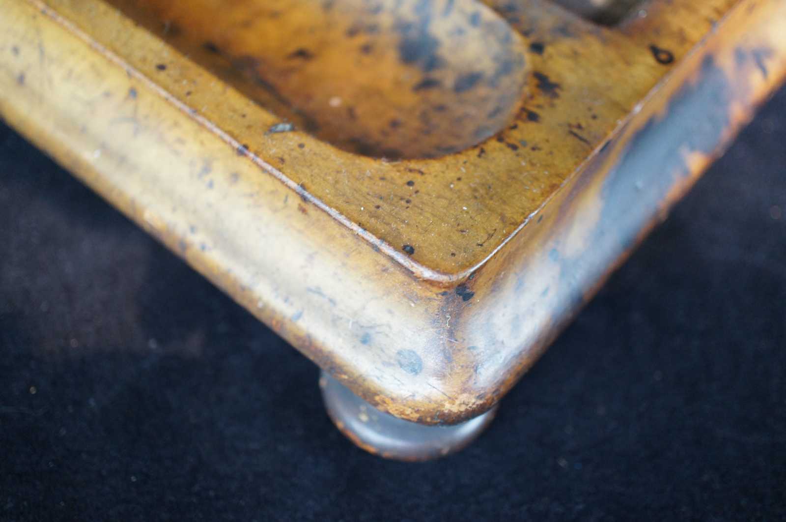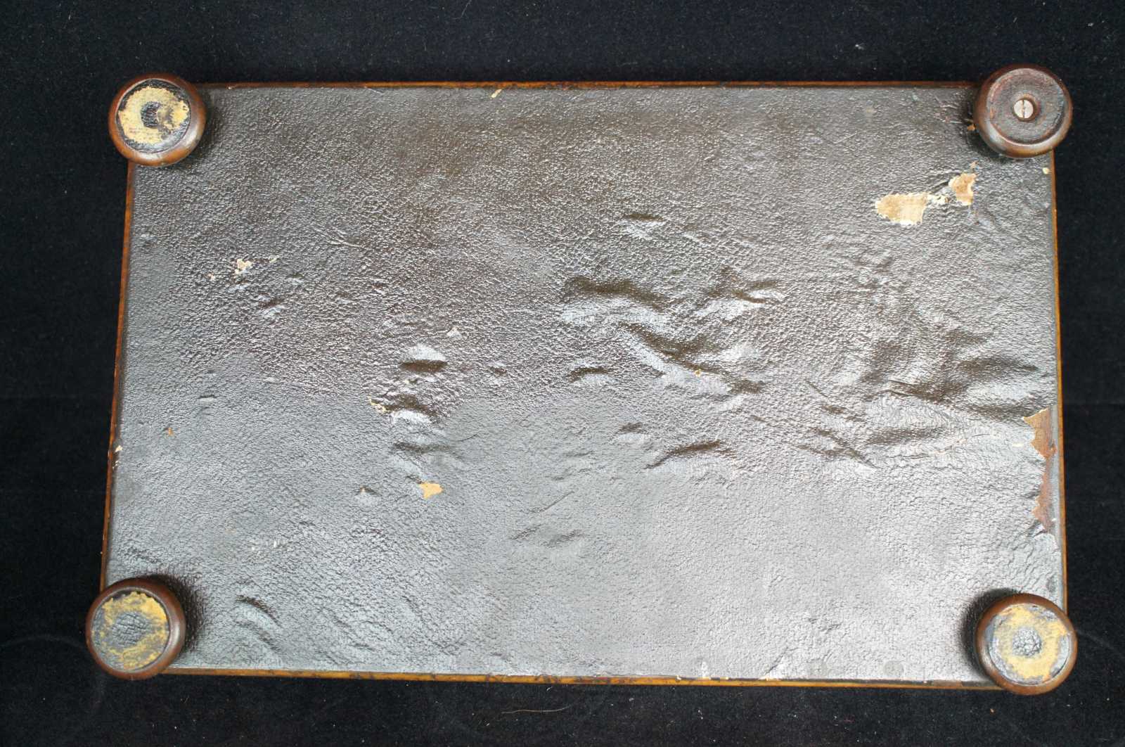 Good antique condition, wear and distressing commensurate with age and use, edge wear to caddy stand, oxidation to brass on inkwell