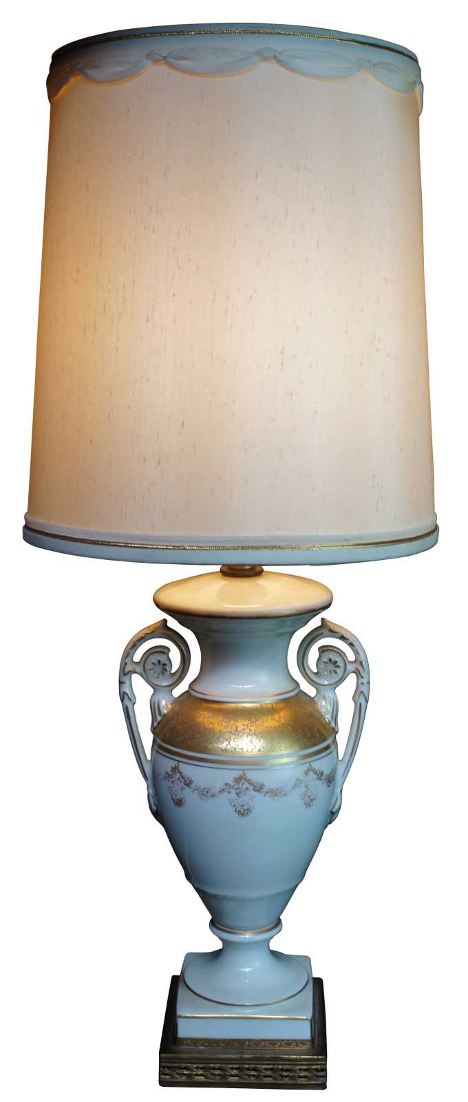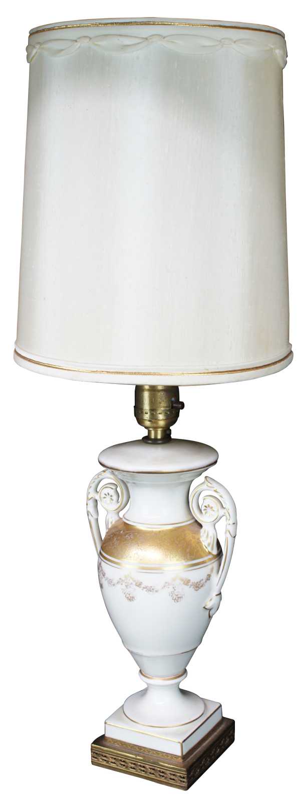 Vintage mid century porcelain trophy urn lamp featuring ornate handles and neoclassical gold details.