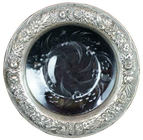 Antique repousse sterling silver and glass dish or bowl featuring floral etchings and high relief.