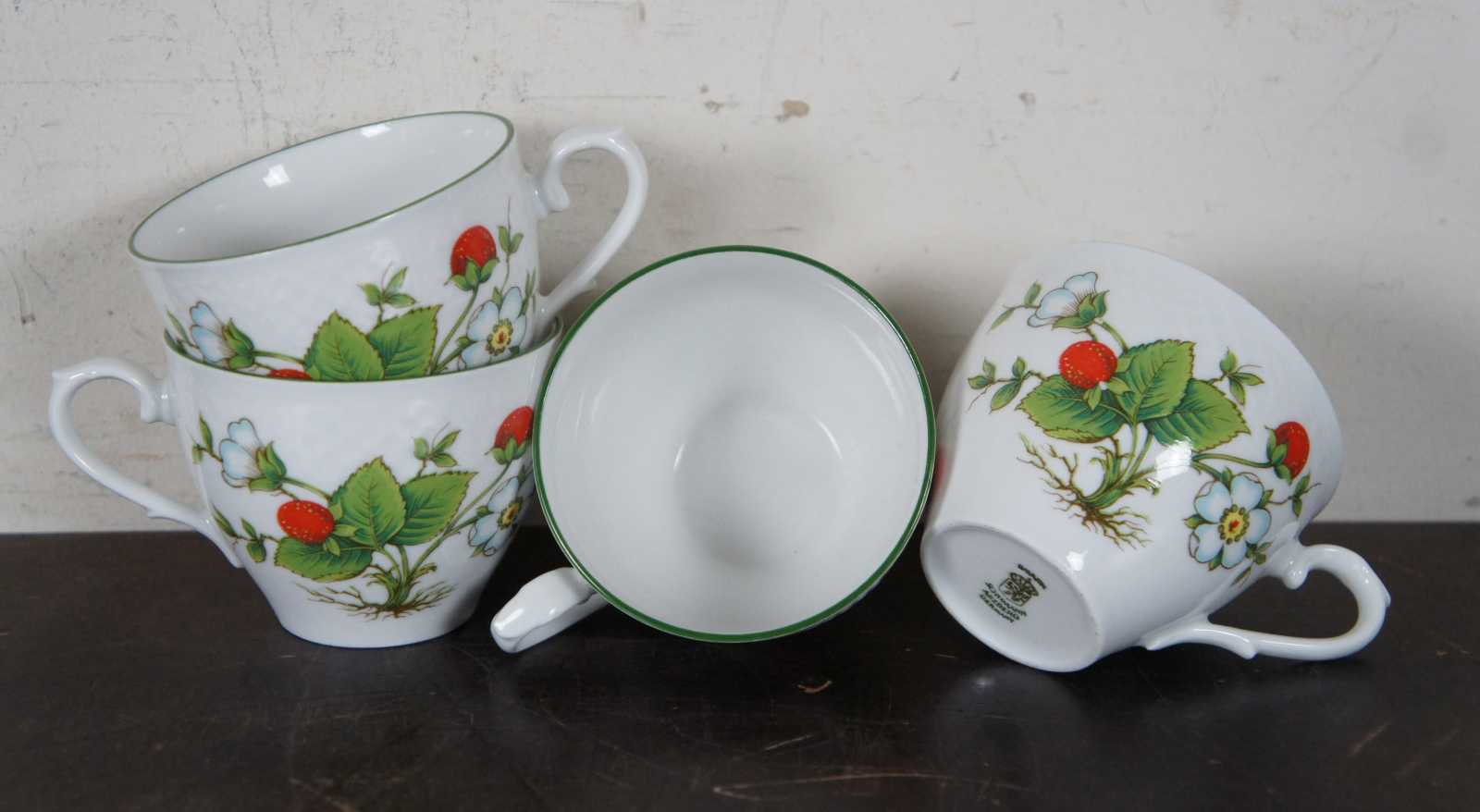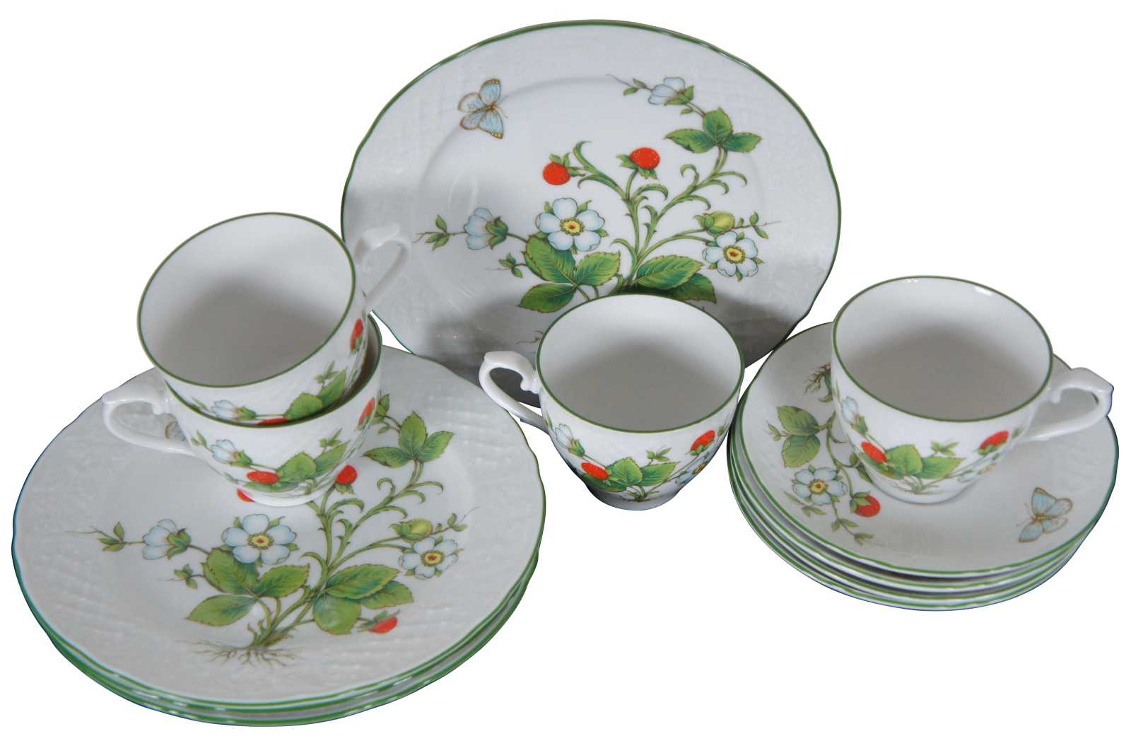 Vintage Schumann Bavarian porcelain tea cups, saucers and dessert plates in the Wild Strawberry pattern.