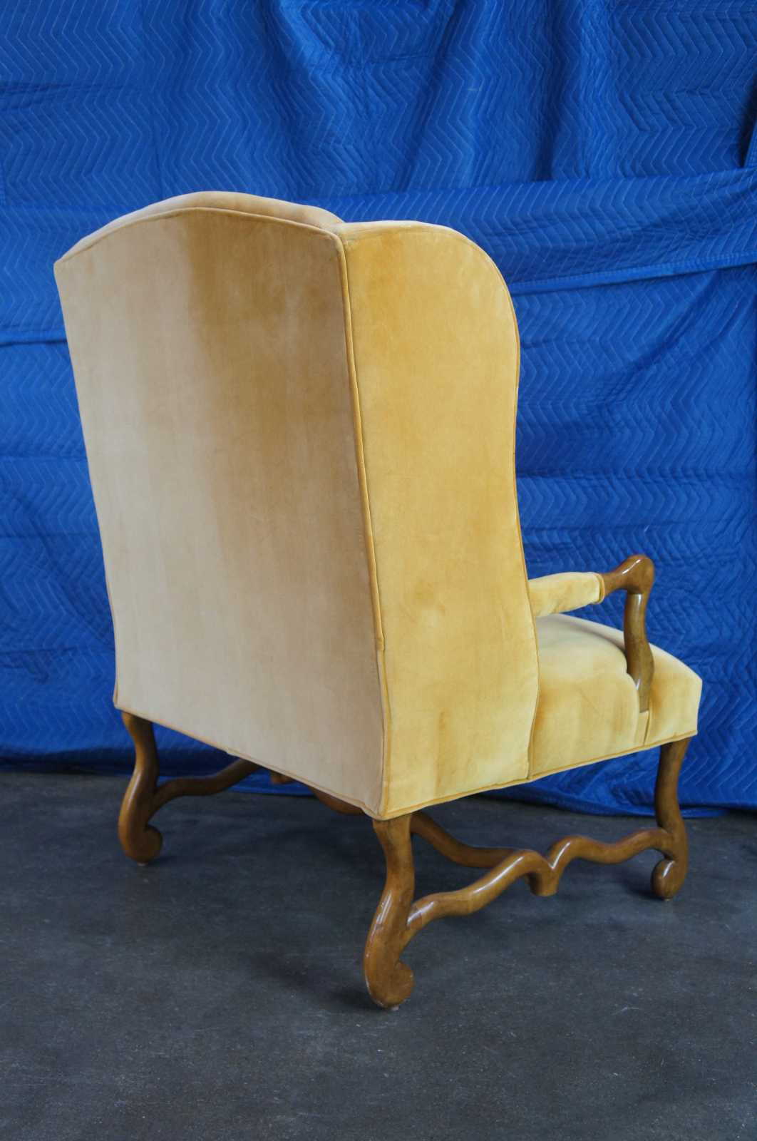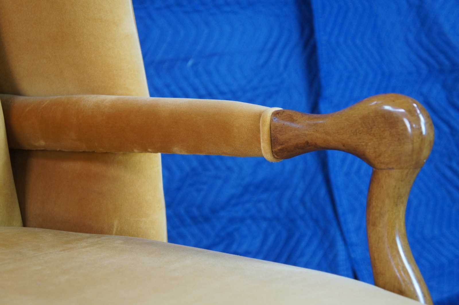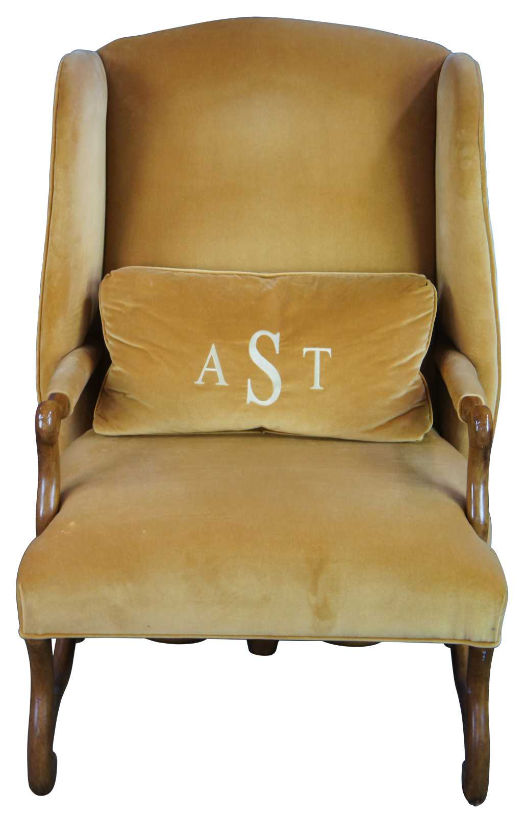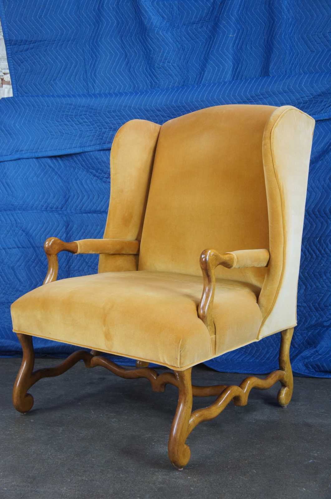 Magnificent Late 20th Century upholstered wingback armchair. Drawing inspiration from Old World George II and Modern styling. Features a pronounced wing leading to open arms allowing the natural wood to glow. Upholstered in a gold toned suede upholstery and supported by scrolled legs with a serpentine carved H stetcher..