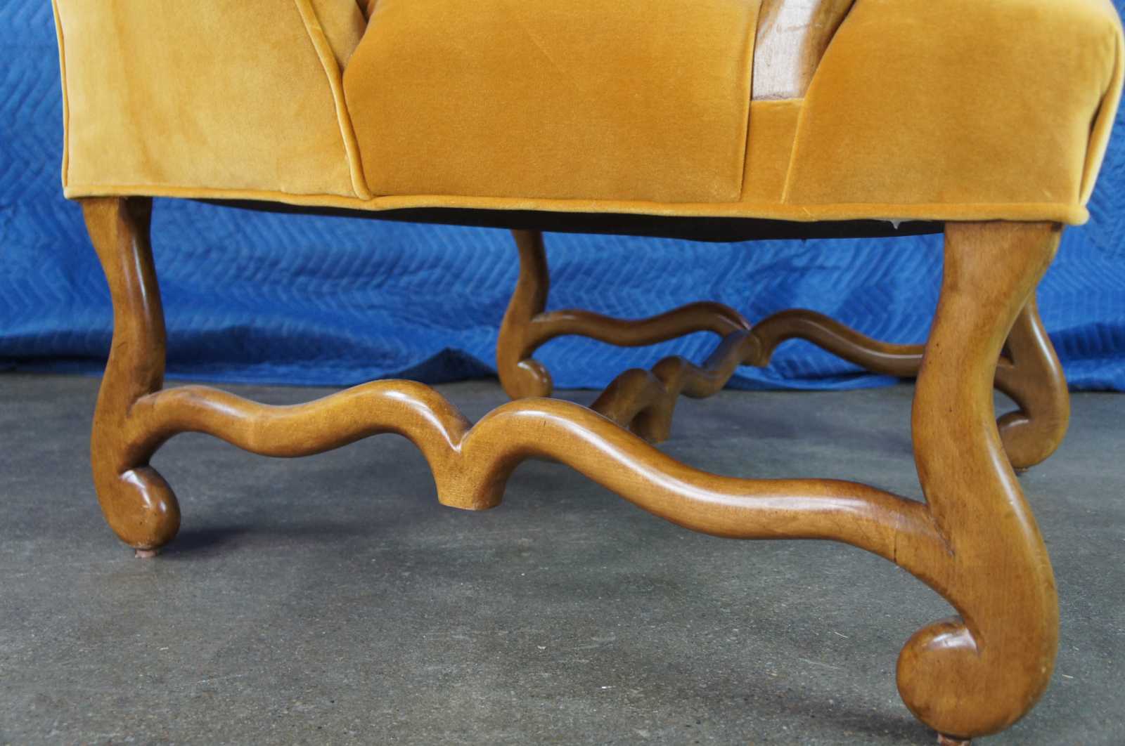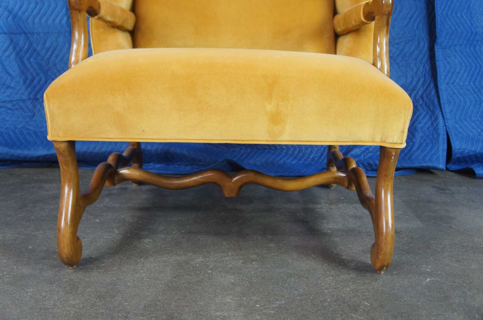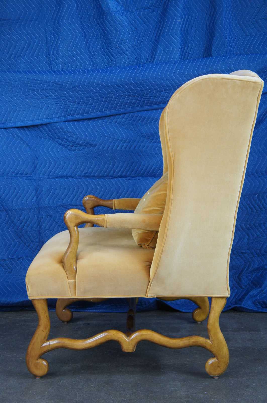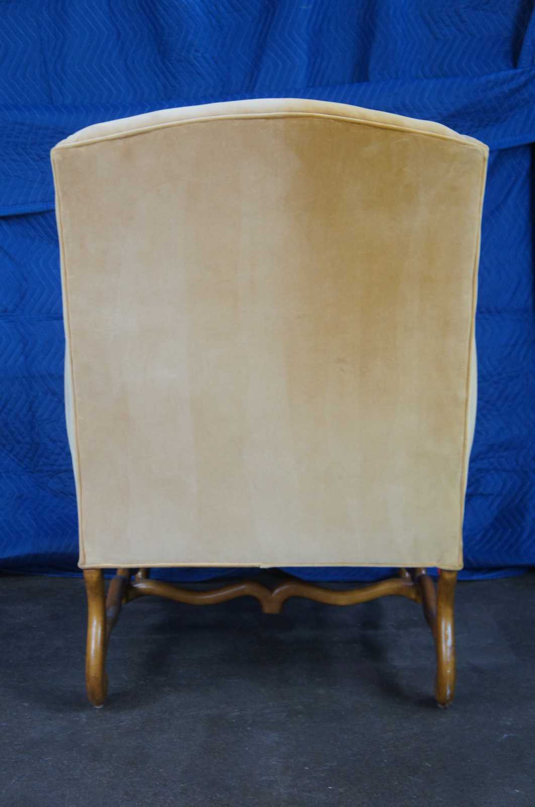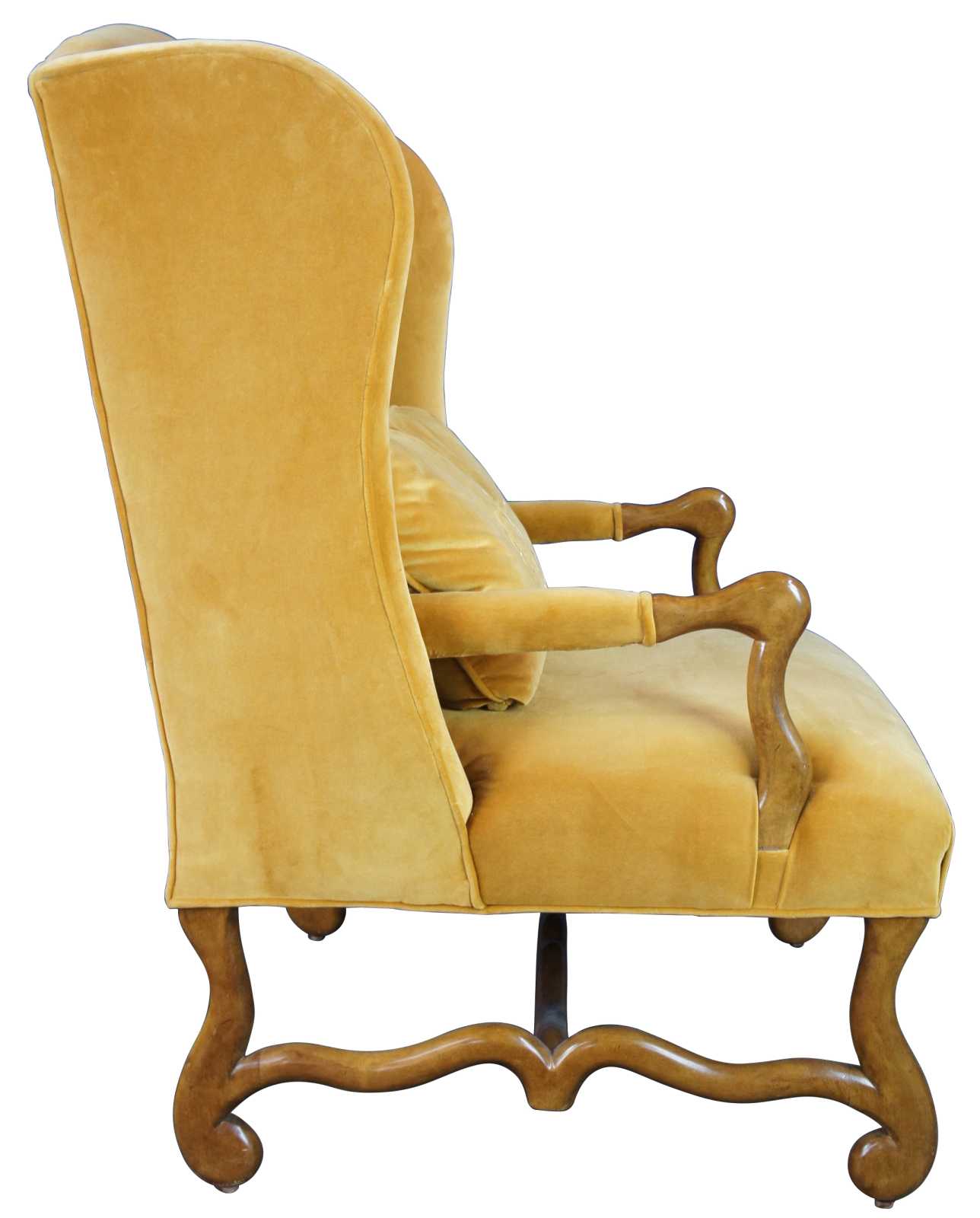 Magnificent Late 20th Century upholstered wingback armchair. Drawing inspiration from Old World George II and Modern styling. Features a pronounced wing leading to open arms allowing the natural wood to glow. Upholstered in a gold toned suede upholstery and supported by scrolled legs with a serpentine carved H stetcher..