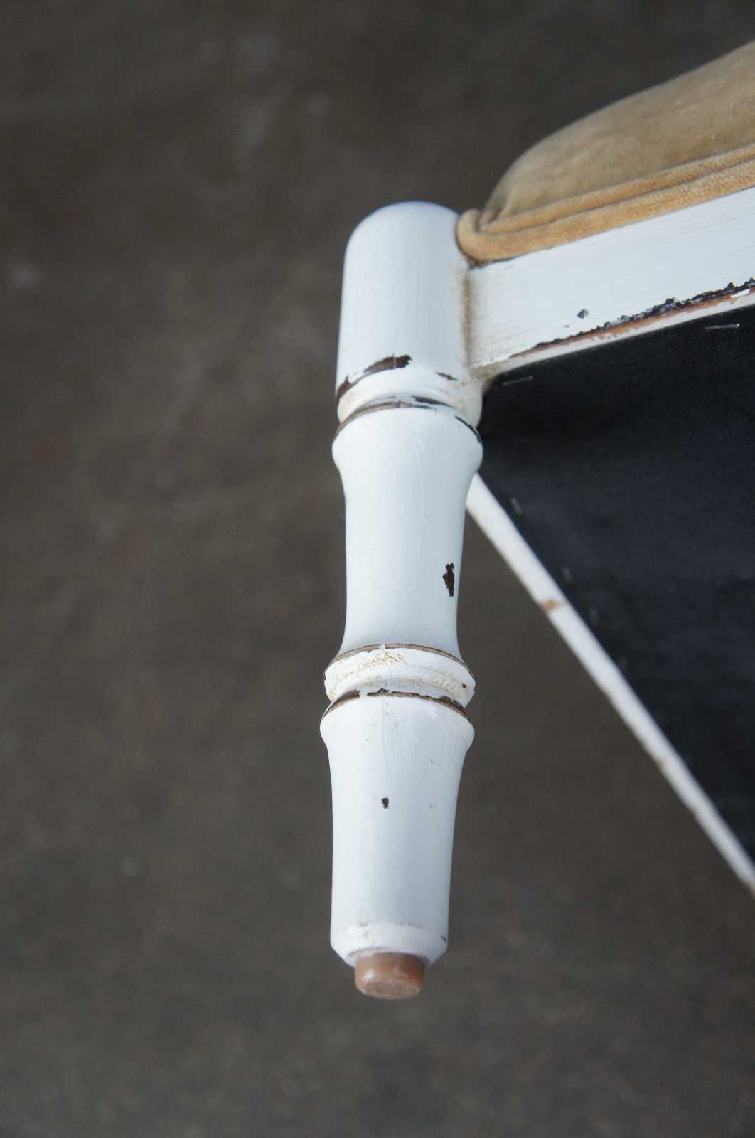 Vintage Ballard Designs square form ottoman or foot stool. Features a white distressed finish allowing the natural understones of the wood to be seen trhogh. Features turned legs and beige fabric with double cording.