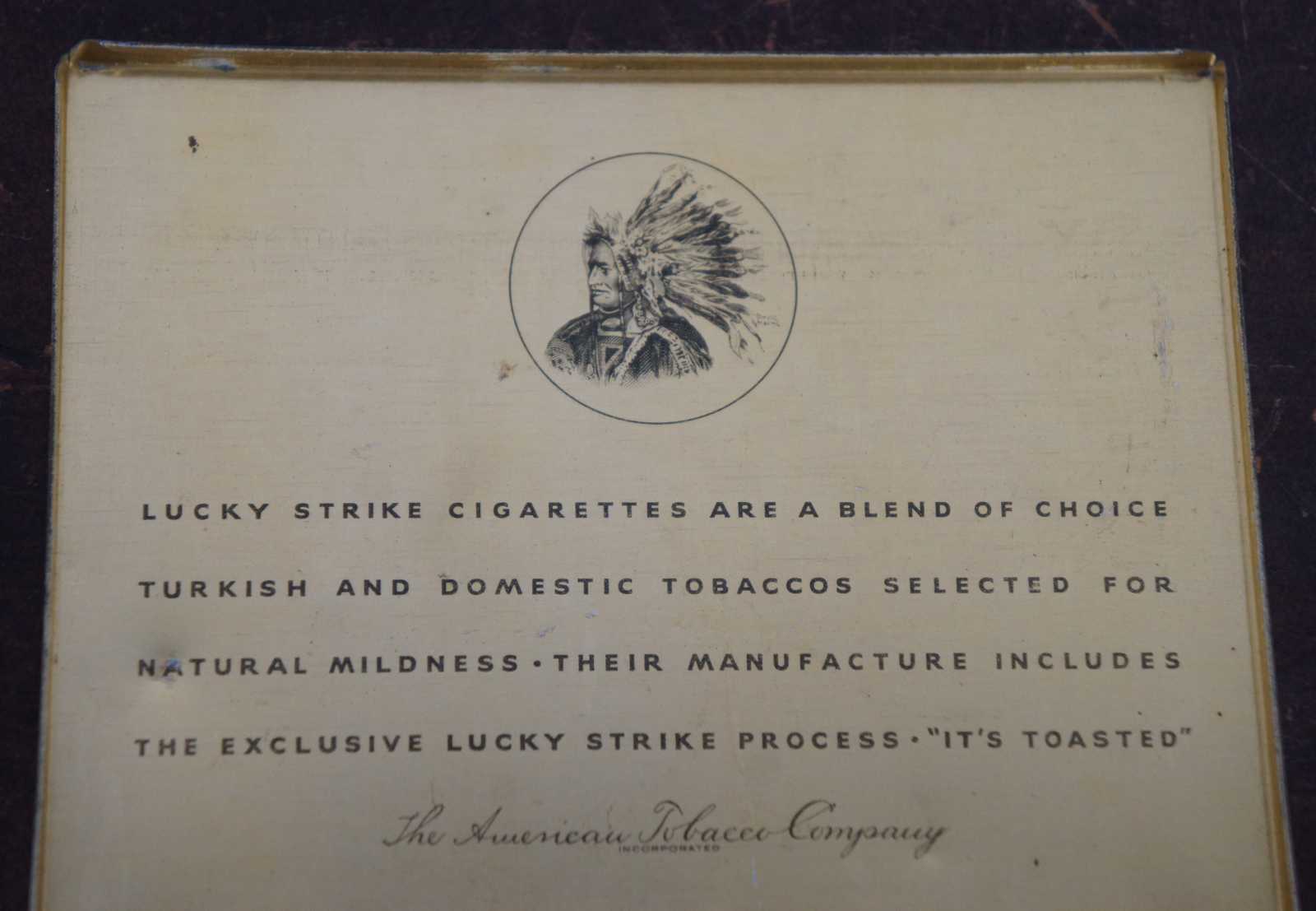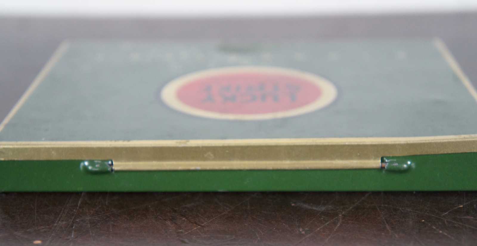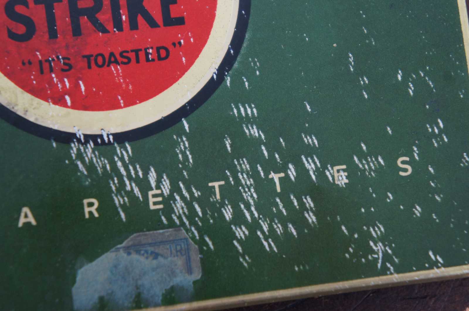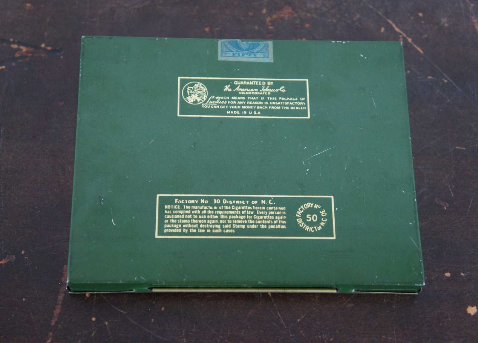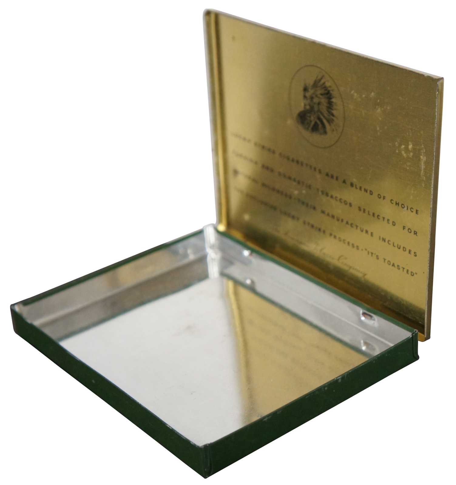 Antique 1940’s Lucky Strike brand hinged cigarette tin/box featuring the famous tag line “It’s Toasted.” The American Tobacco Co.