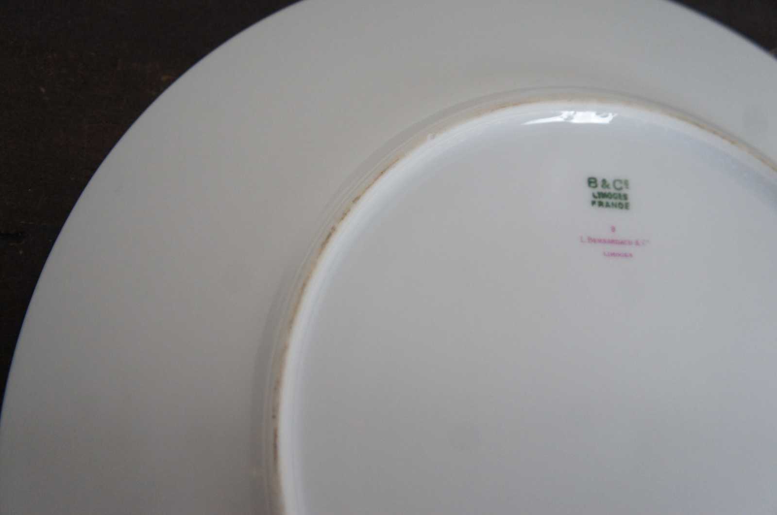 Set of eleven L. Bernardaud & Co aka B&Co Limoges porcelain dinner plates with matte black borders, floral center and gilded edges.