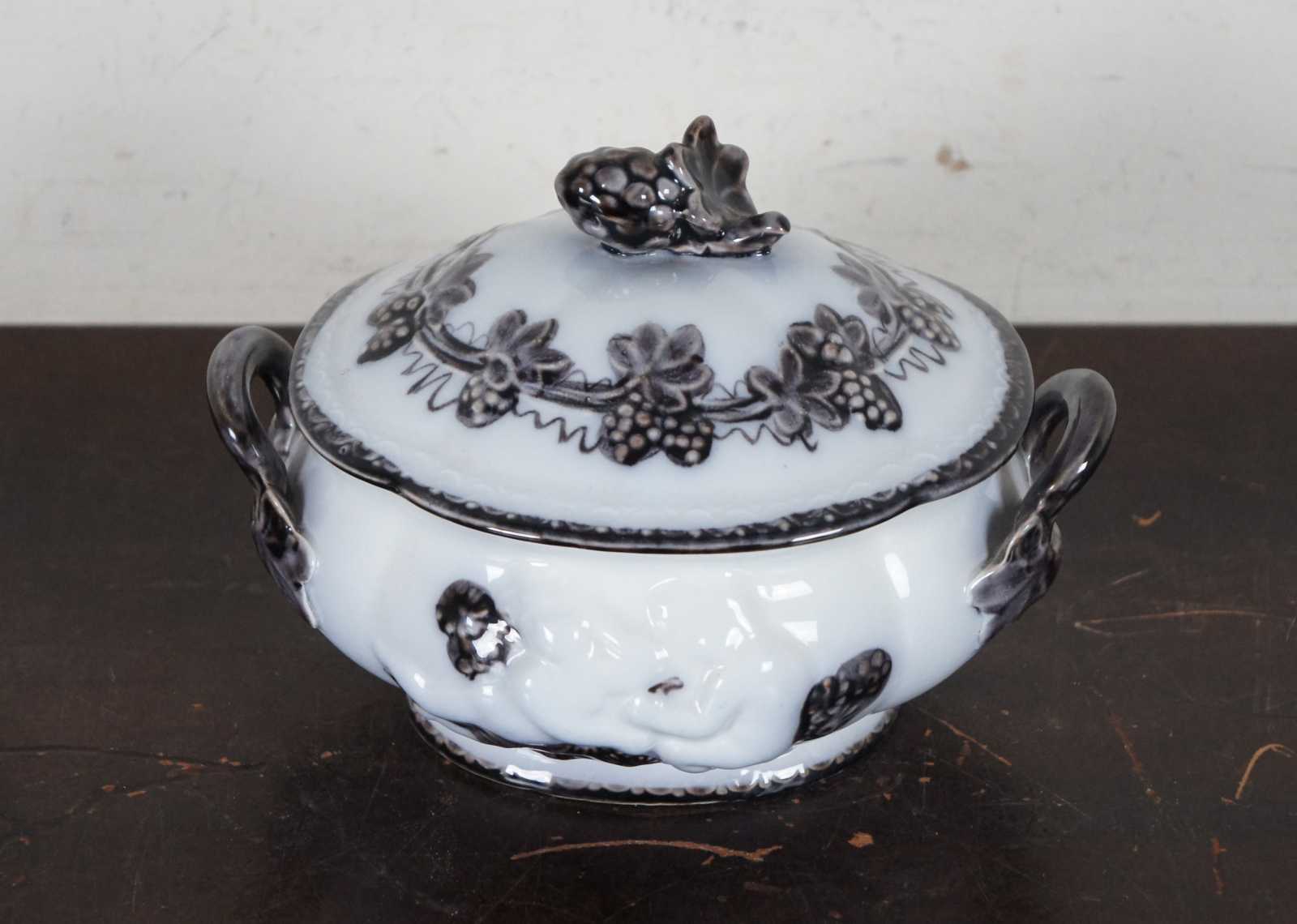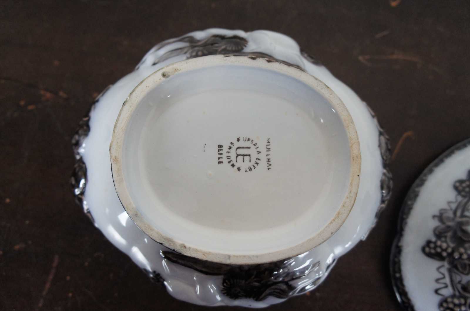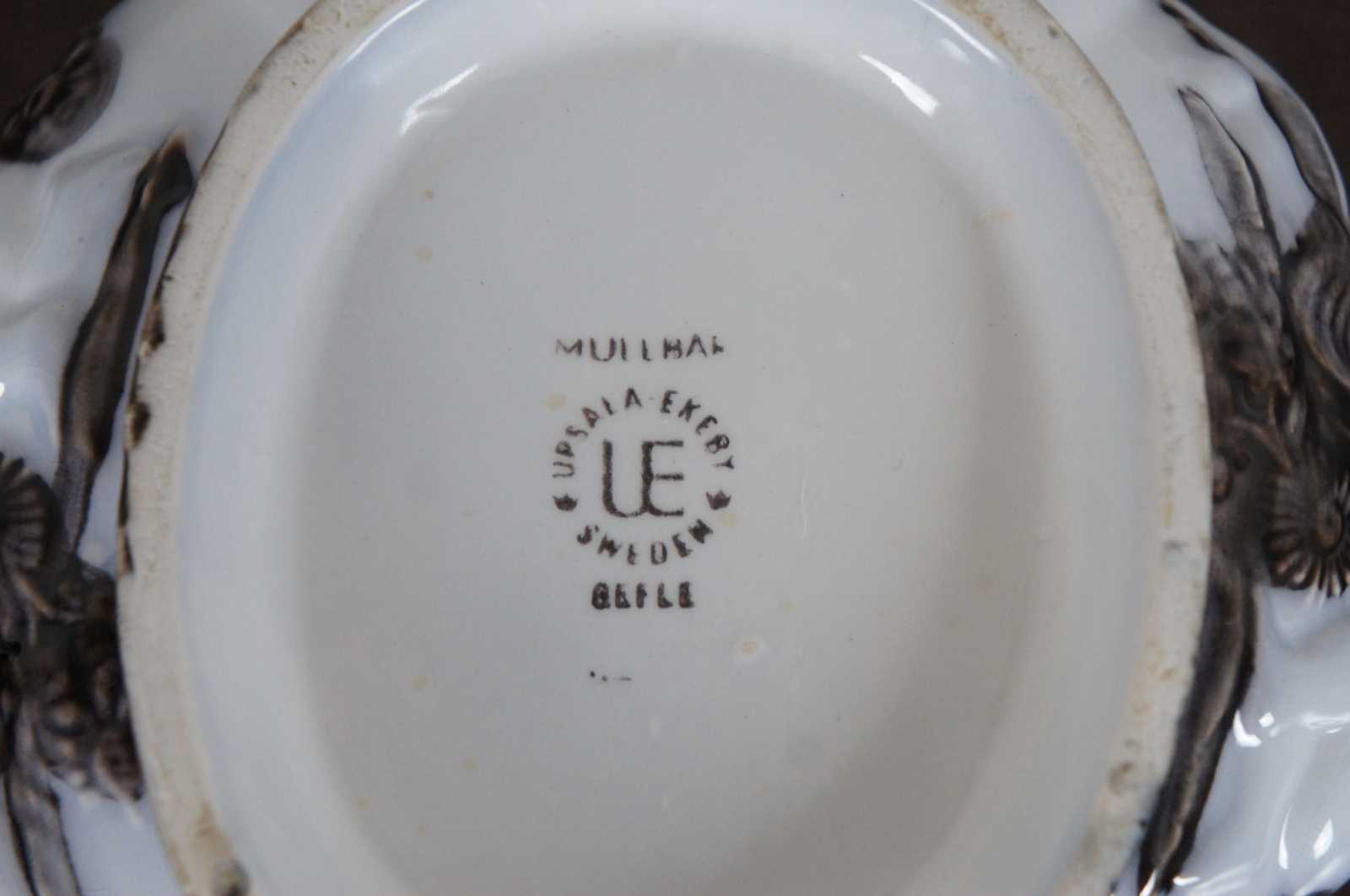 Vintage Upsala Ekeby Gefle Mullbar patterned porcelain dish showing pairs of cherubs surrounded by a design of black mulberries and vines. Sweden.