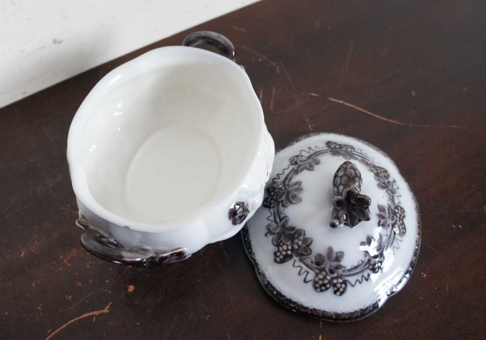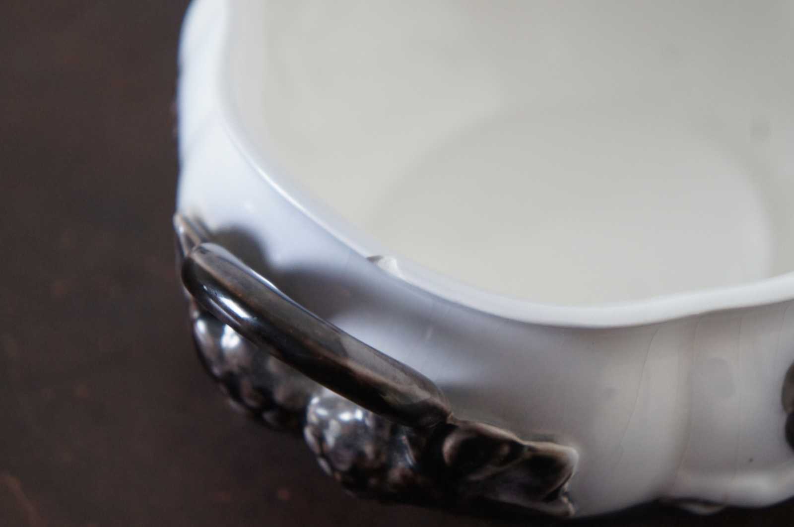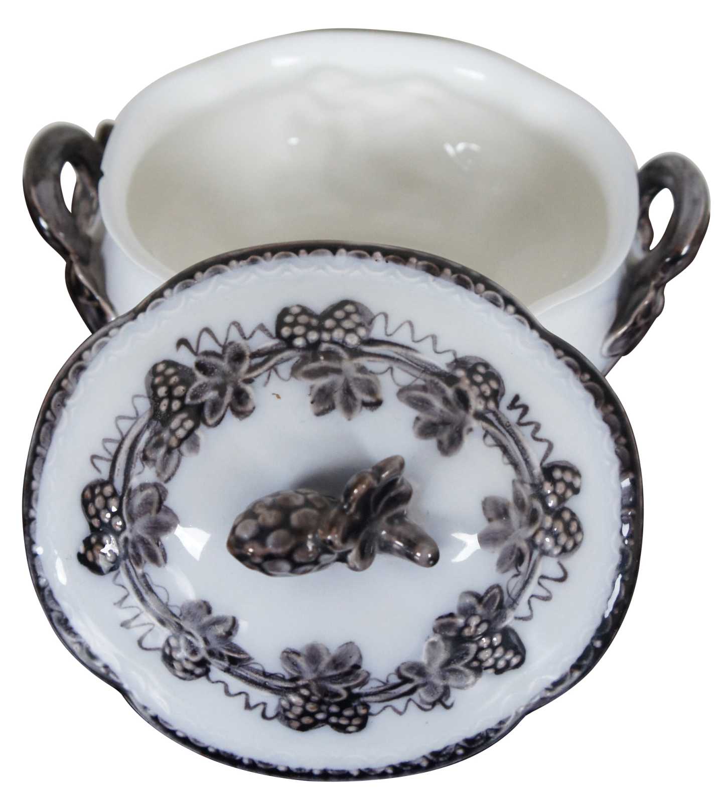 Vintage Upsala Ekeby Gefle Mullbar patterned porcelain dish showing pairs of cherubs surrounded by a design of black mulberries and vines. Sweden.