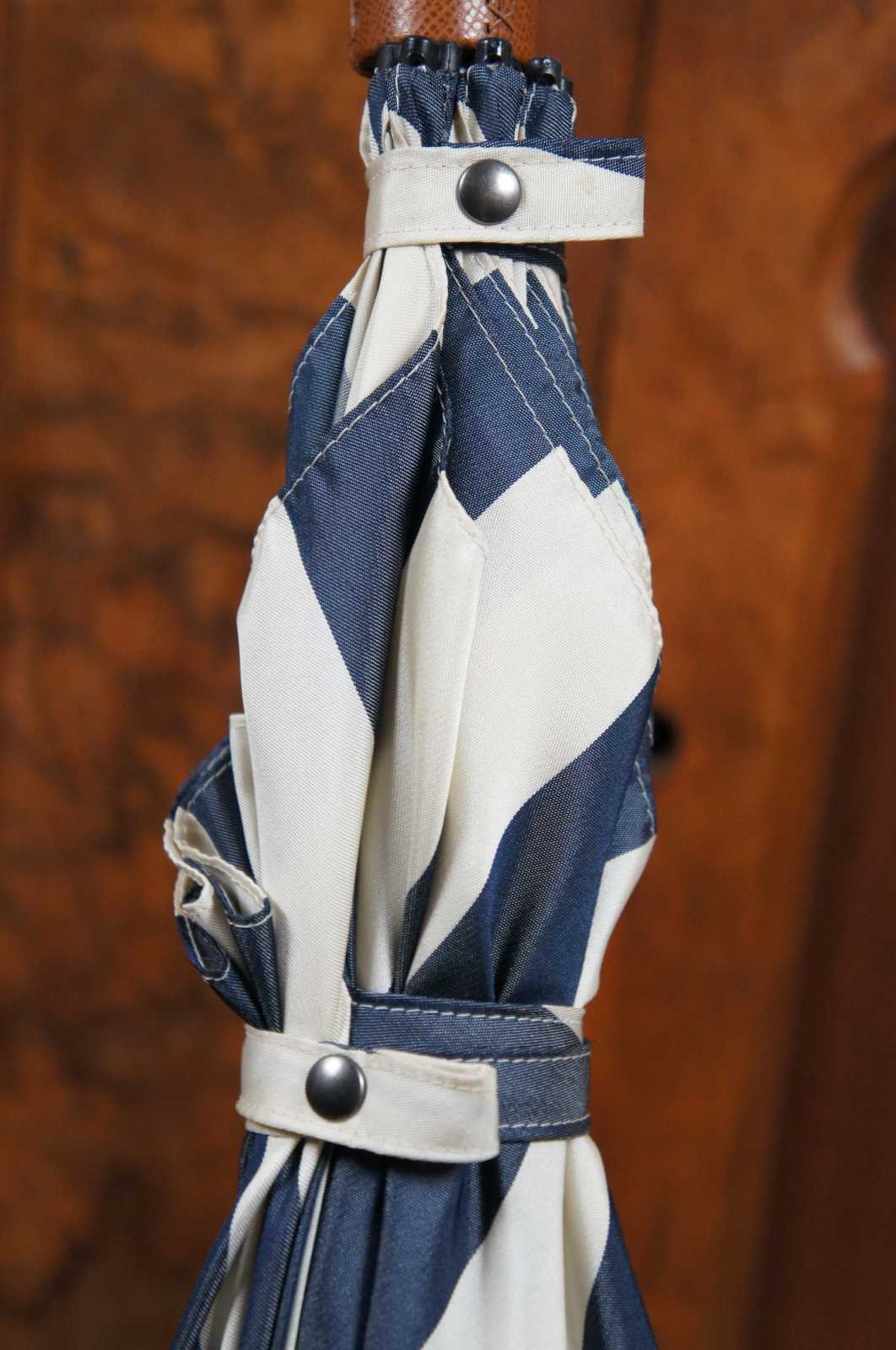 Vintage Luigi Borrelli blue and white chevron patterned umbrella with brown leather handle. Made in Italy.