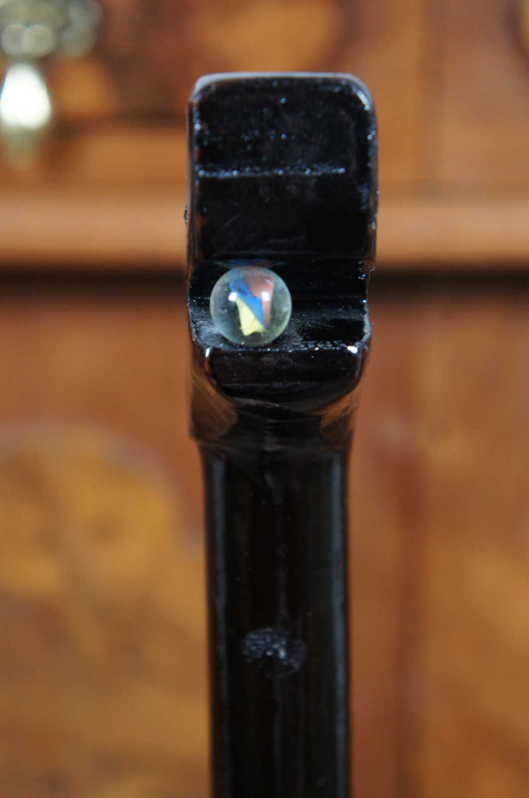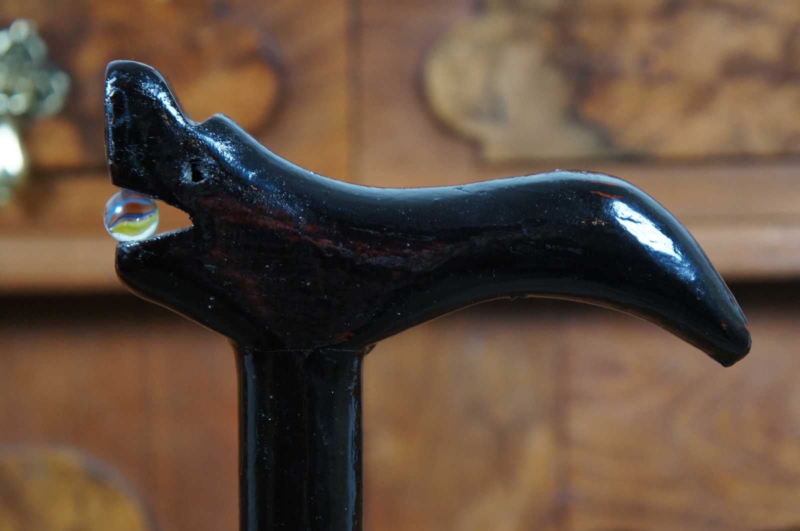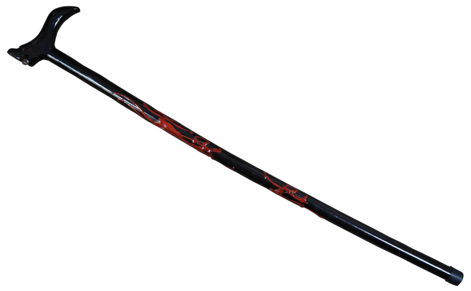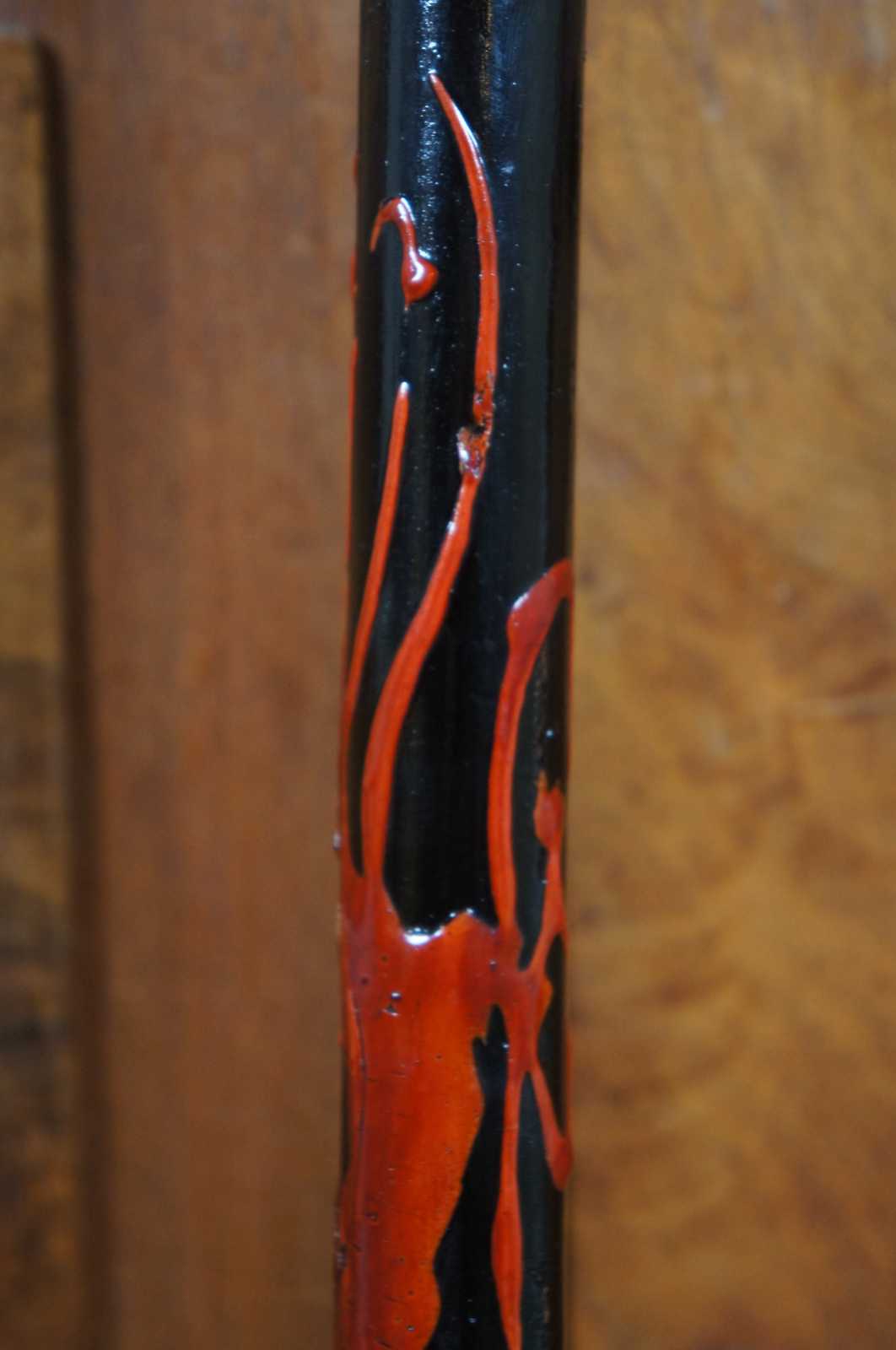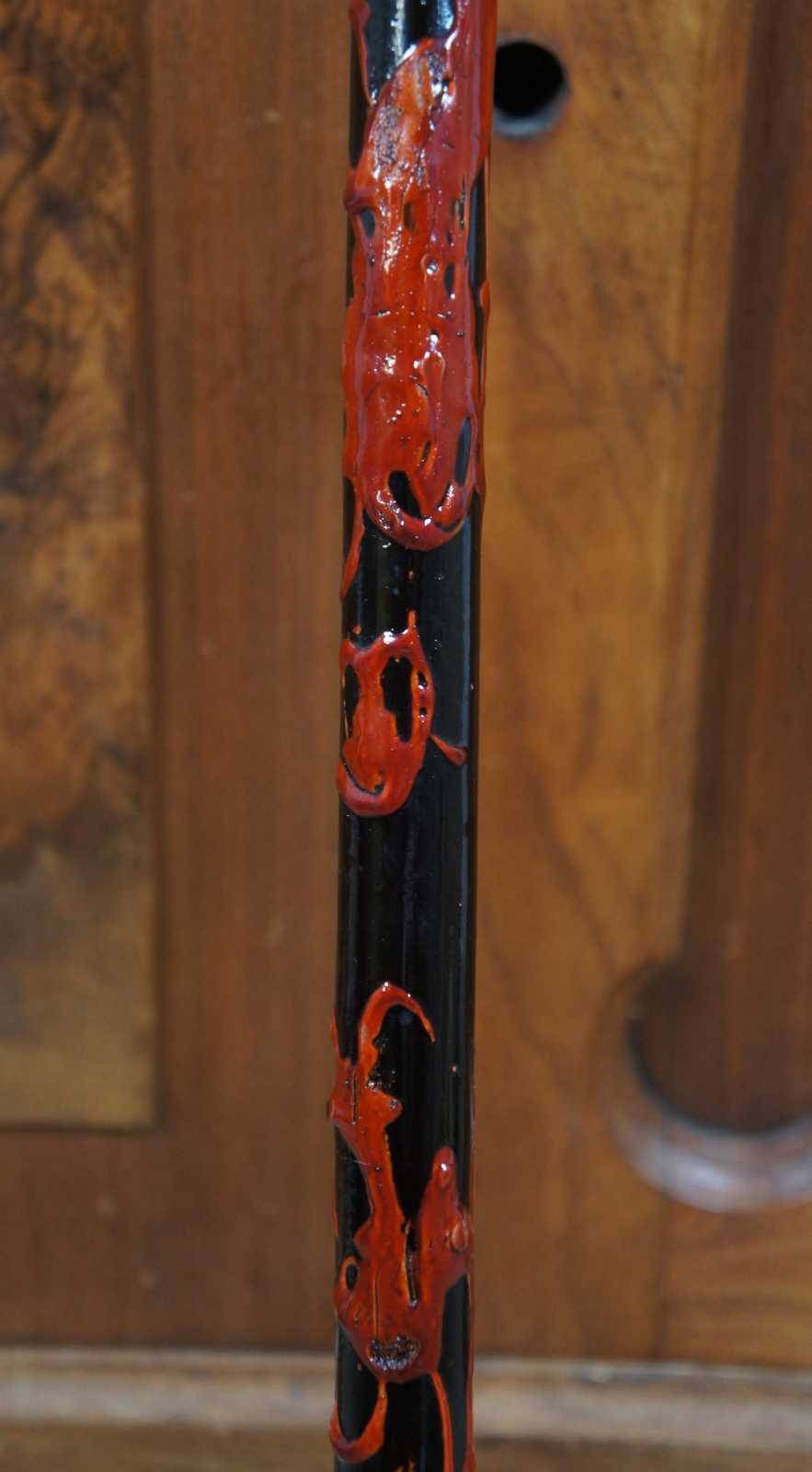 Vintage black lacquer walking stick with red lacquer splashes, with a handle carved with the face of an animal or dragon clutching a marble in its mouth.
