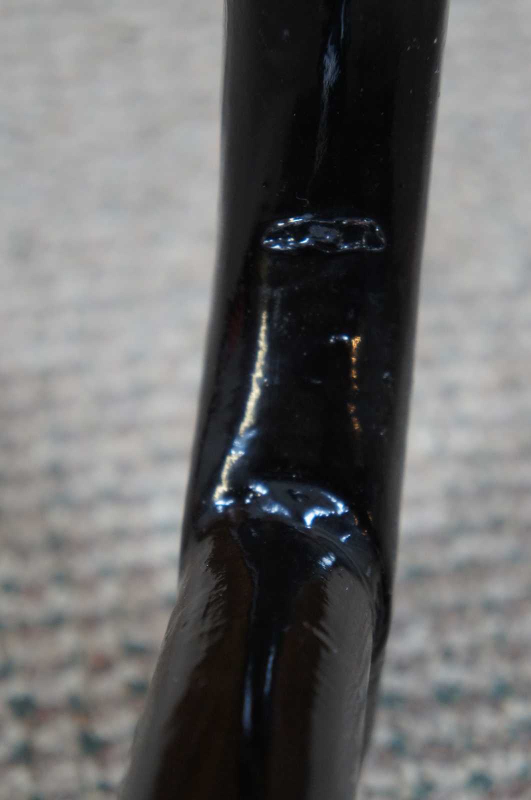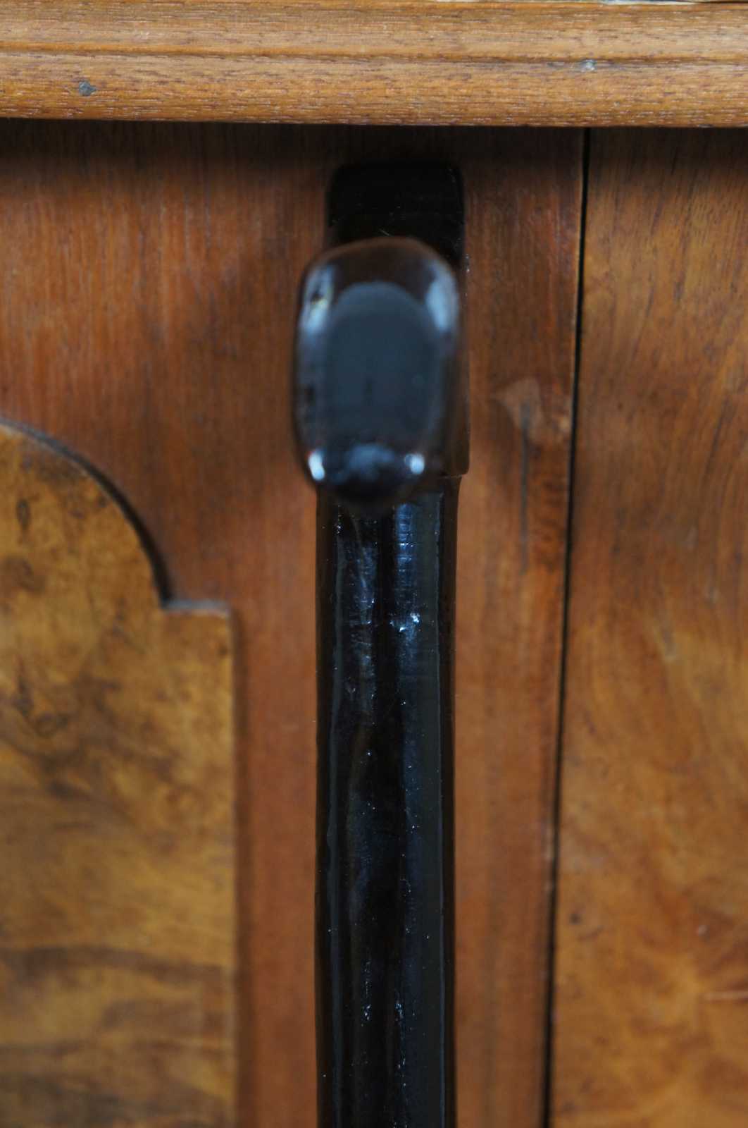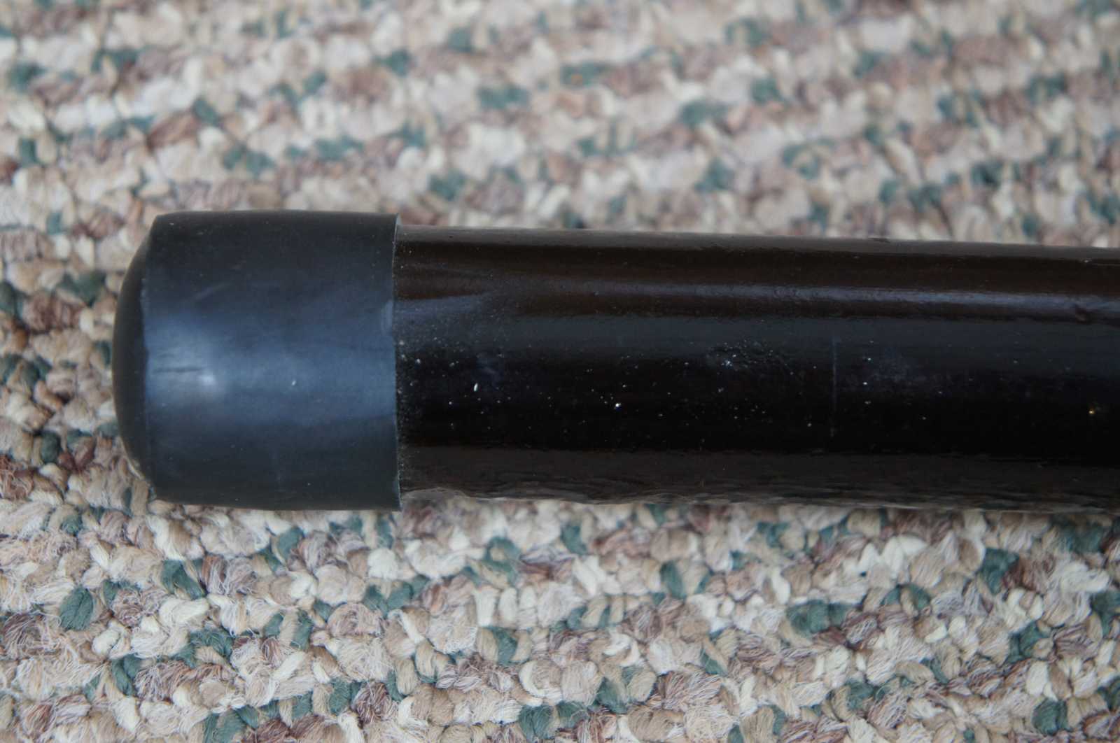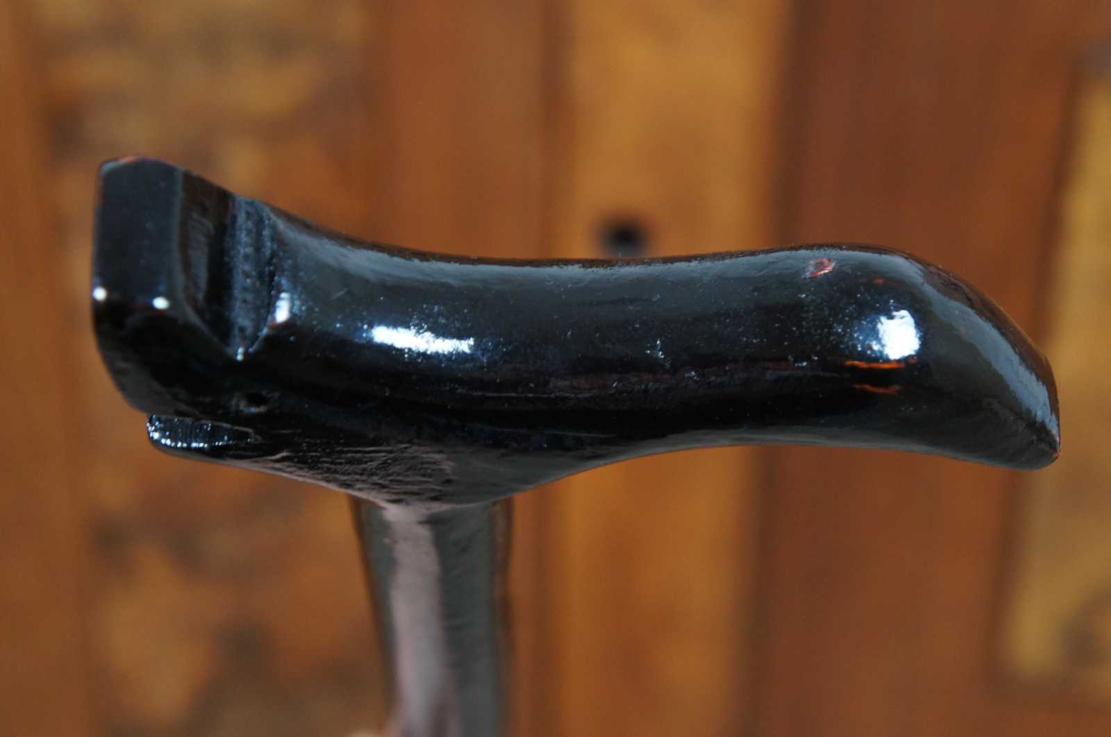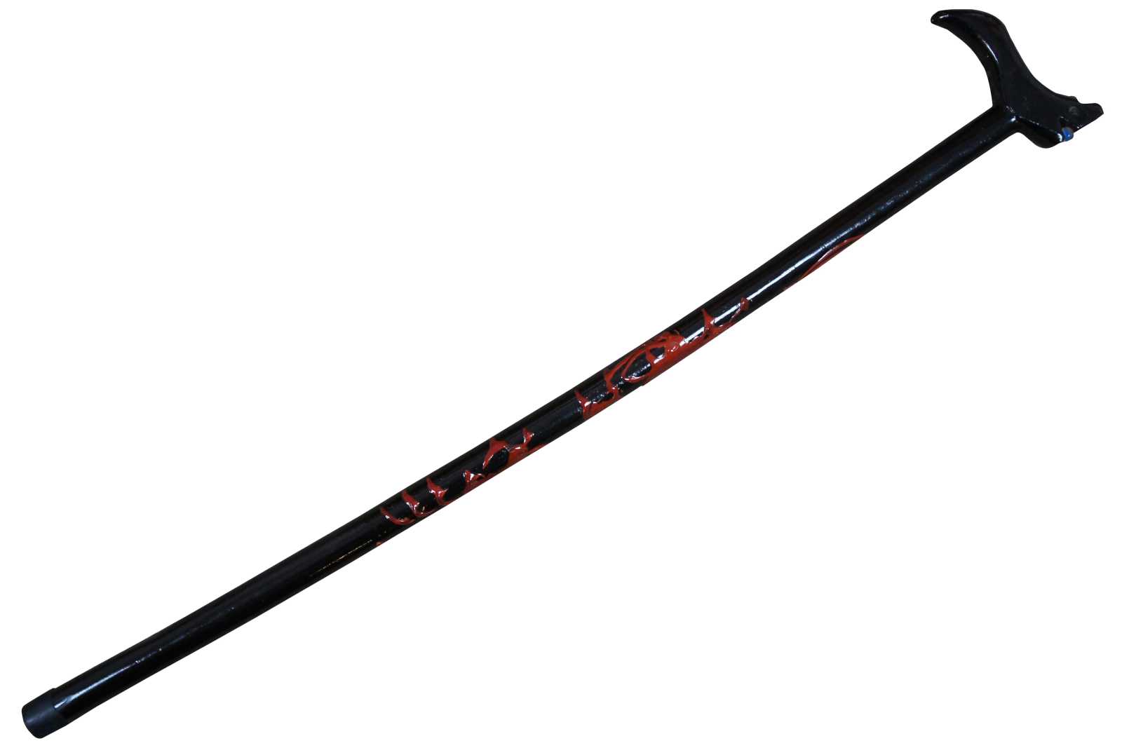 Vintage black lacquer walking stick with red lacquer splashes, with a handle carved with the face of an animal or dragon clutching a marble in its mouth.