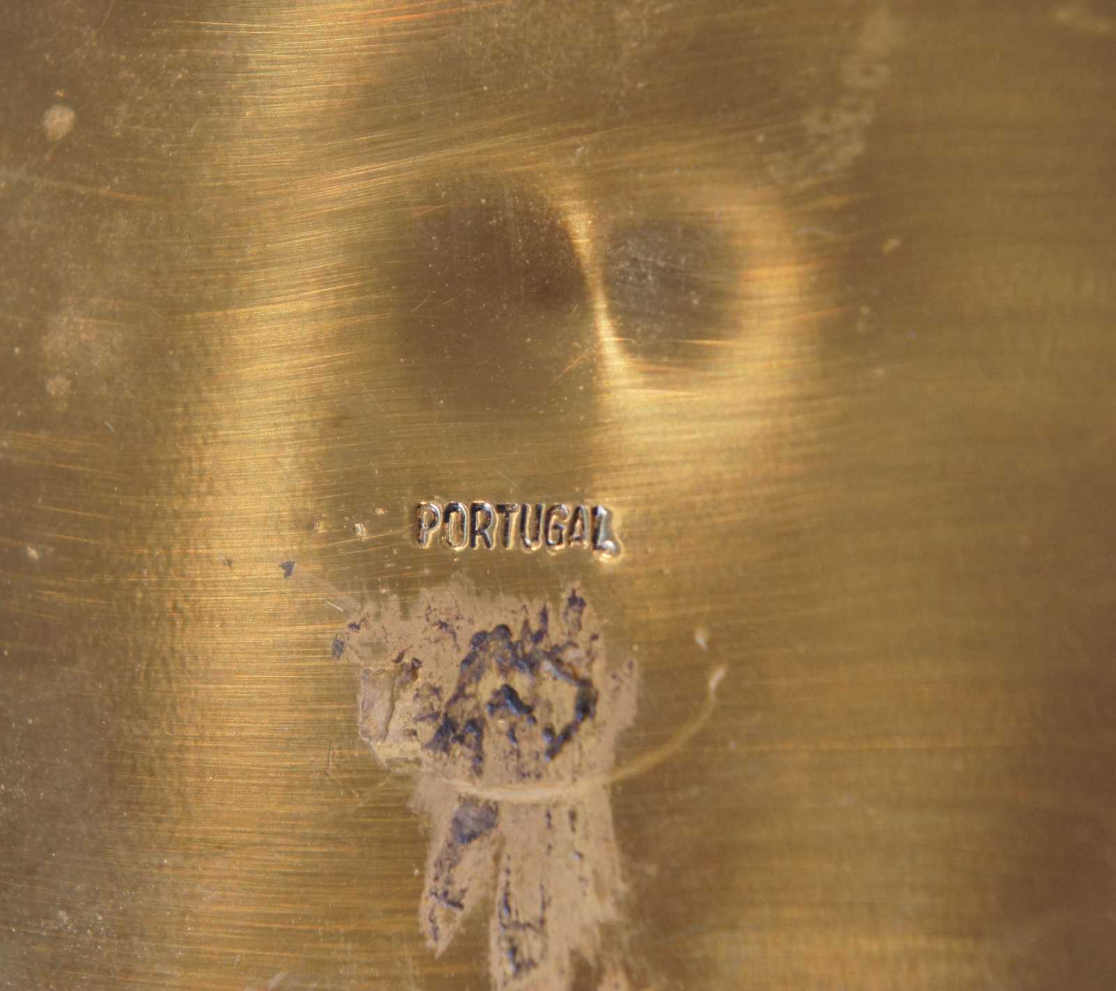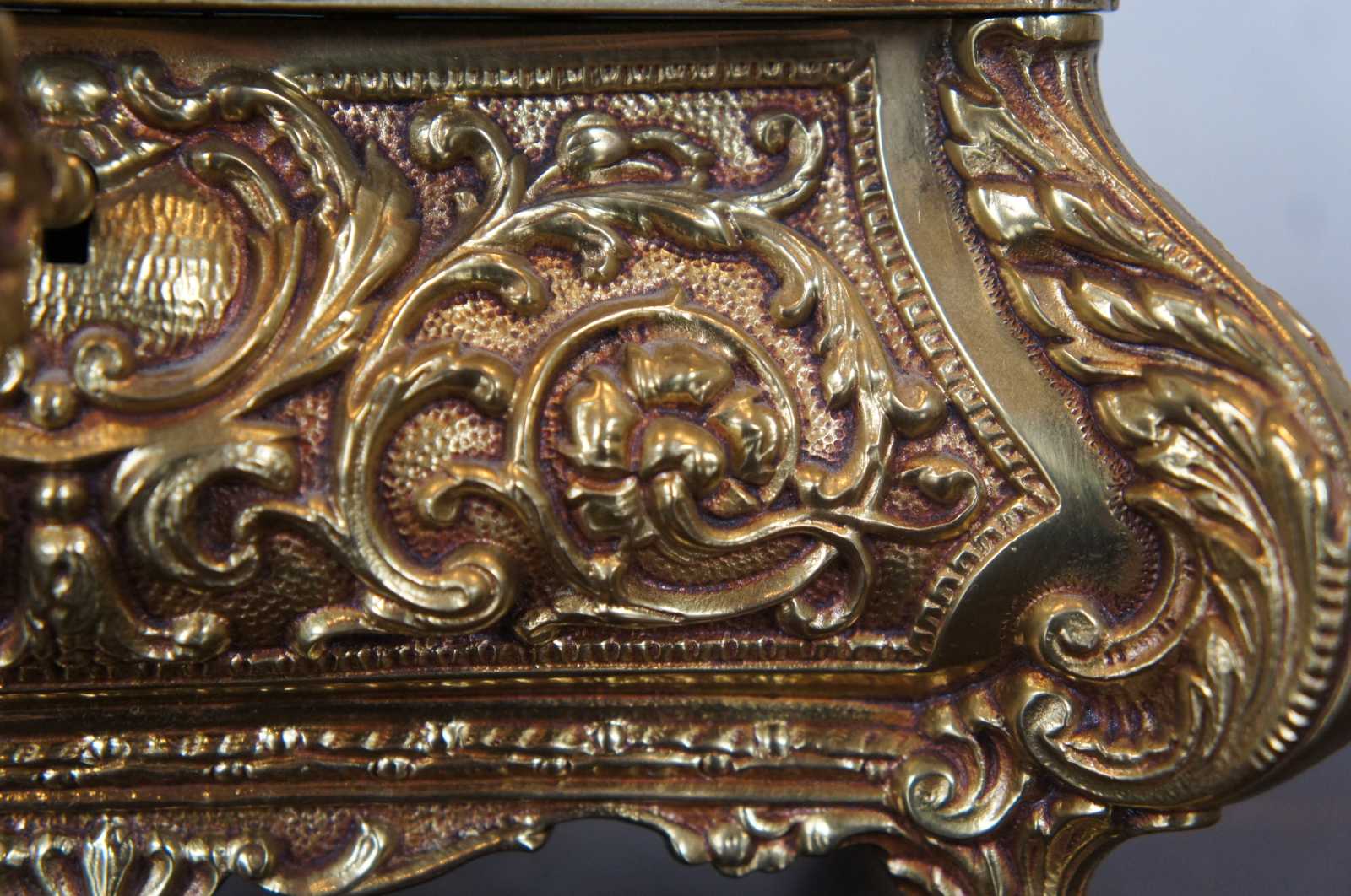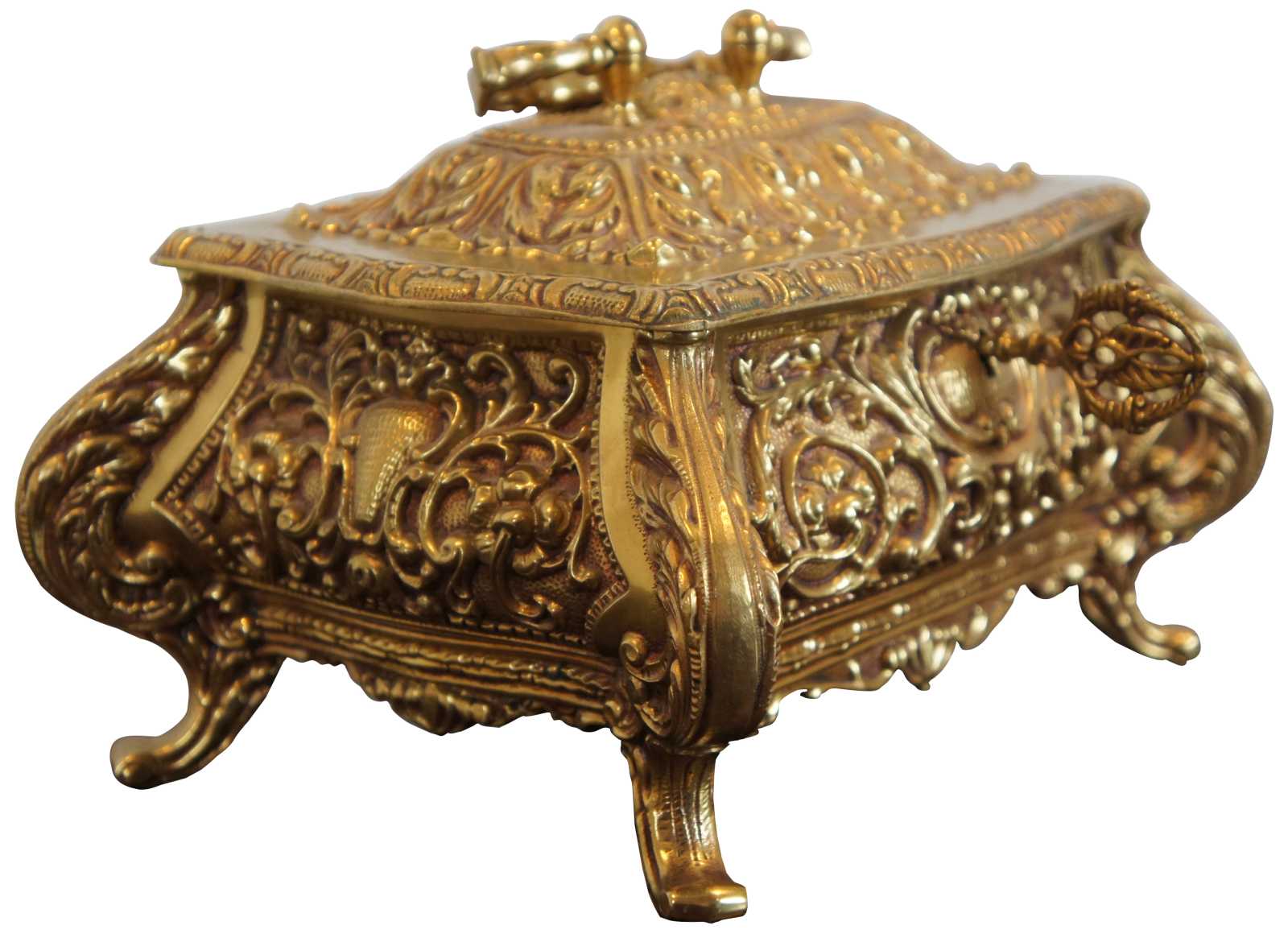 First half of the 20th century jewelry casket, ornately patterned baroque style with rotating handle, red velvet lining, and functional lock with key; made in Portugal.