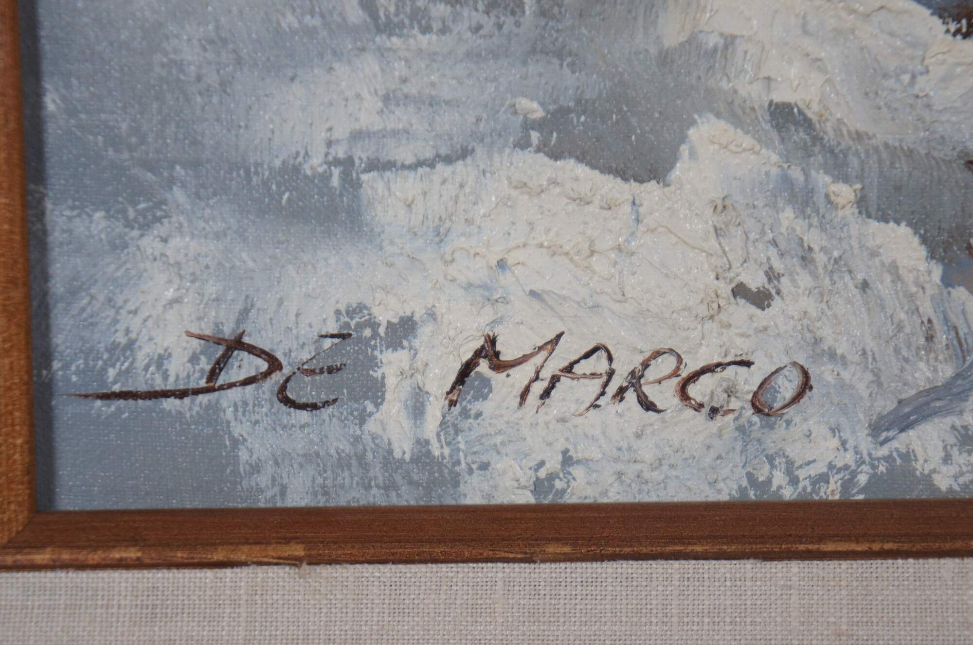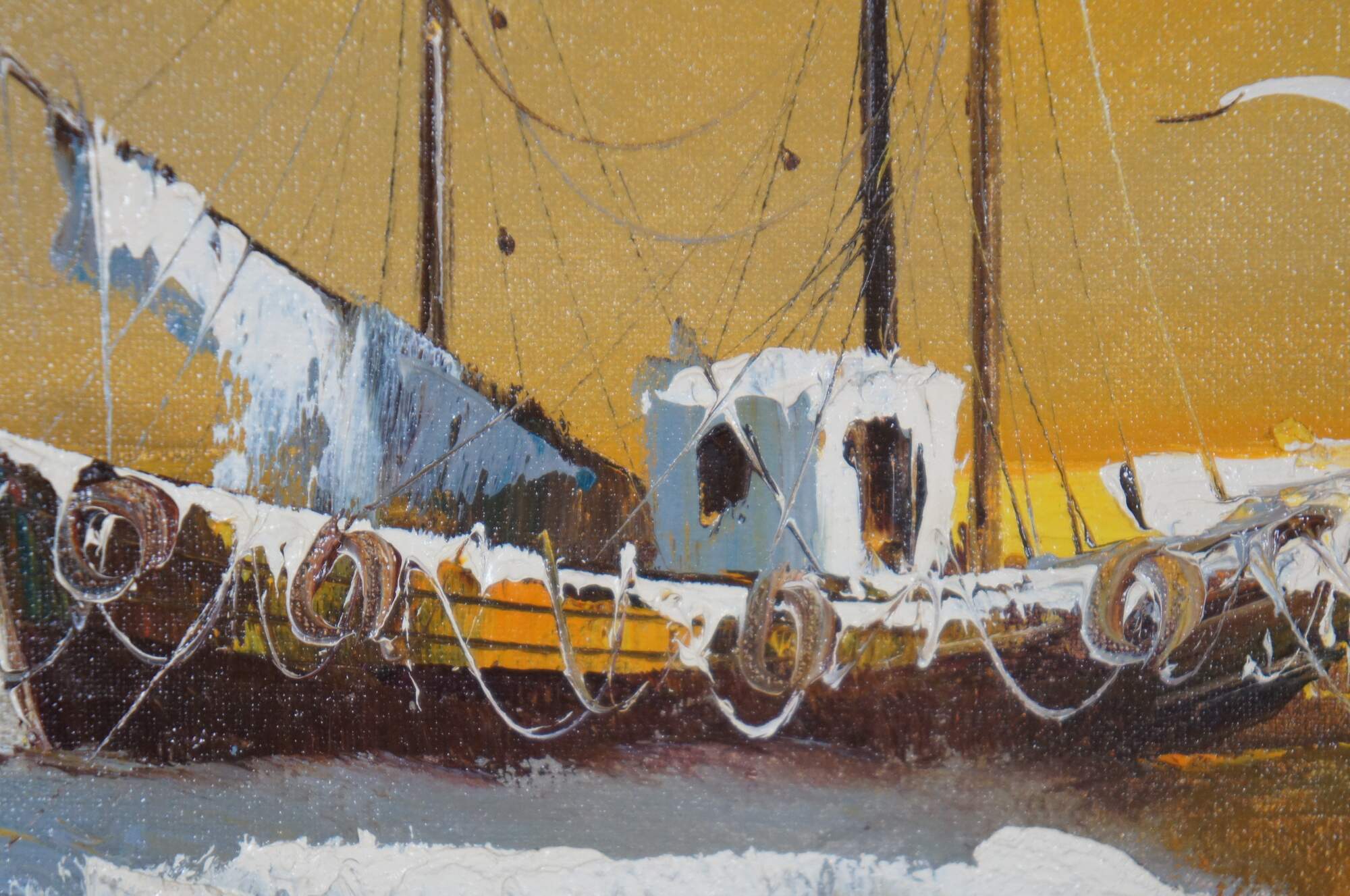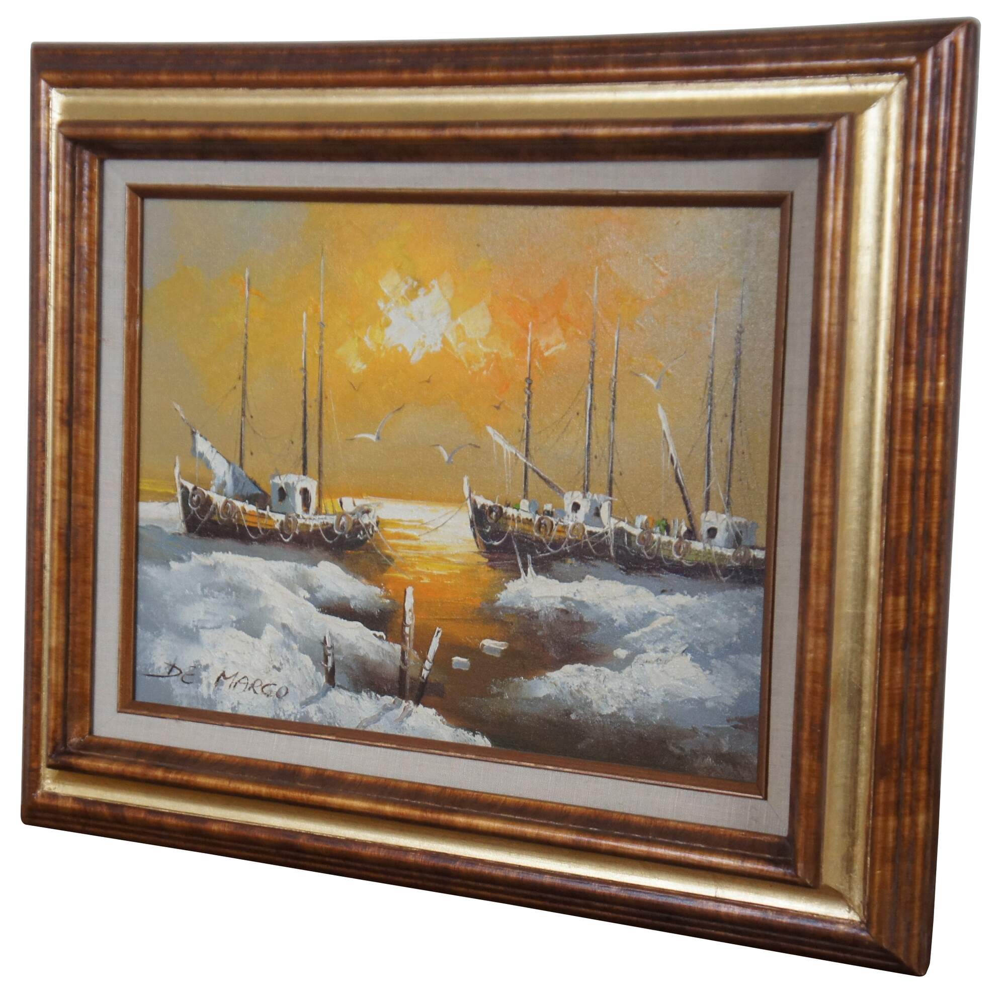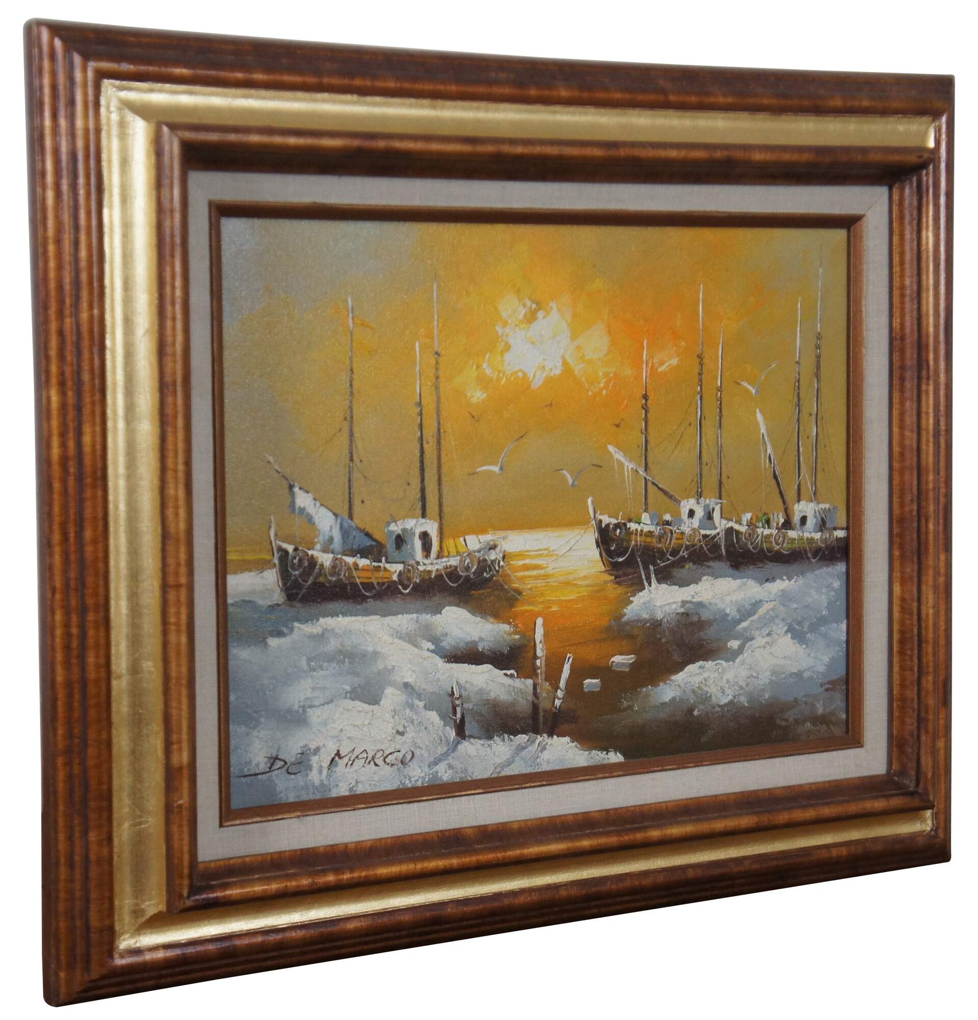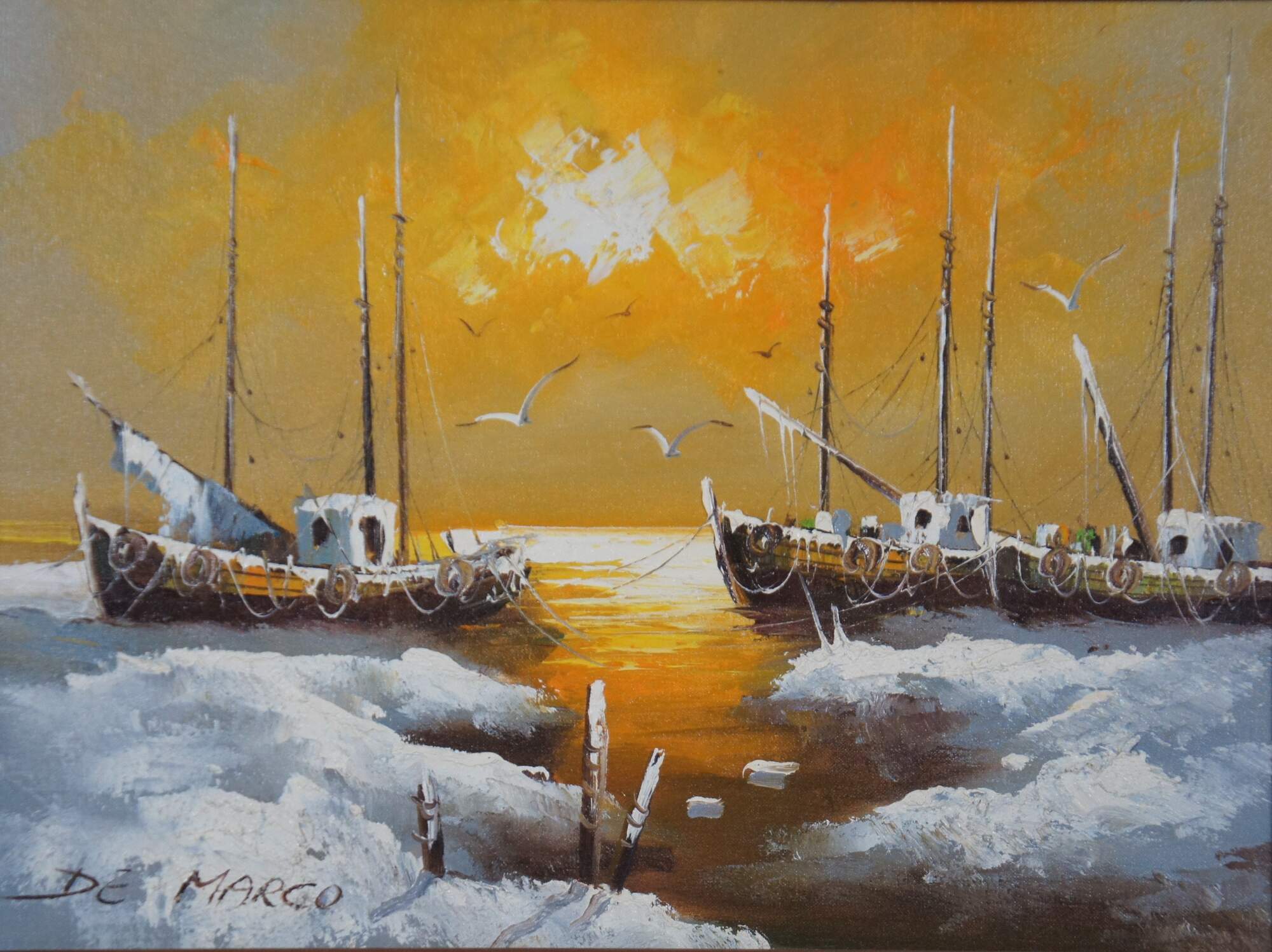 Vintage oil on canvas painting of three fishing boats floating in a bay / harbor with snow on the water, under a golden sunset. Signed De Marco / Demarco.